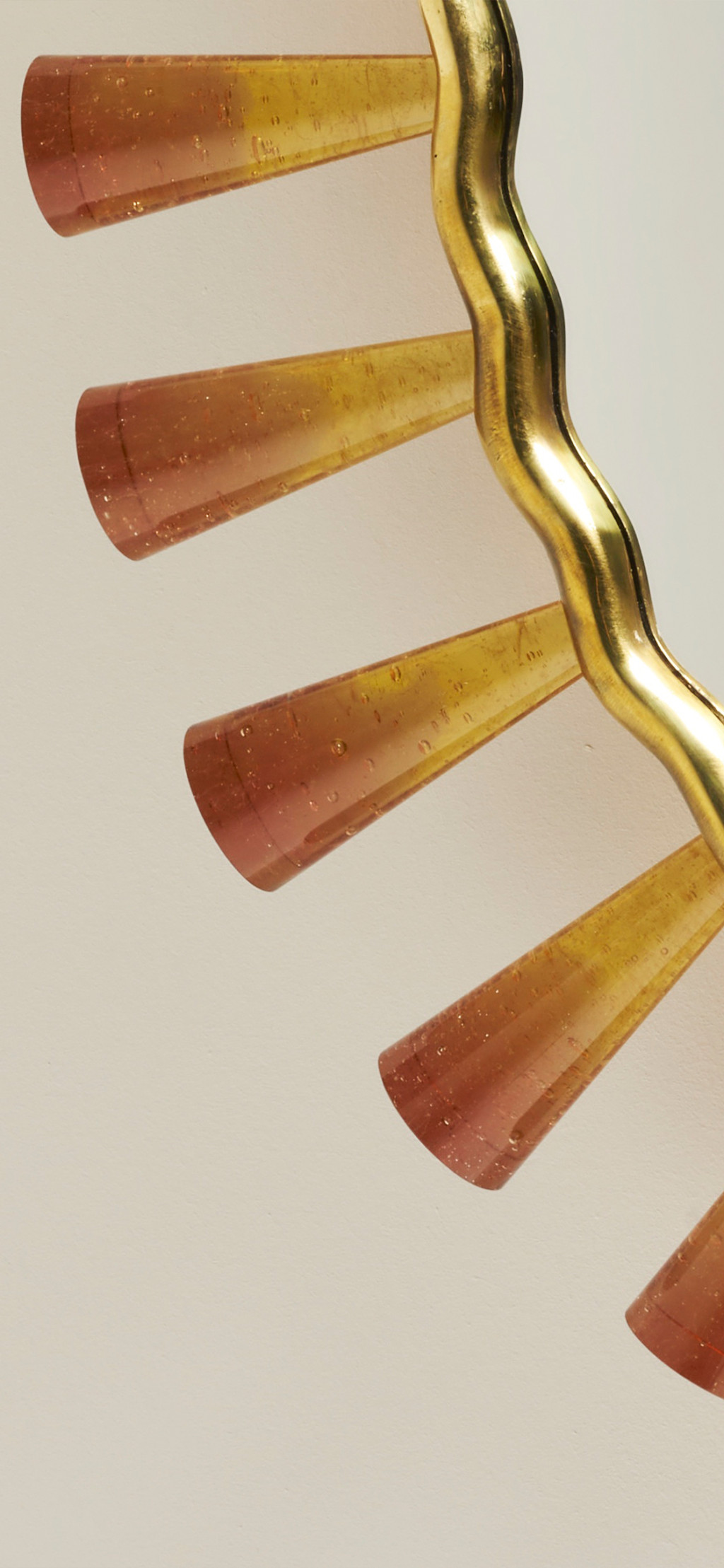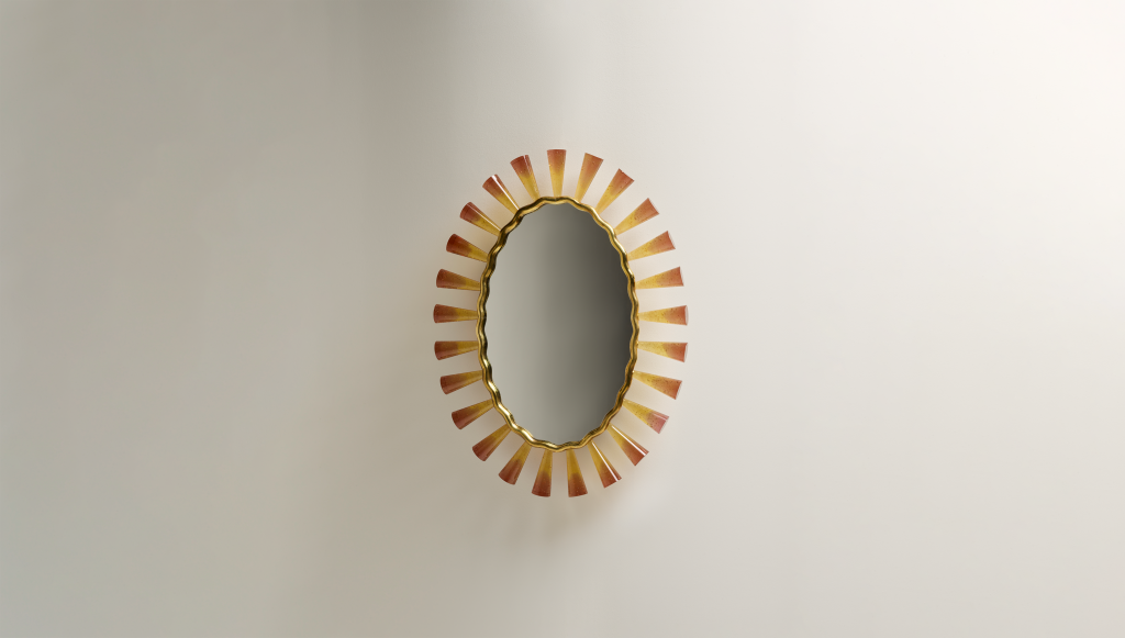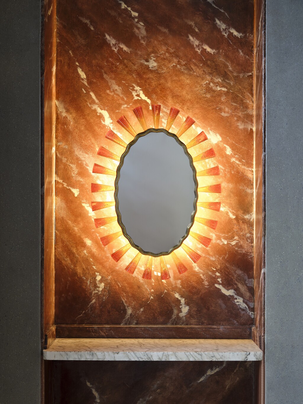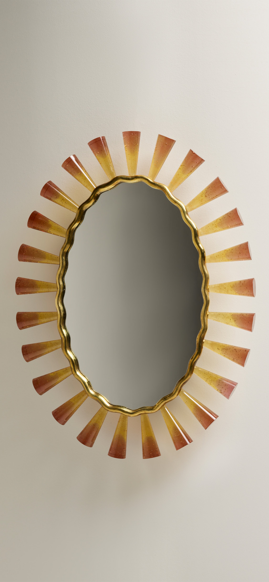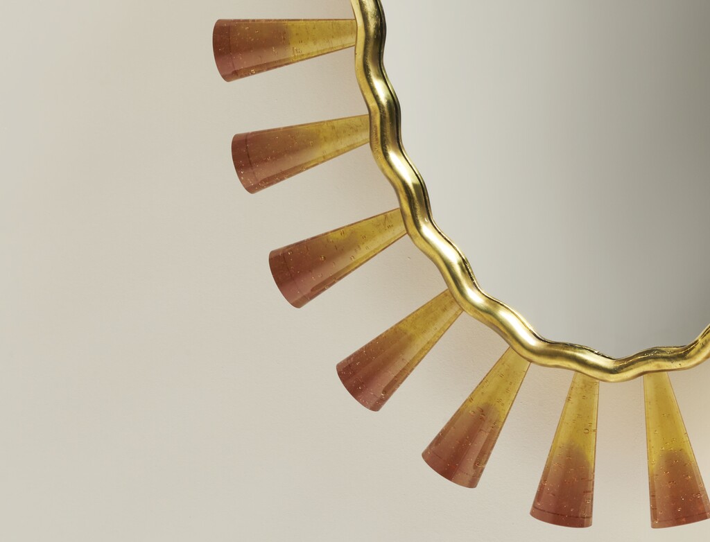 CAST BRASS MIRROR WITH ILLUMINATED CAST GLASS ELEMENTS.
