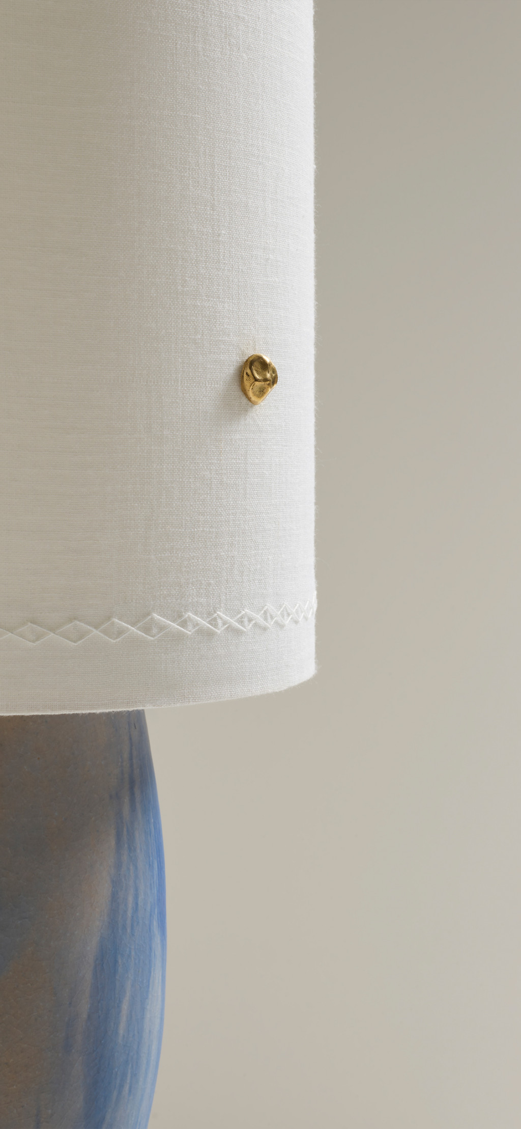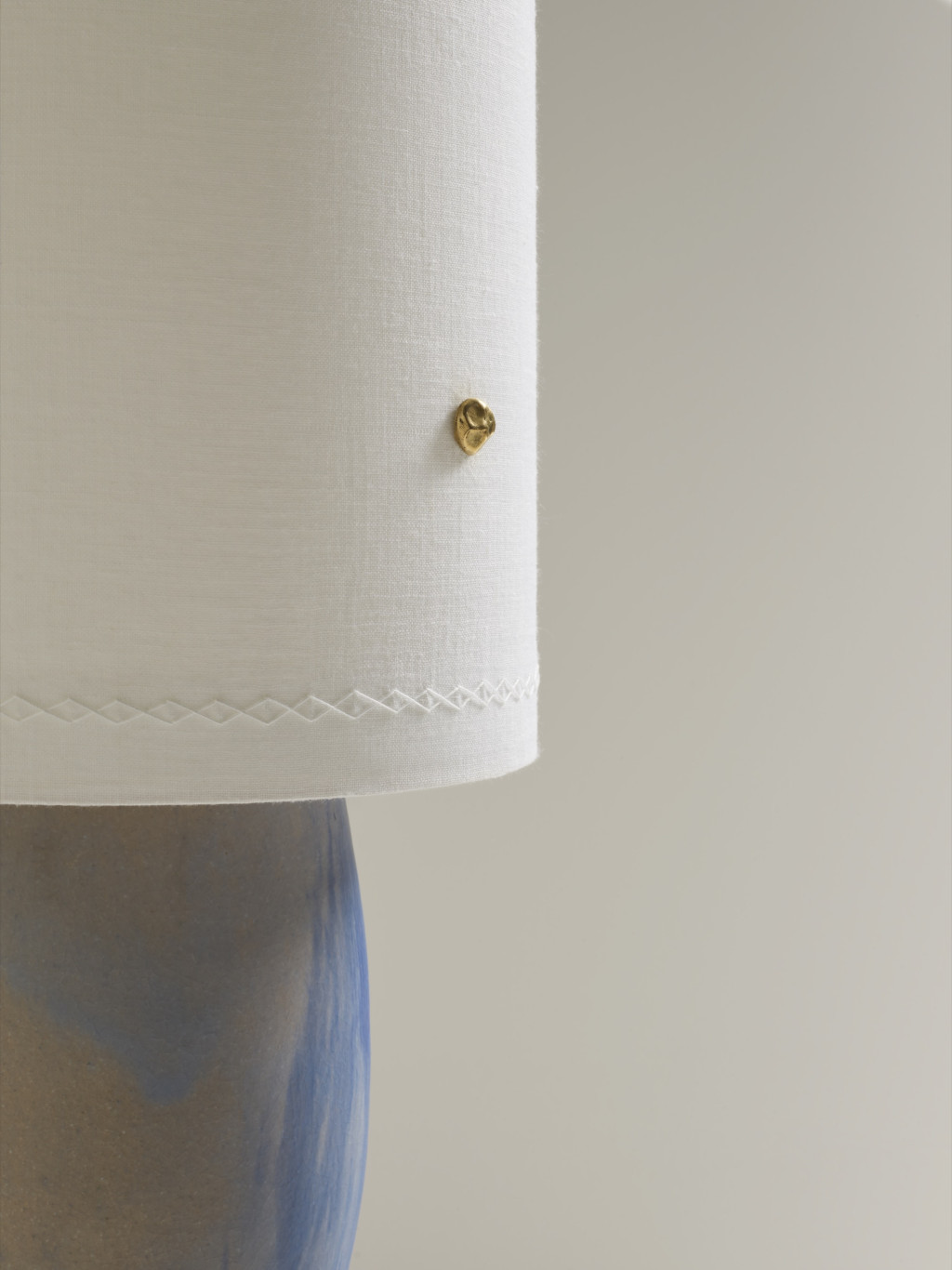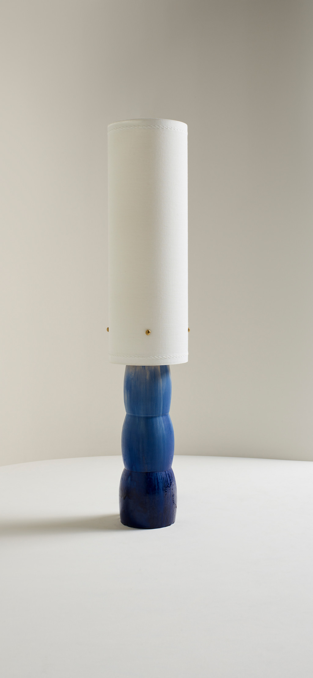 HAND-FORMED CERAMIC FLOOR LIGHT WITH LINEN SHADE AND CAST BRASS FINIALS, CERAMIC BASE WITH HAND-BRUSHED-ON GLAZE.