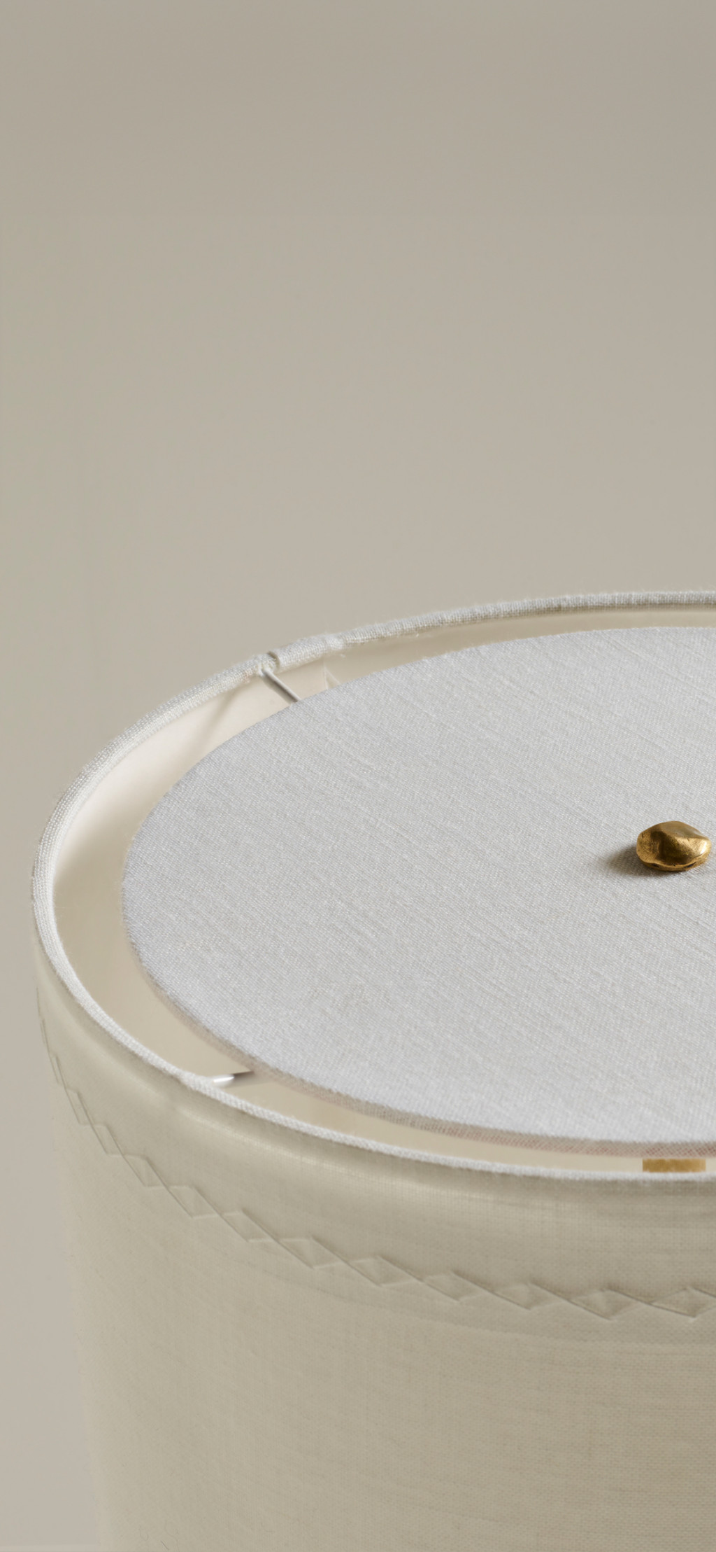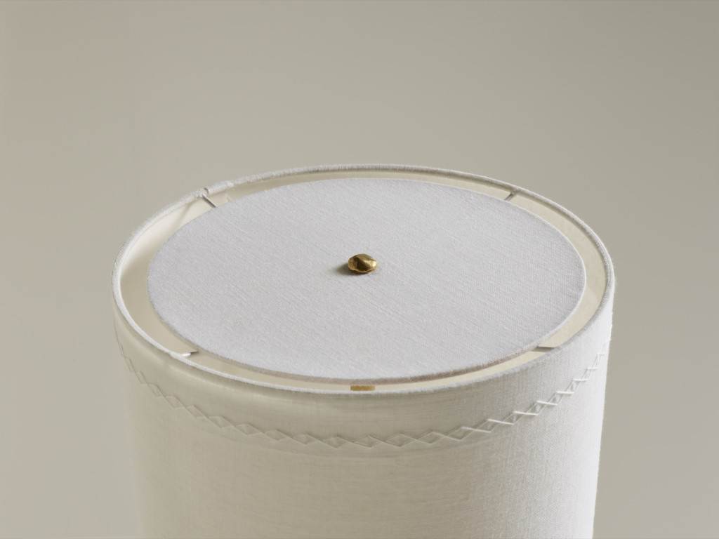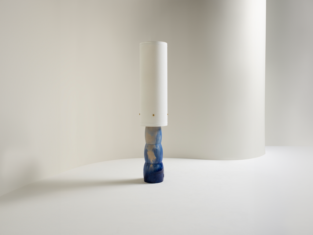HAND-FORMED CERAMIC FLOOR LIGHT WITH LINEN SHADE AND CAST BRASS FINIALS, CERAMIC BASE WITH HAND-BRUSHED-ON GLAZE.