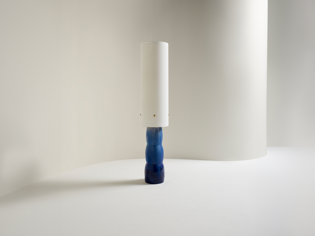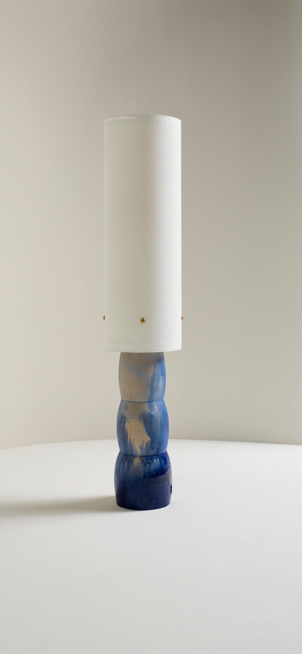 HAND-FORMED CERAMIC FLOOR LIGHT WITH HAND-BRUSHED-ON GLAZE, WITH A LINEN SHADE AND CAST BRASS FINIALS.
