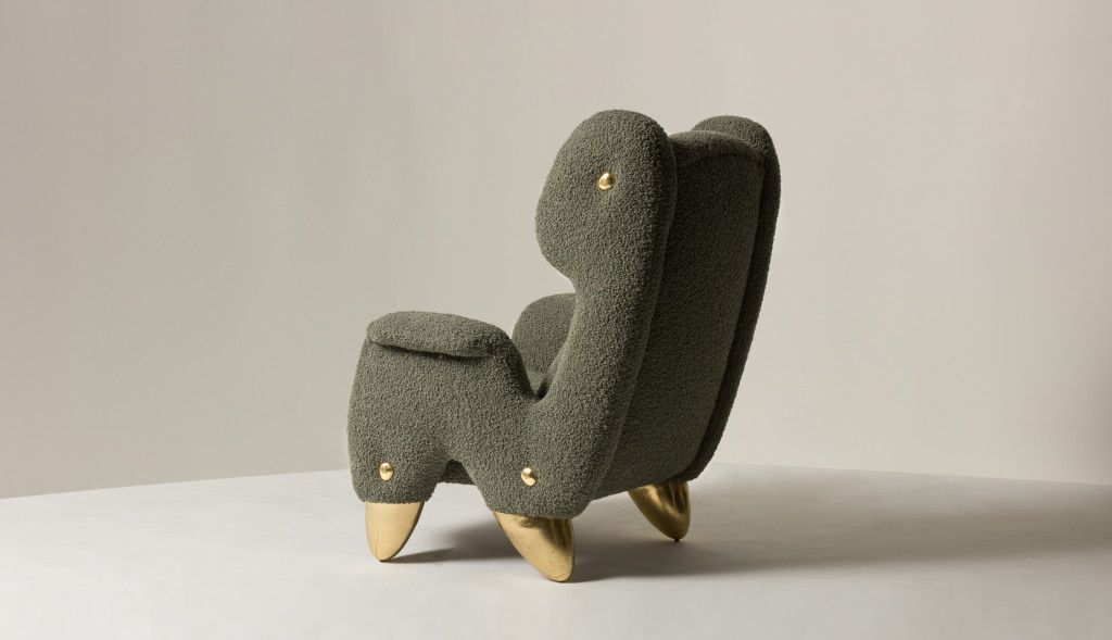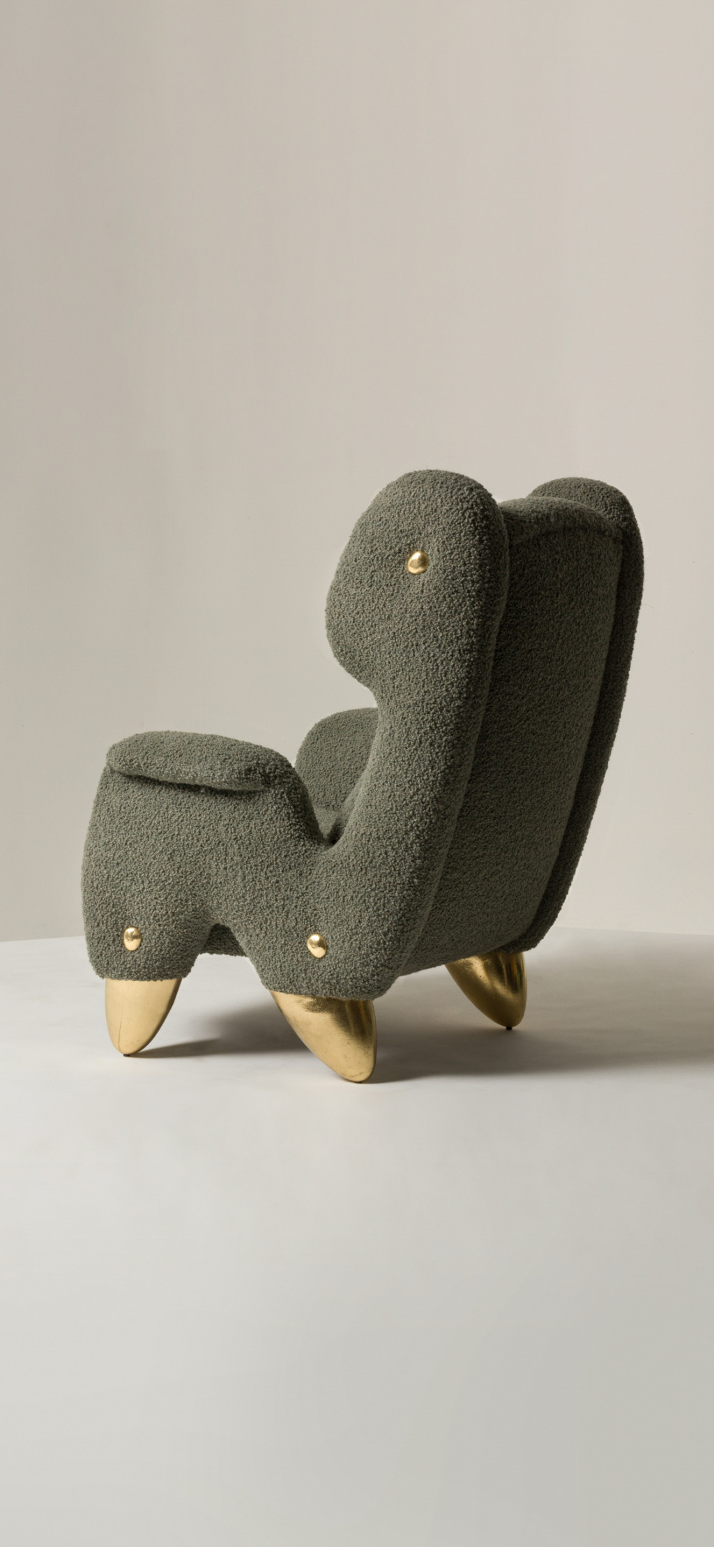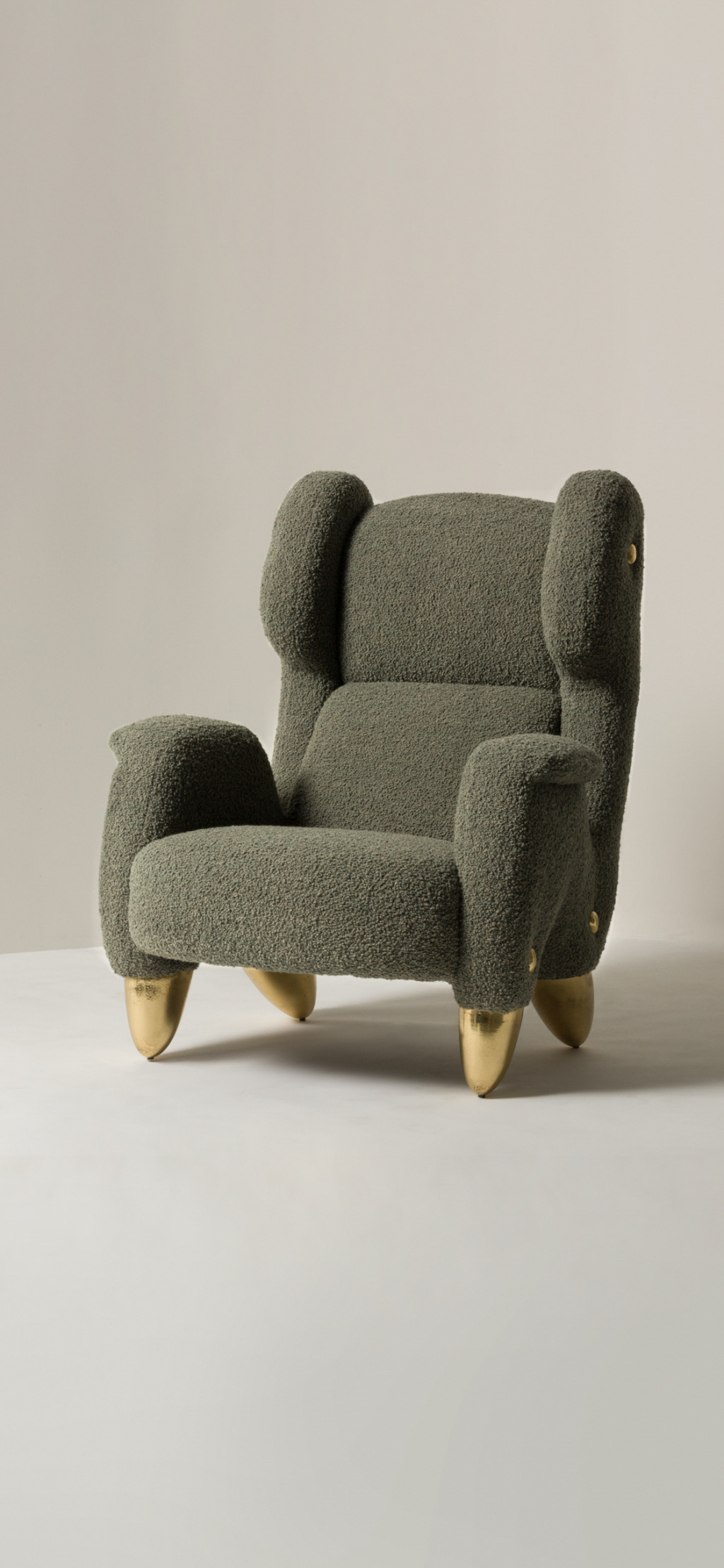 UPHOLSTERED WINGBACK ARMCHAIR WITH CAST BRASS FEET AND BRASS BUTTON DETAILING.