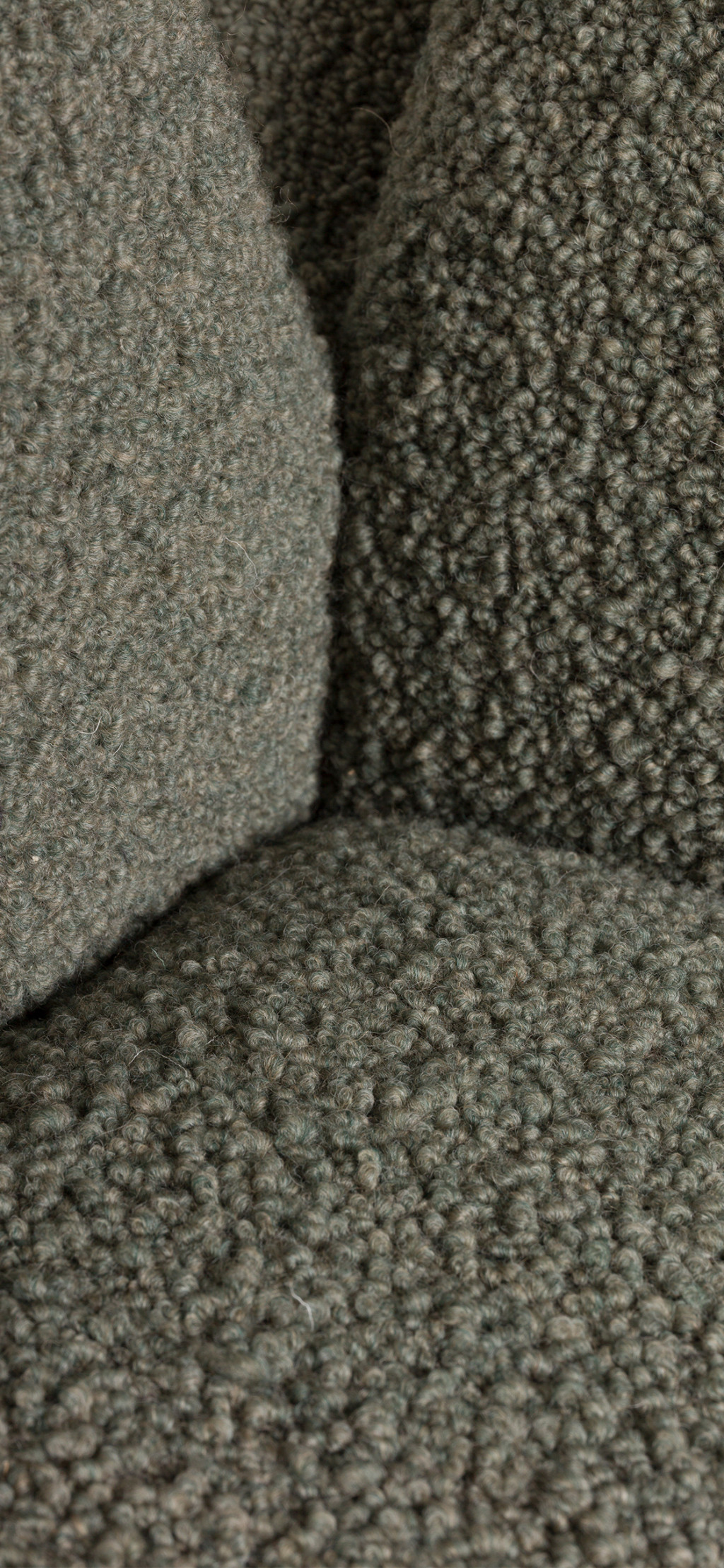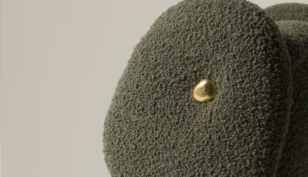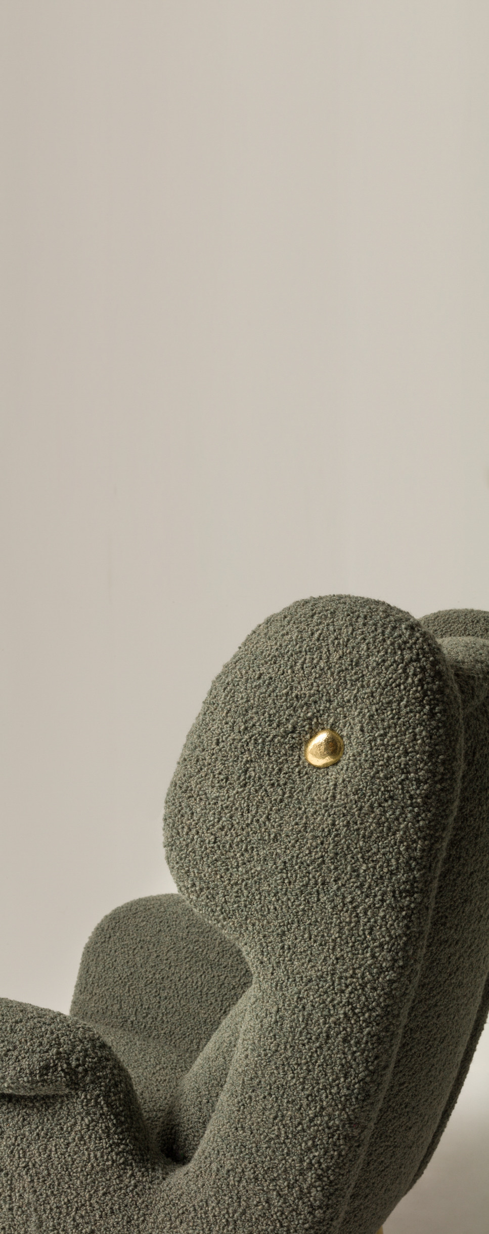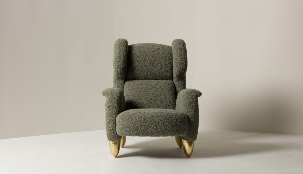 UPHOLSTERED WINGBACK ARMCHAIR WITH CAST BRASS FEET AND BRASS BUTTON DETAILING.