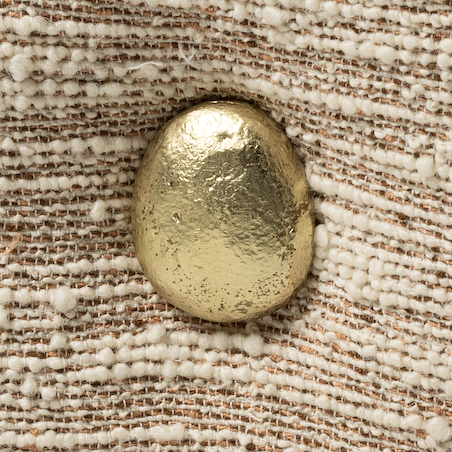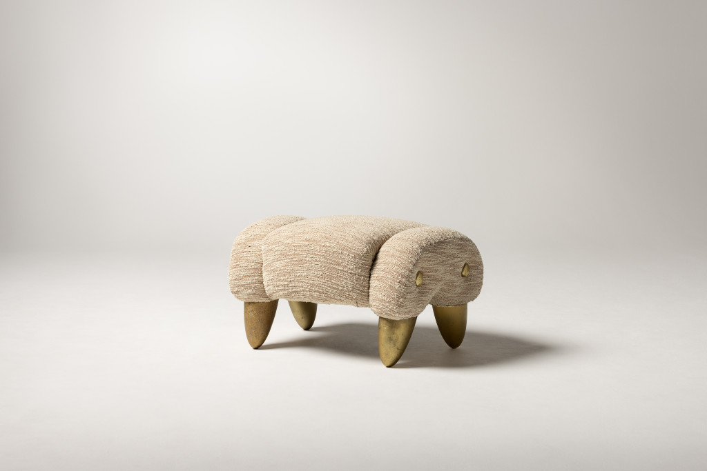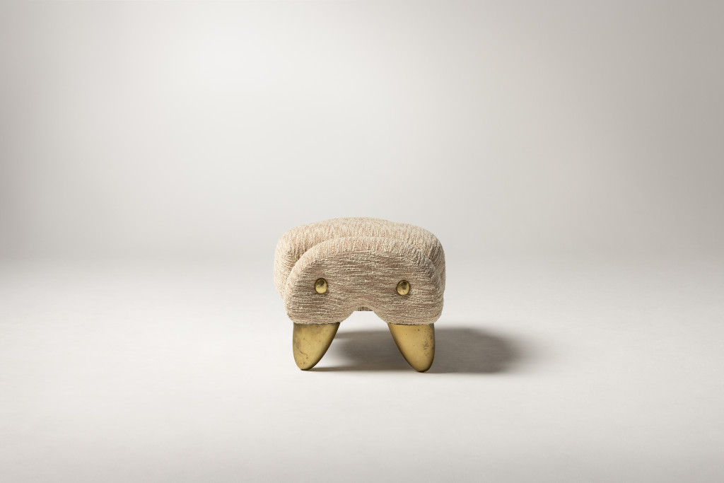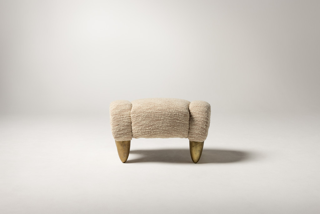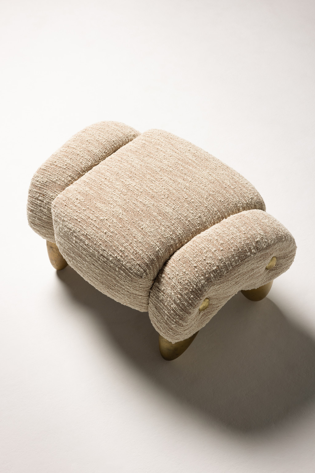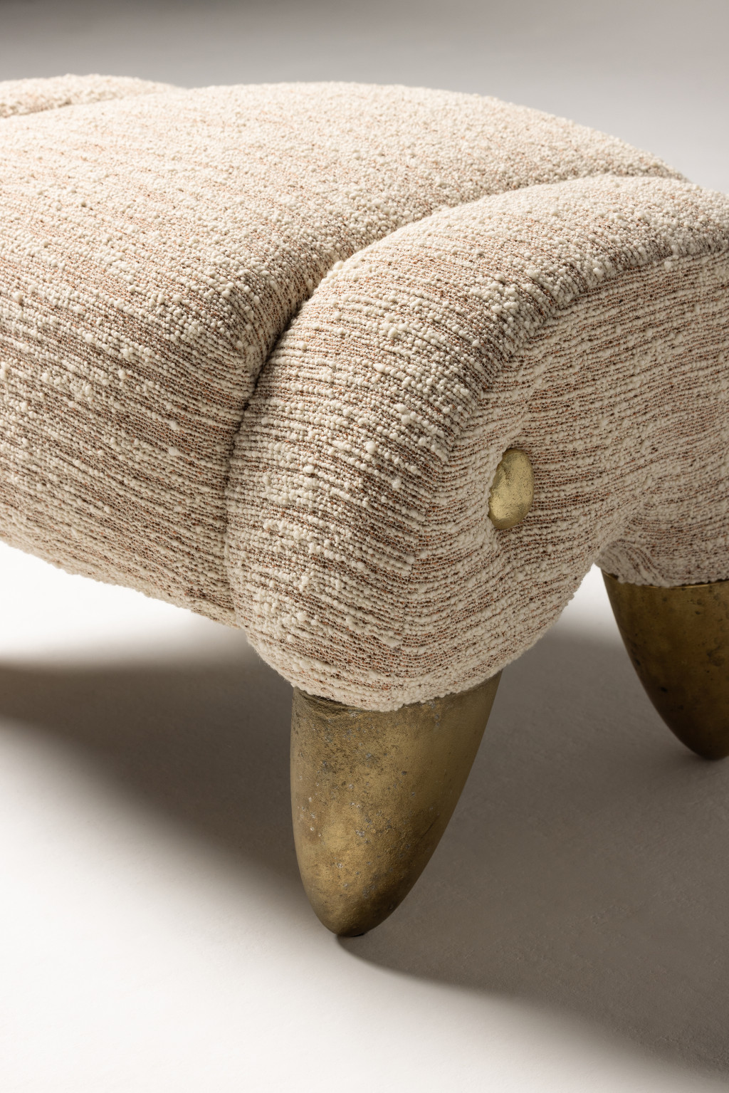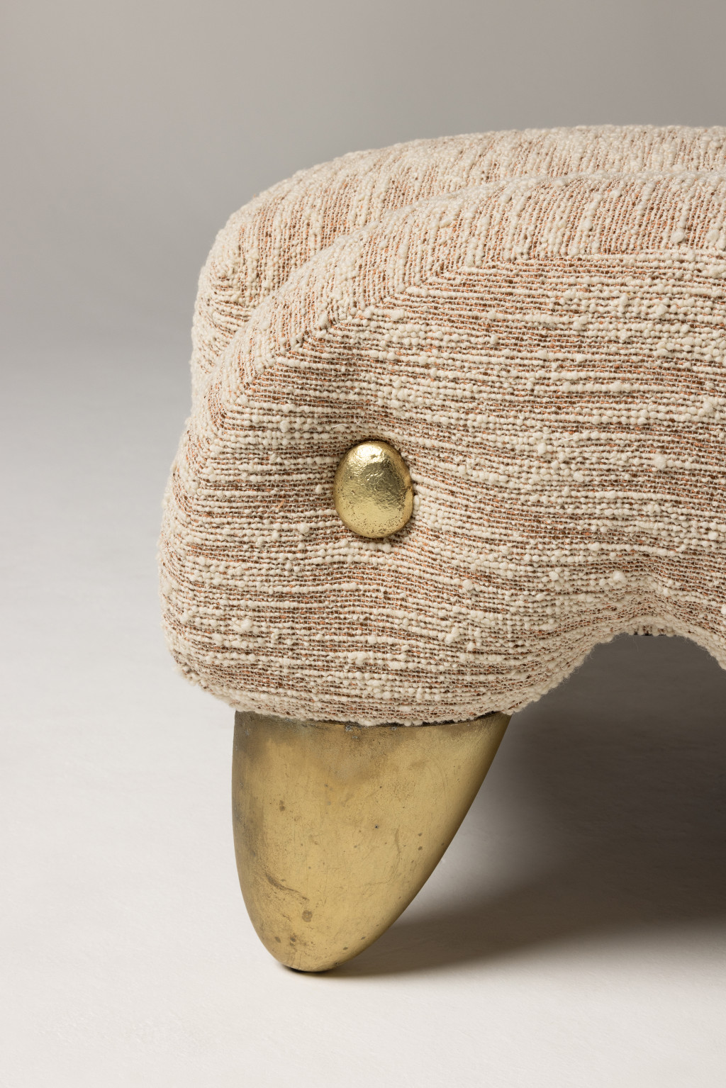 UPHOLSTERED OTTOMAN WITH CAST BRASS FEET AND BRASS BUTTON DETAILING.
