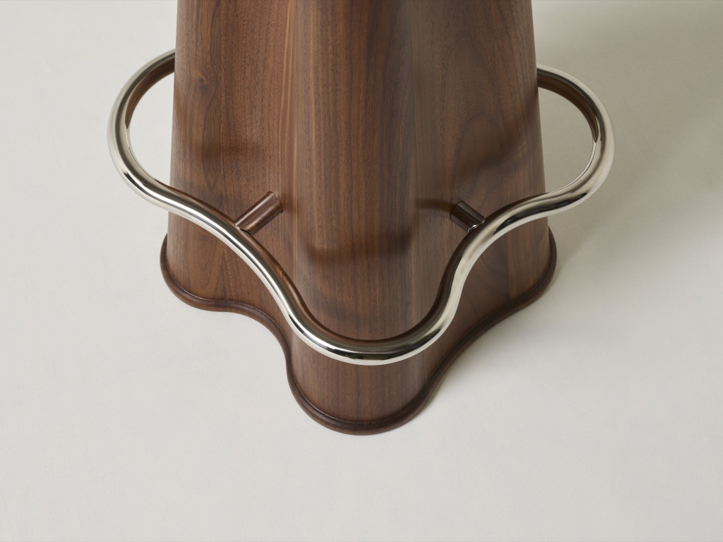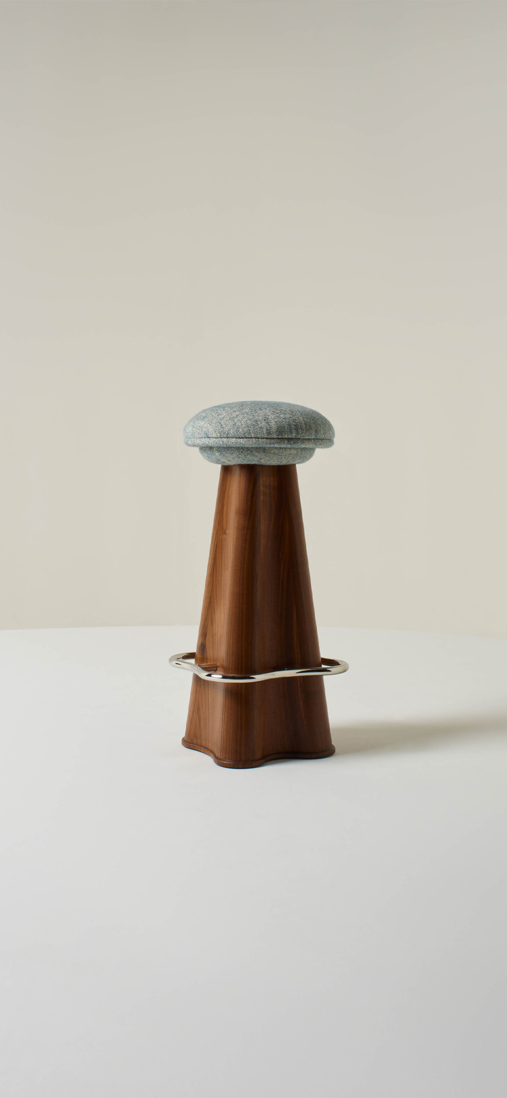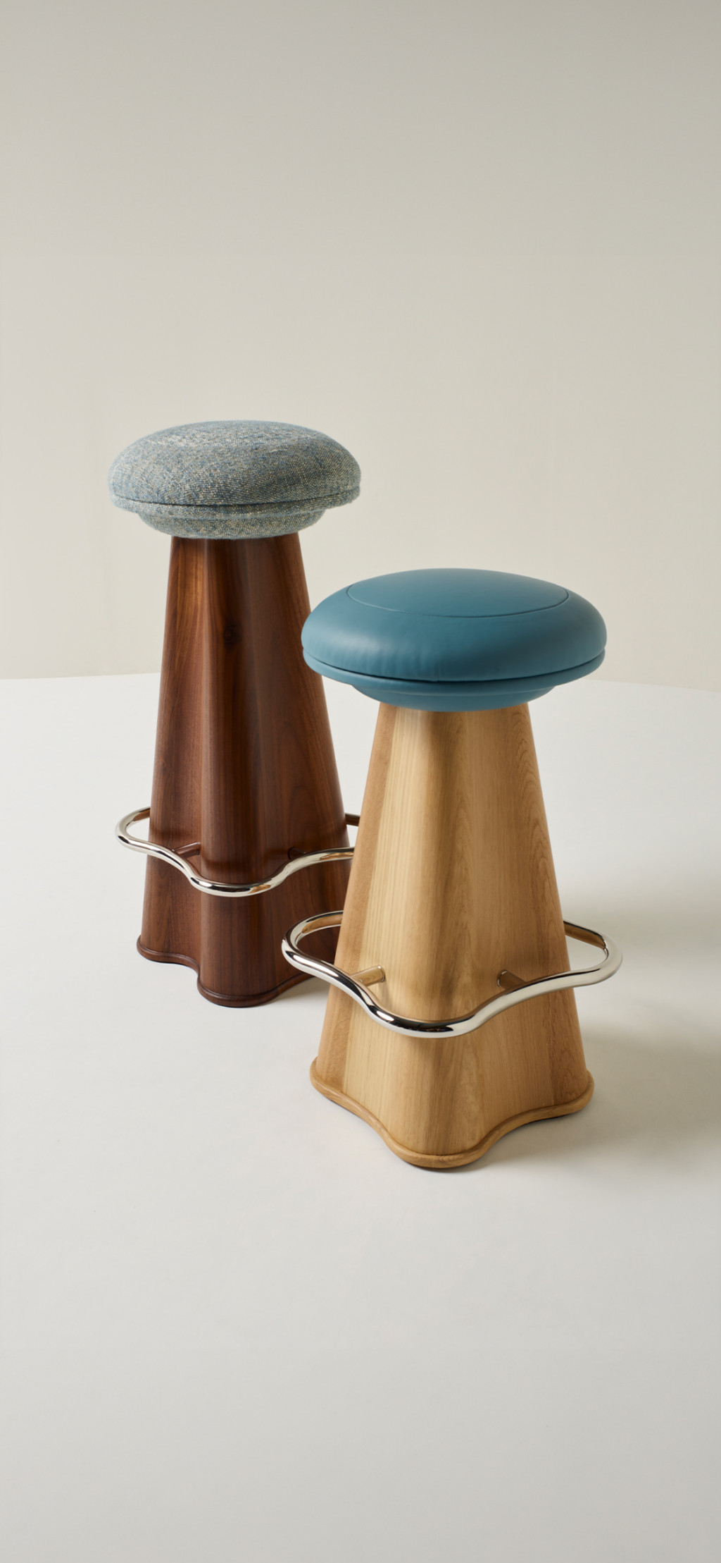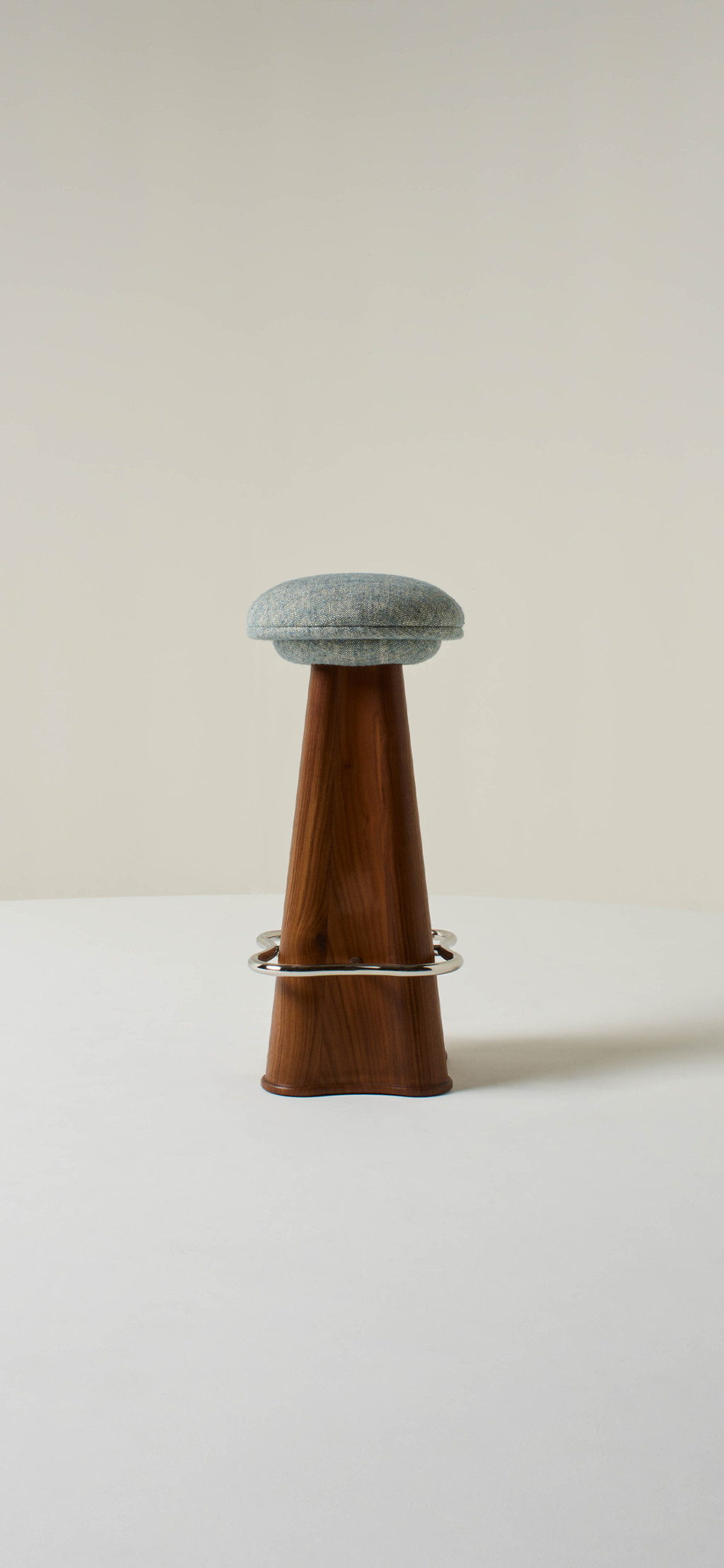 BARSTOOL AVAILABLE IN OAK AND WALNUT WITH AN UPHOLSTERED SEAT AND CHROMED FOOTRAIL.