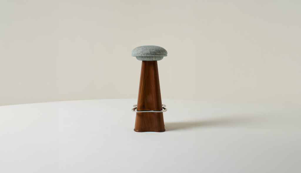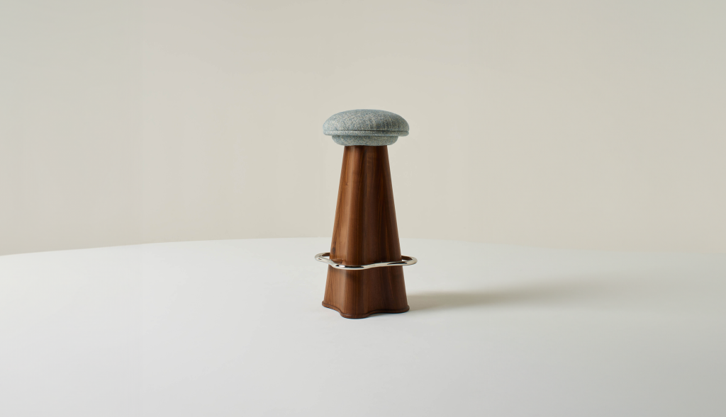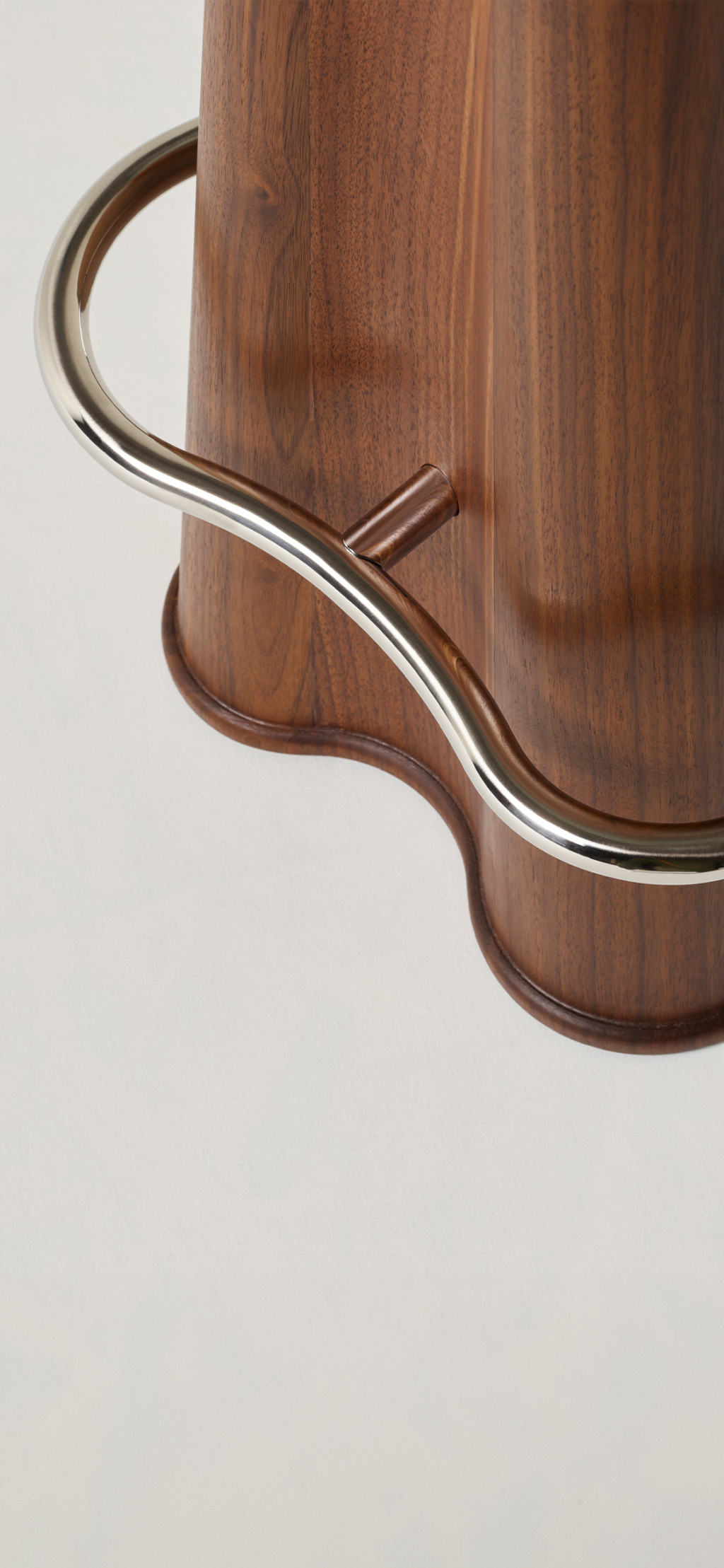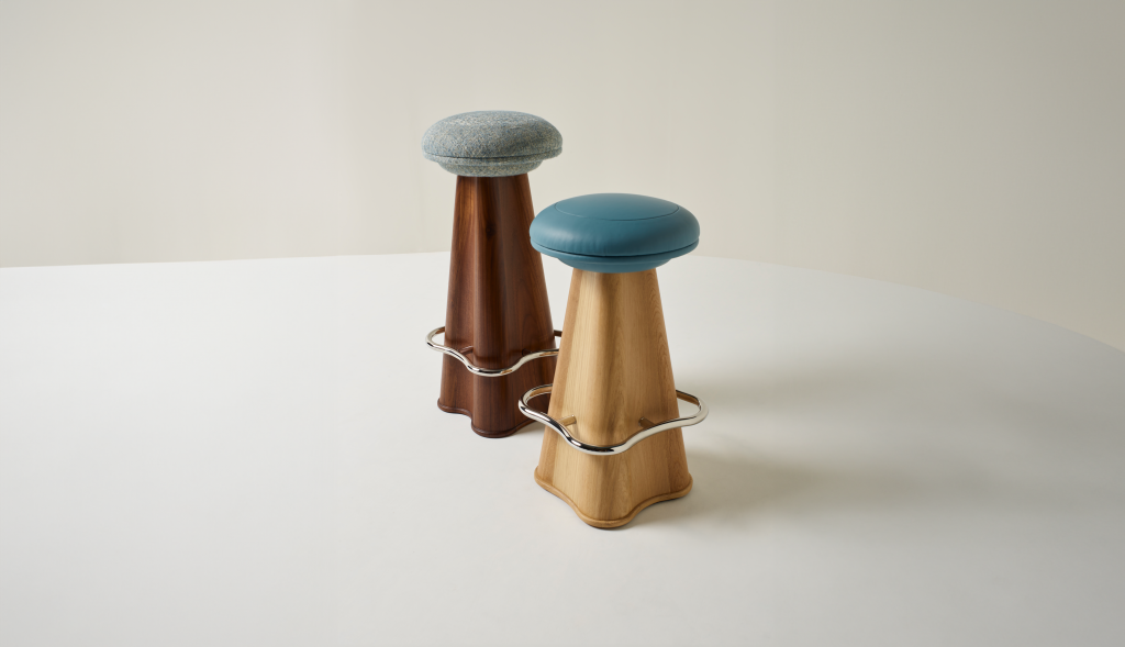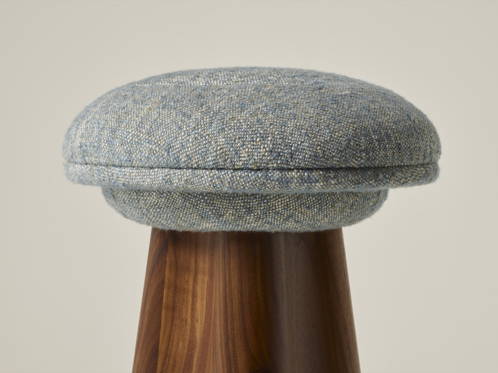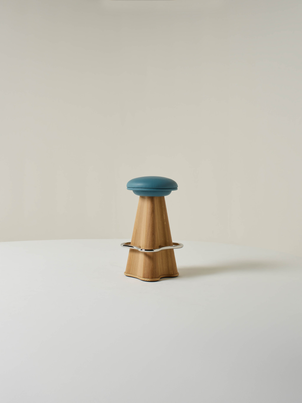BARSTOOL AVAILABLE IN OAK AND WALNUT WITH AN UPHOLSTERED SEAT AND CHROMED FOOTRAIL.