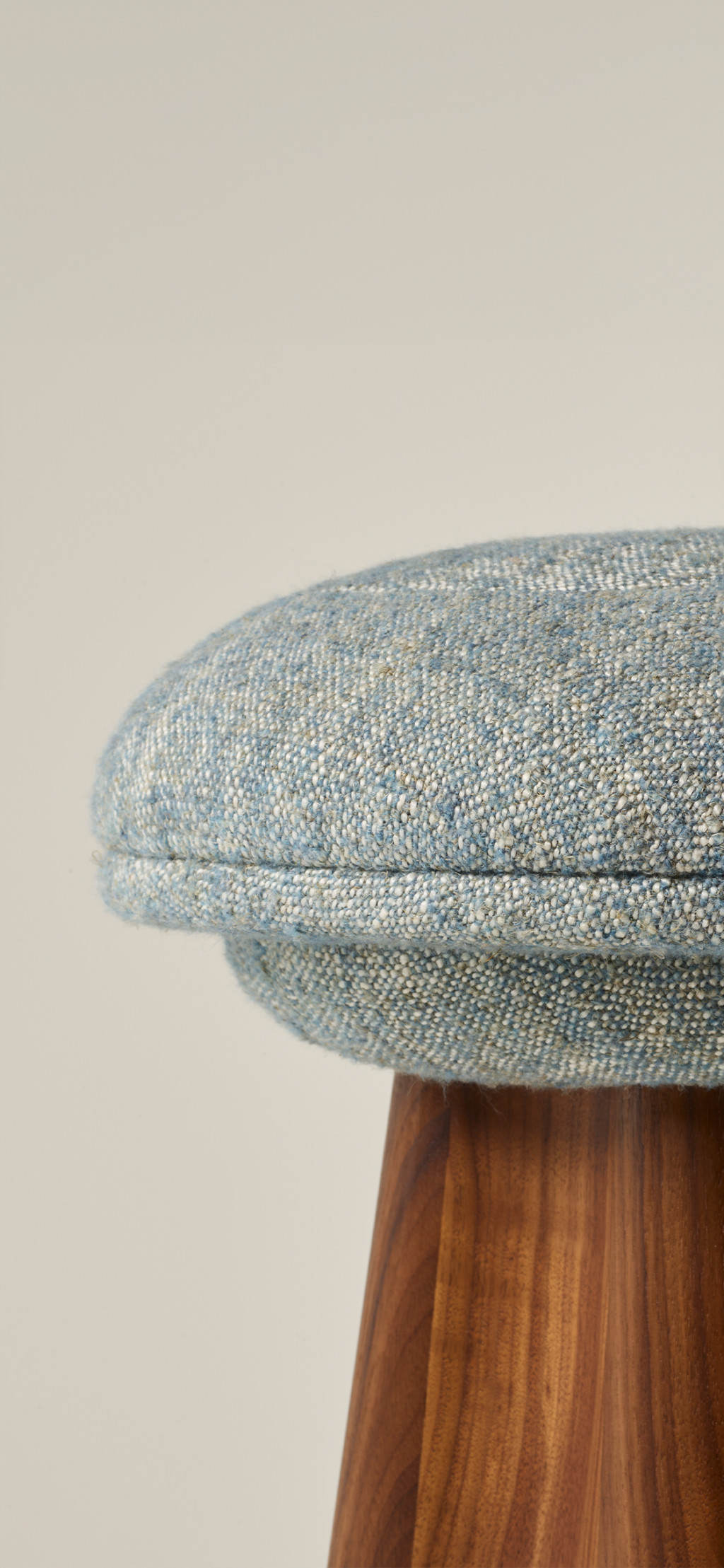 BARSTOOL AVAILABLE IN EUROPEAN OAK AND AMERICAN WALNUT WITH AN UPHOLSTERED SEAT AND CHROMED FOOTRAIL.