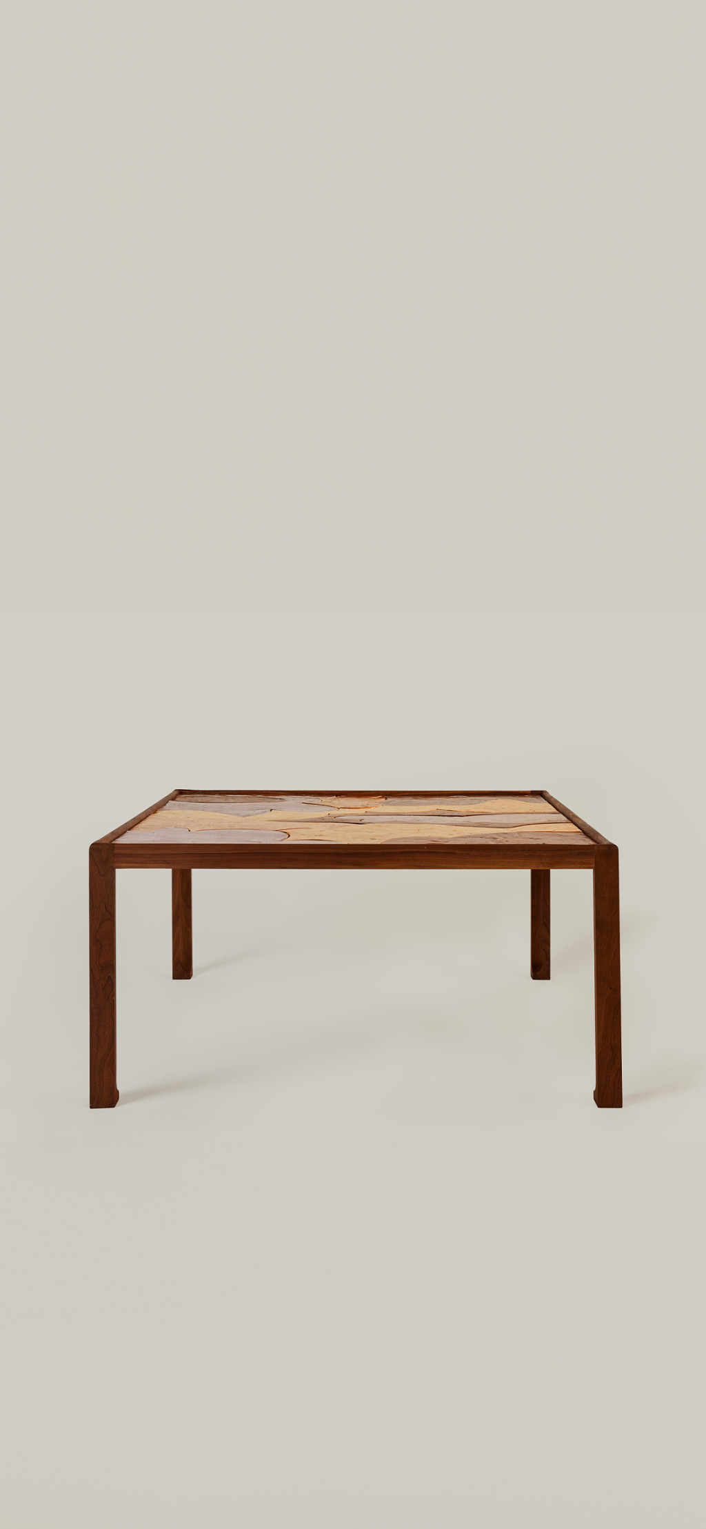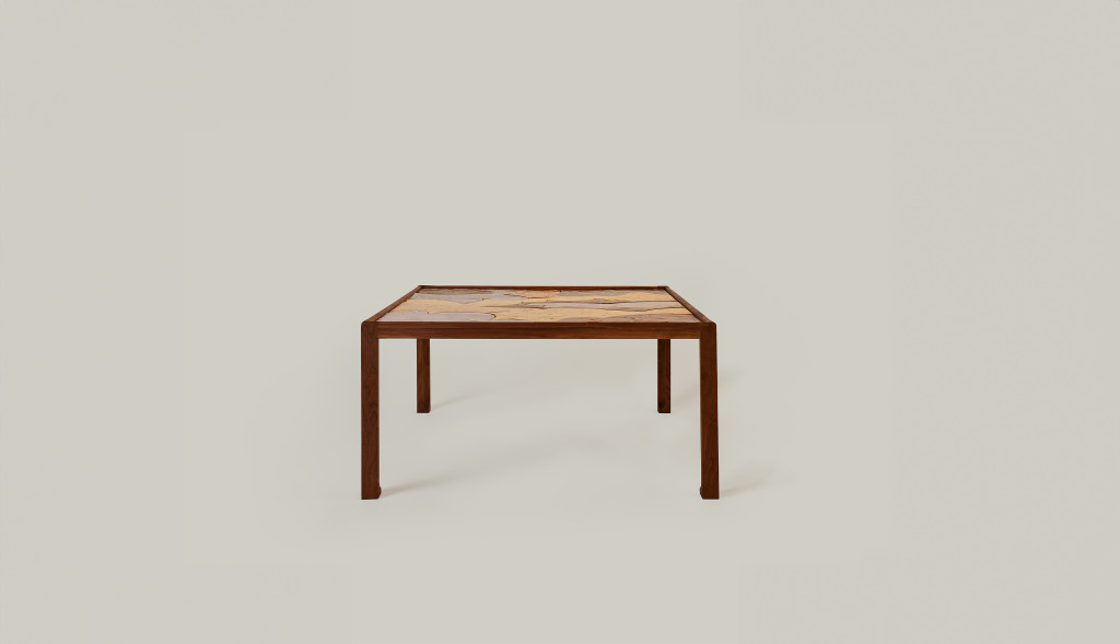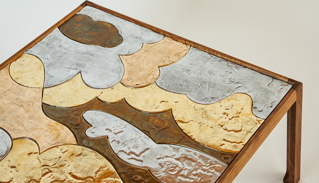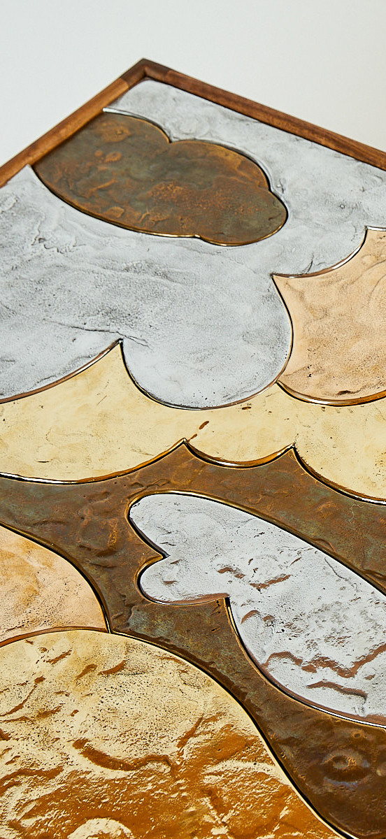 AMERICAN WALNUT COFFEE TABLE WITH CAST ALUMINIUM AND BRASS TILES.