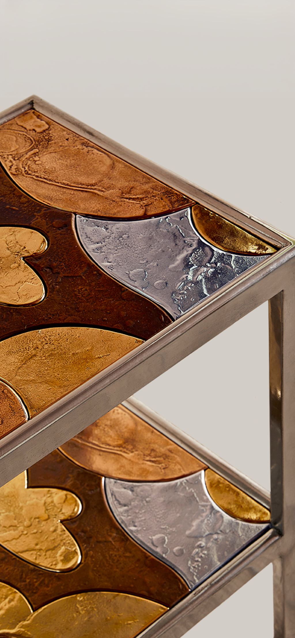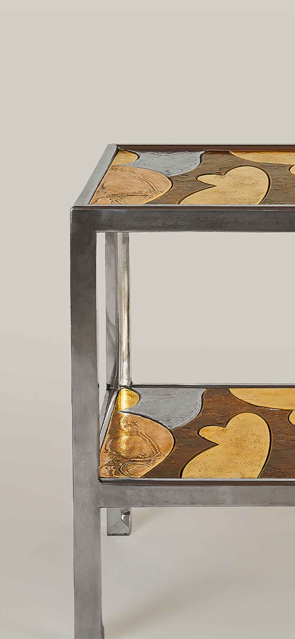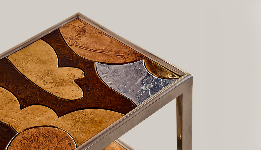 NICKEL-PLATED CAST ALUMINIUM SIDE TABLE WITH CAST BRONZE, BRASS & ALUMINIUM TILES.