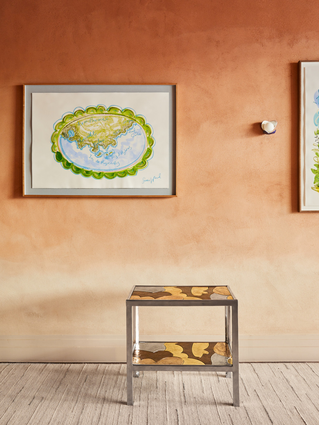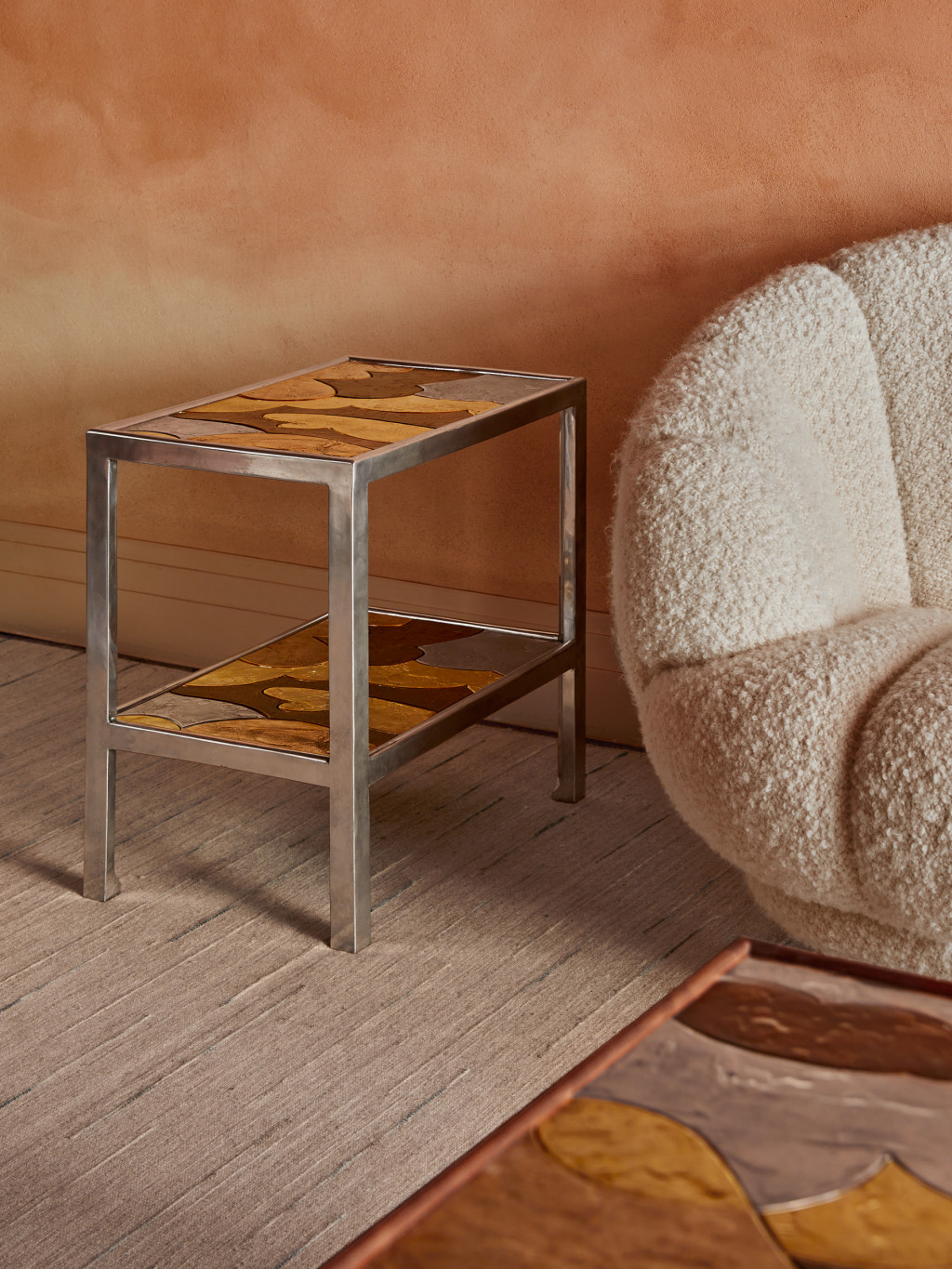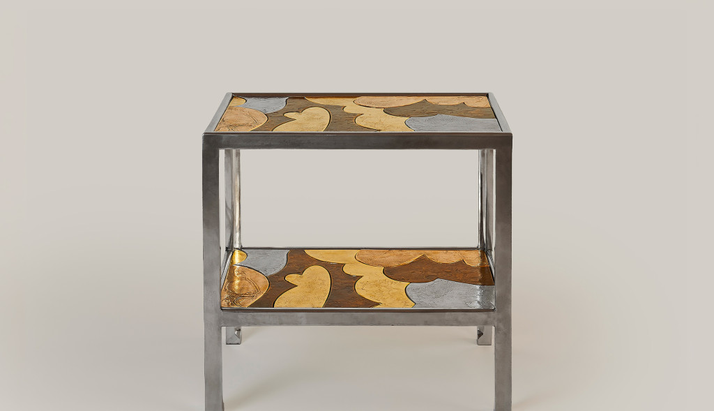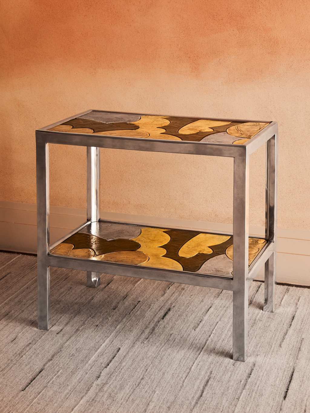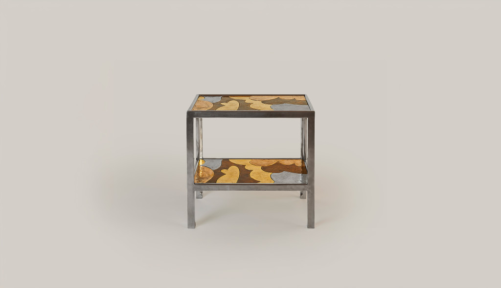 CAST ALUMINIUM SIDE TABLE WITH CAST BRONZE, BRASS & ALUMINIUM TILES.