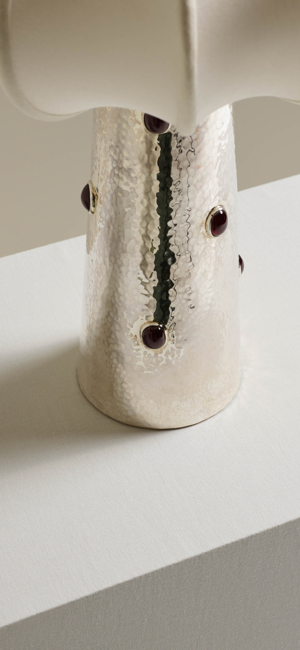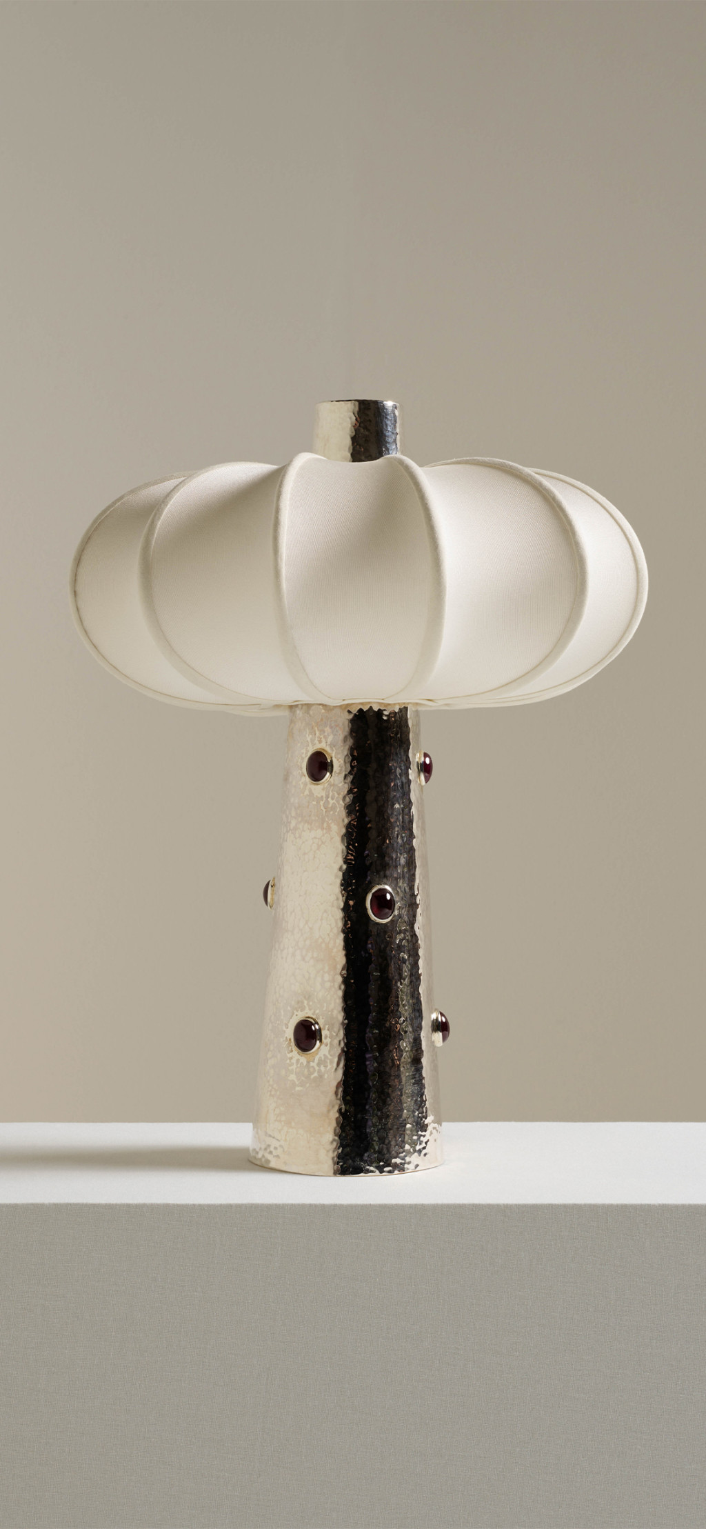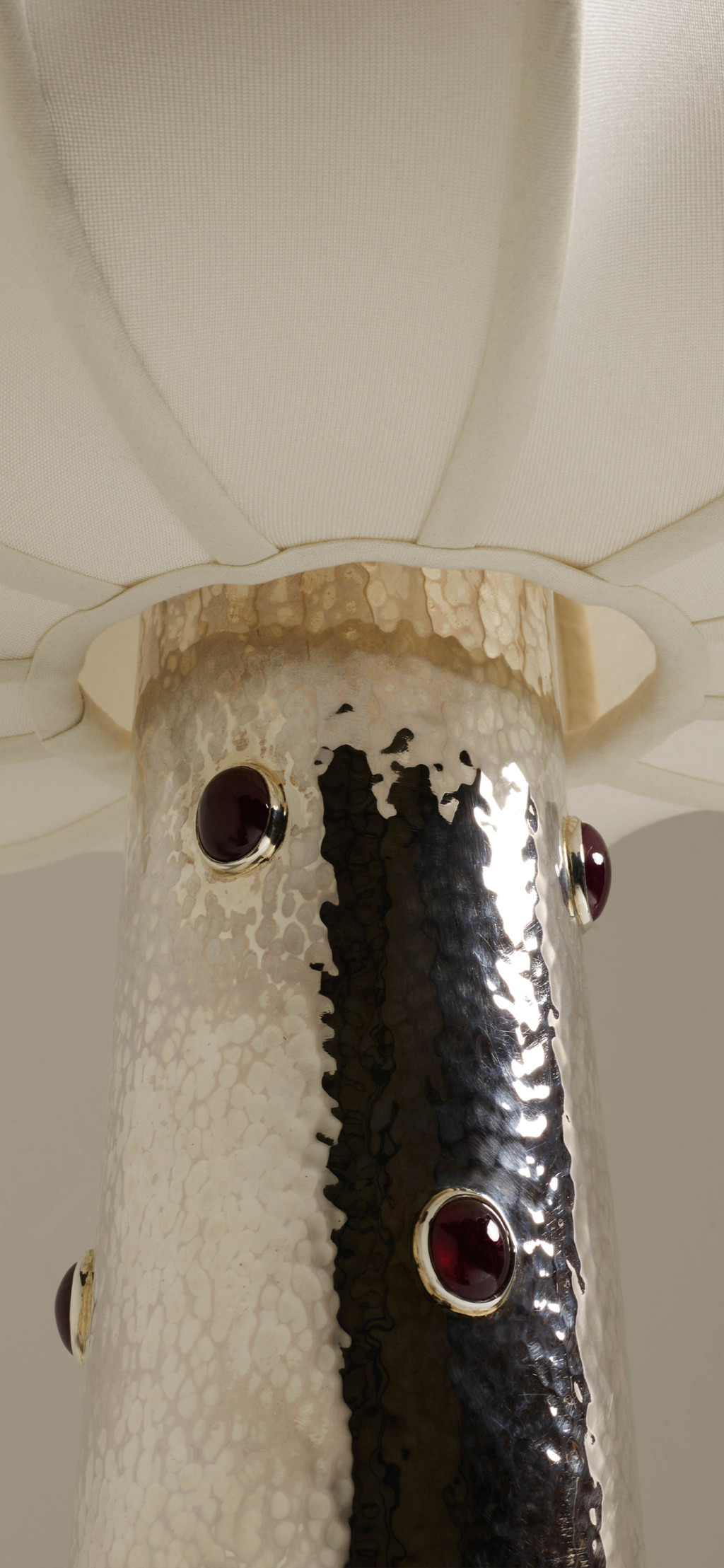 HAND-FORGED SOLID SILVER TABLE LIGHT SET WITH NINE RUBY CABOCHONS AND SILK LINEN SHADE.
