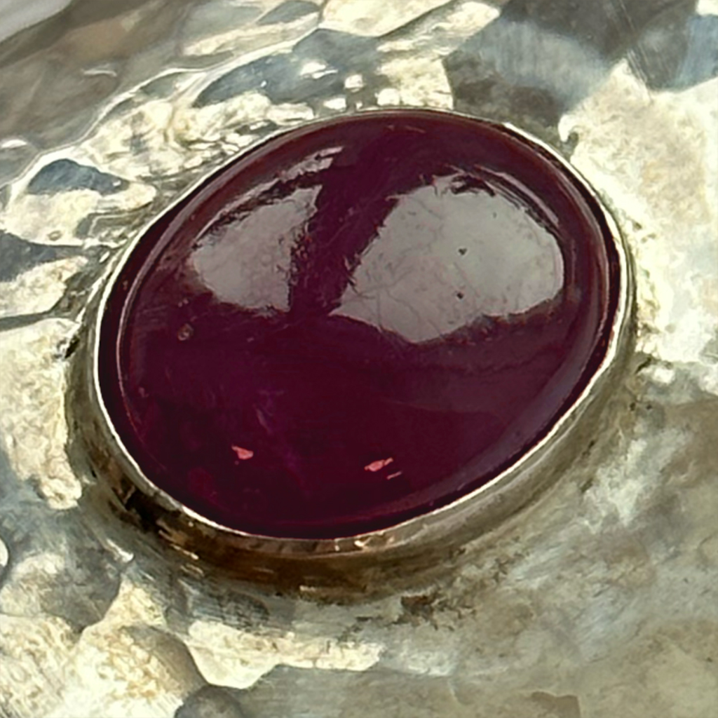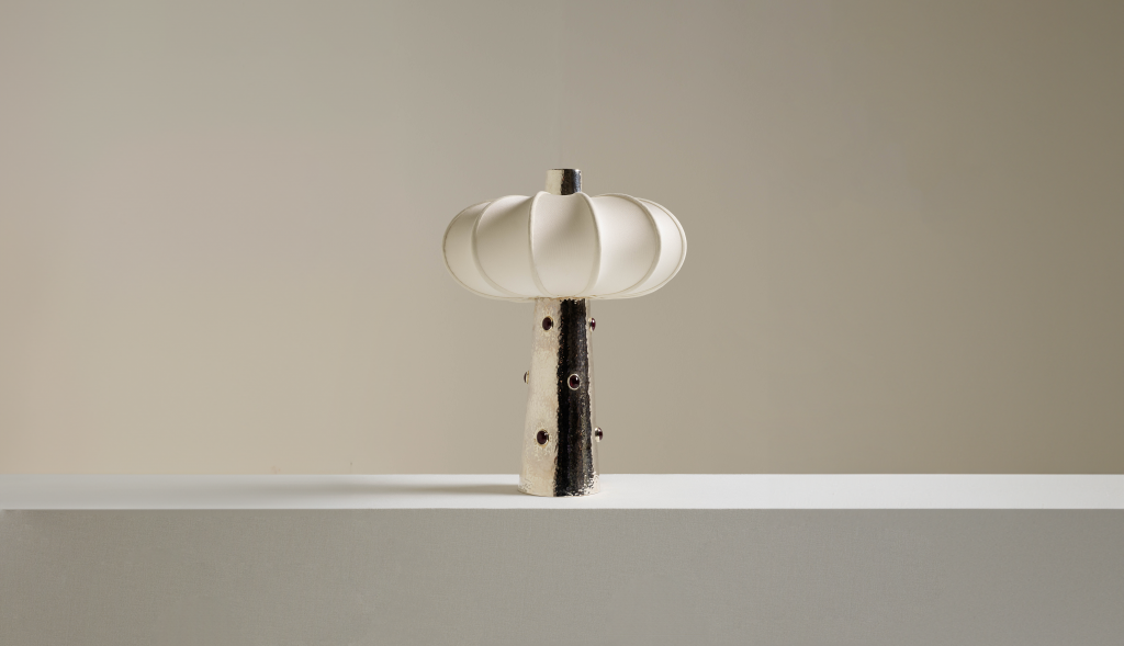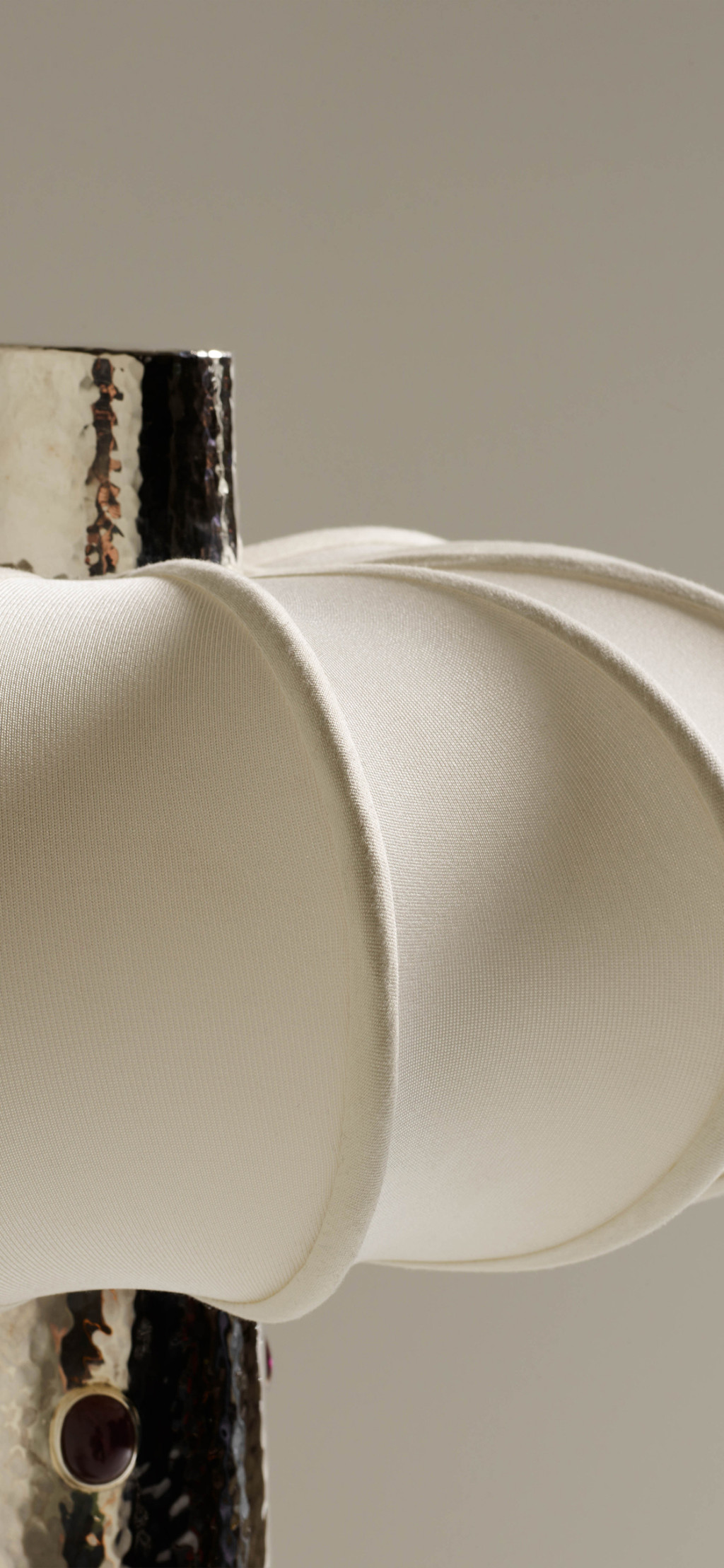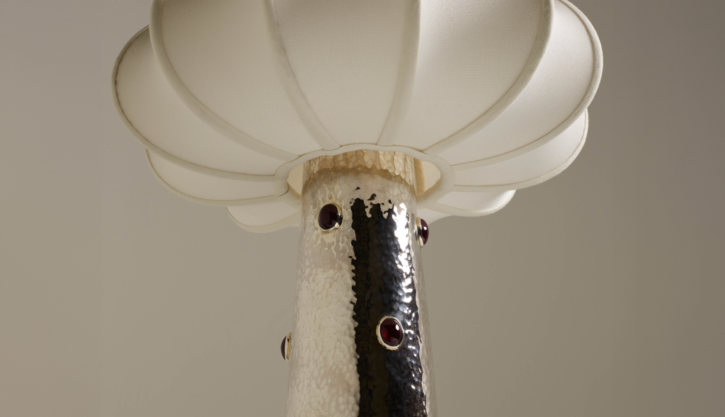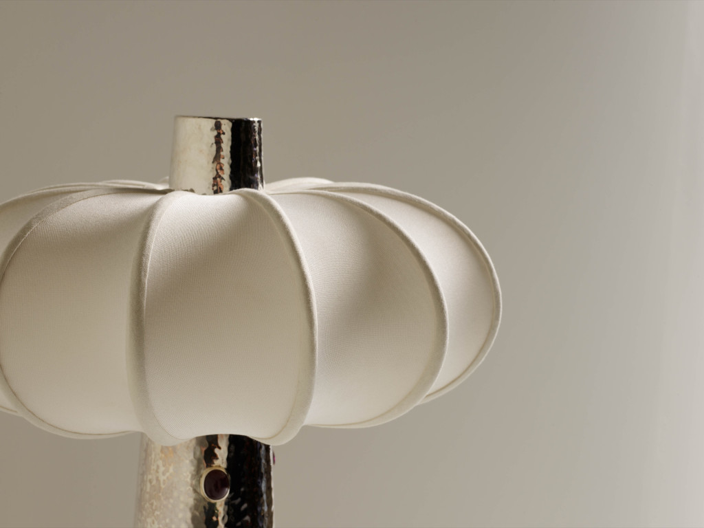 HAND-FORGED SOLID SILVER TABLE LIGHT SET WITH NINE RUBY CABOCHONS AND SILK LINEN SHADE.