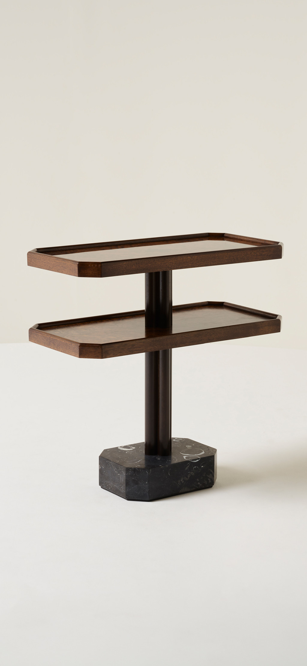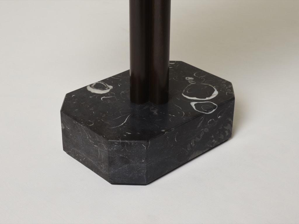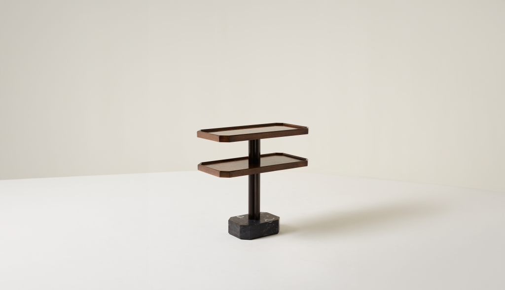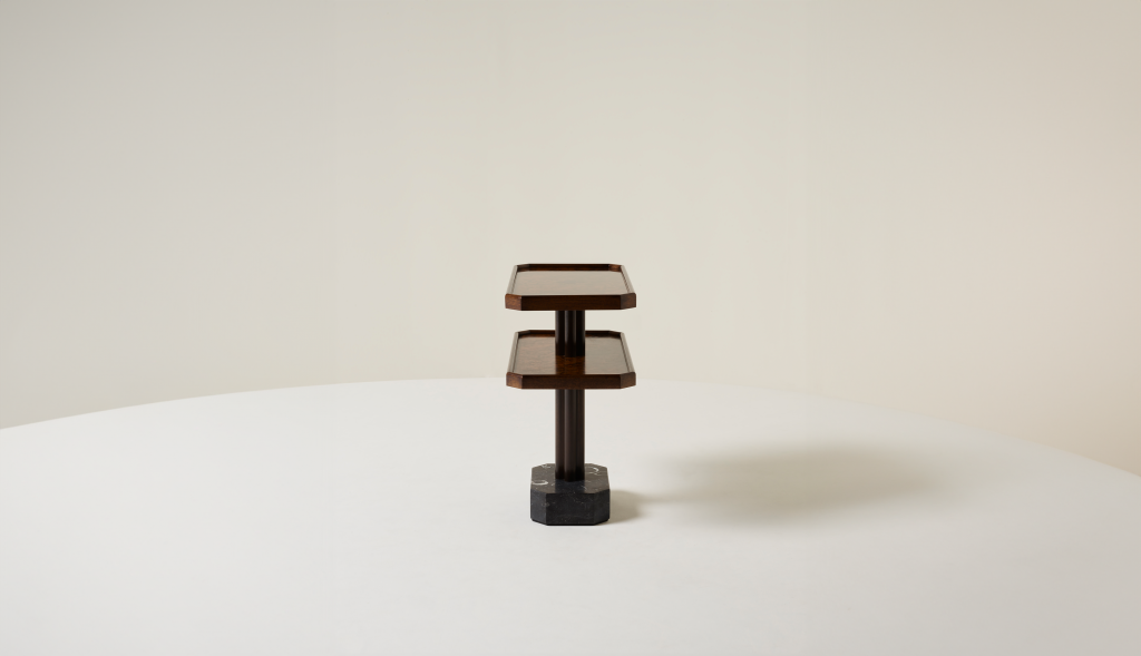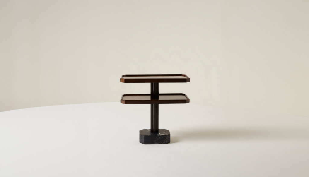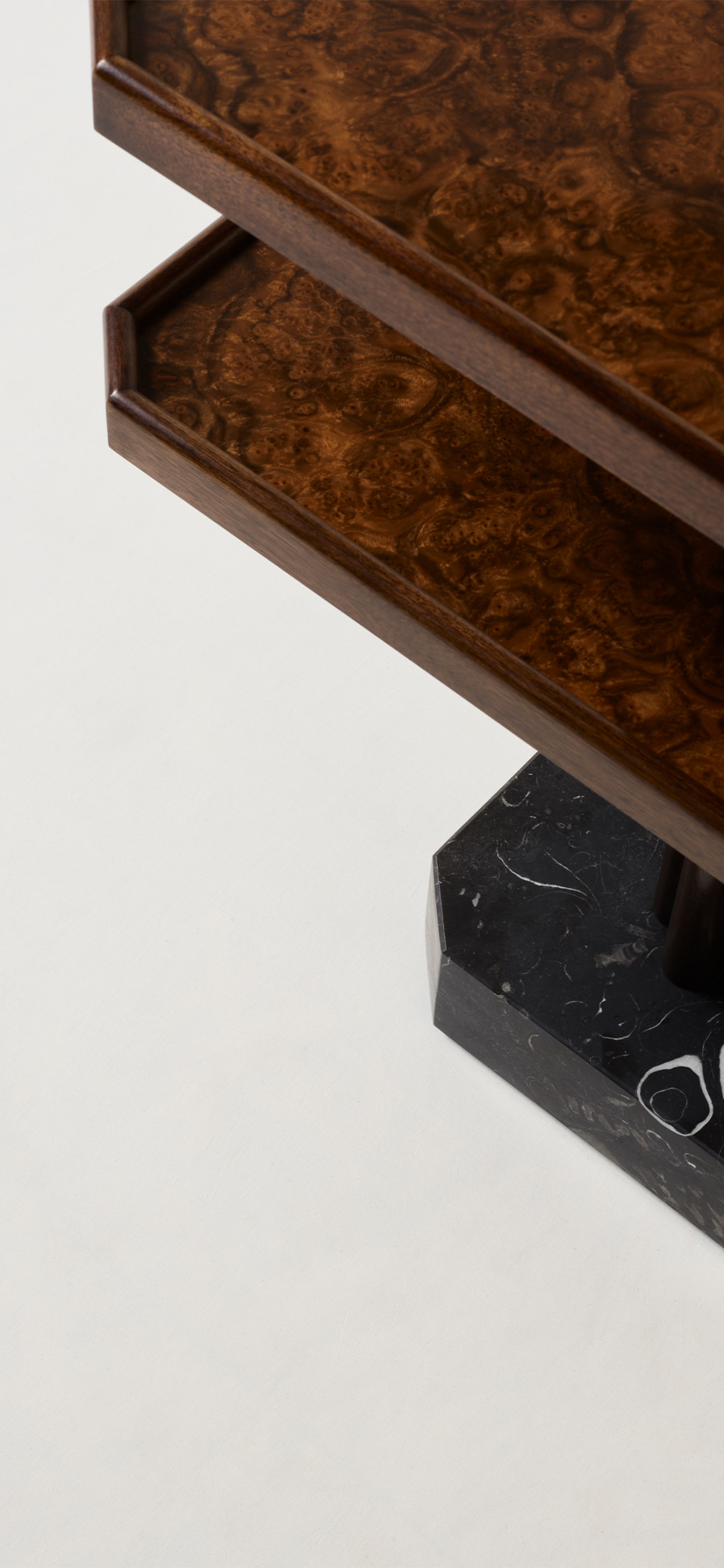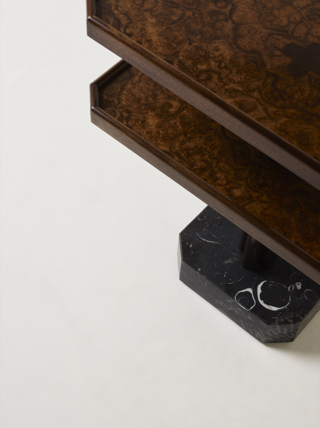 WALNUT BURR AND SOLID WALNUT SIDE TABLE WITH KILKENNY LIMESTONE BASE.