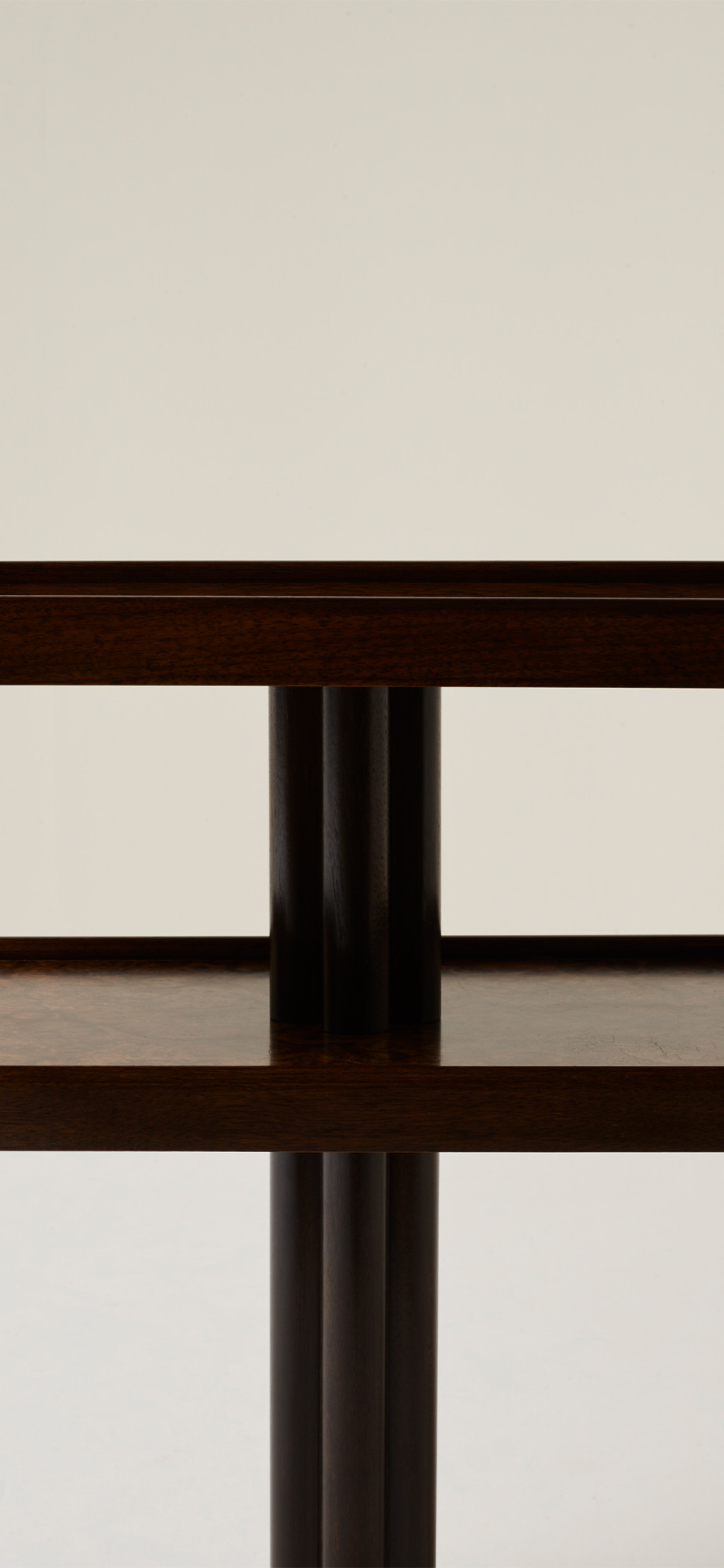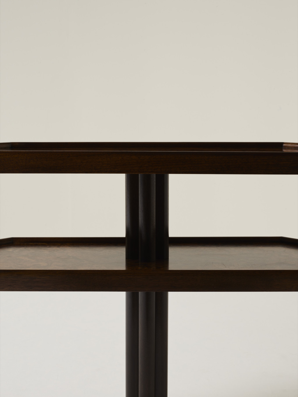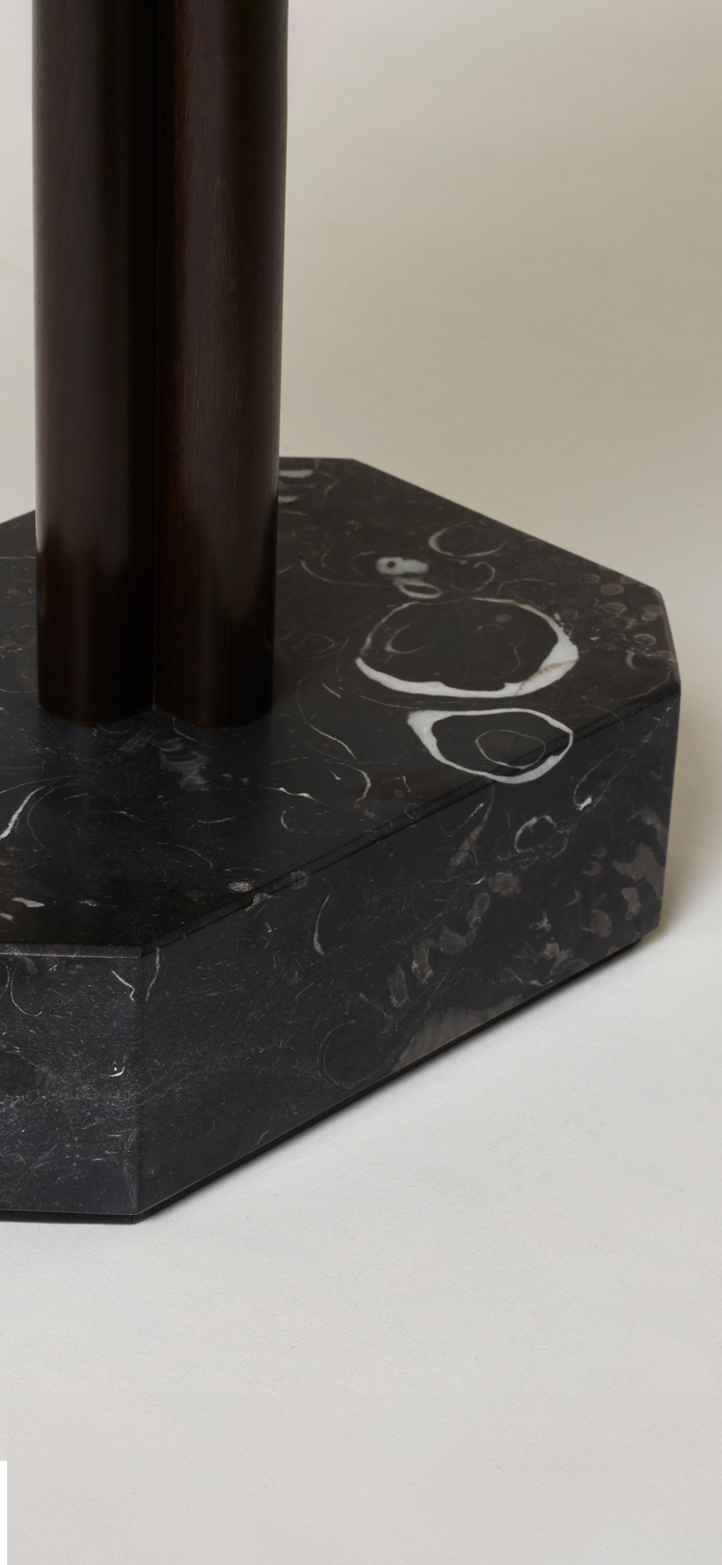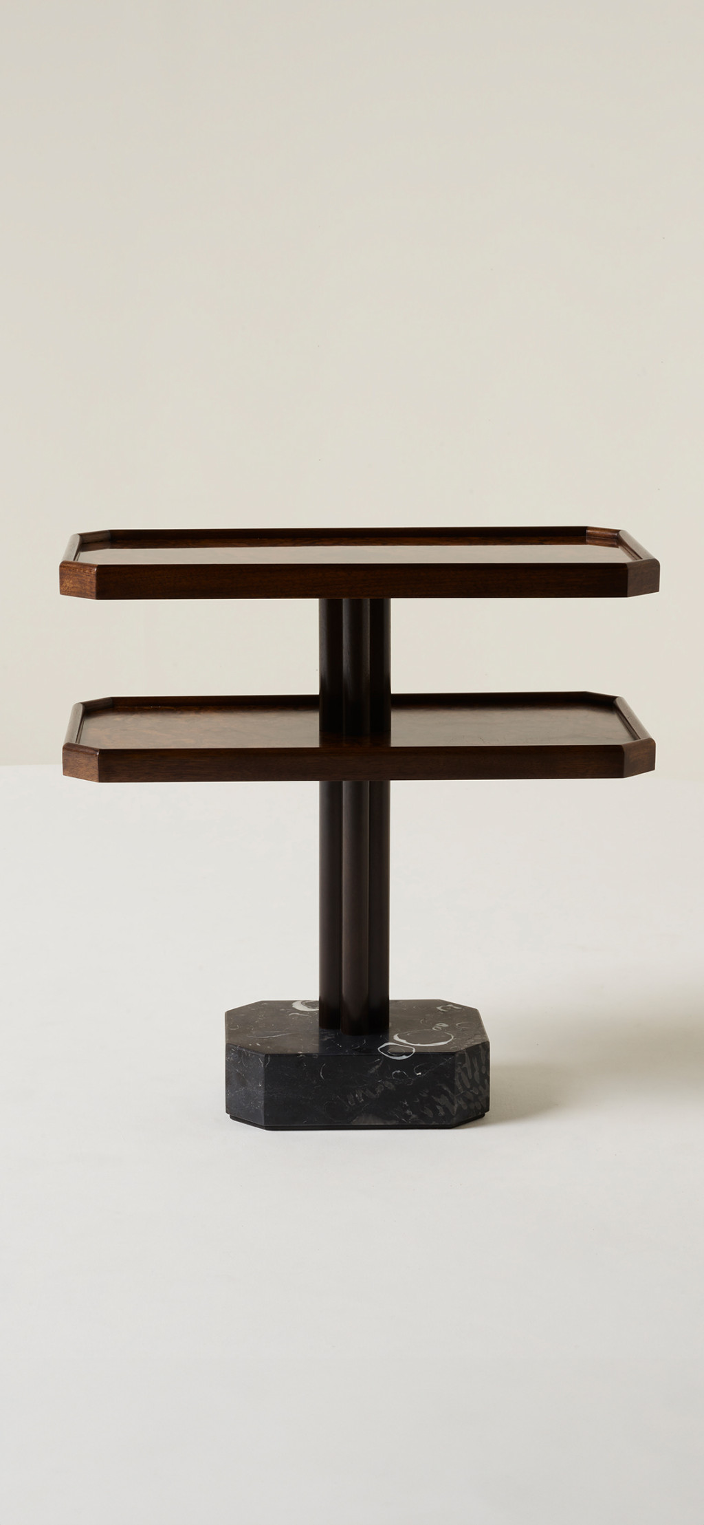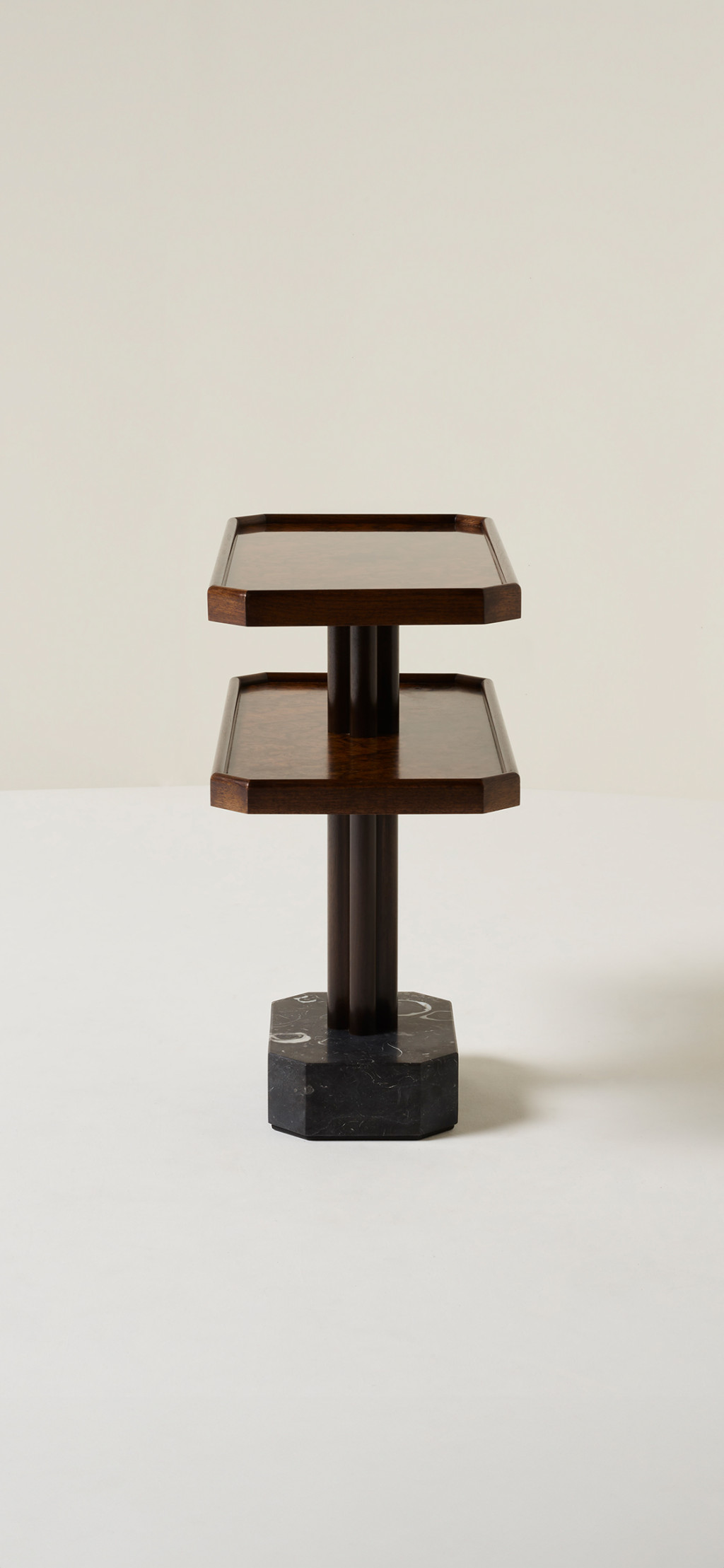 WALNUT BURR AND SOLID WALNUT SIDE TABLE WITH KILKENNY LIMESTONE BASE.
