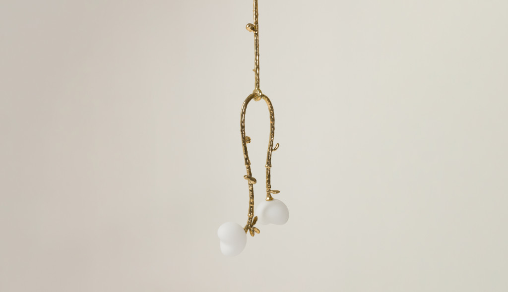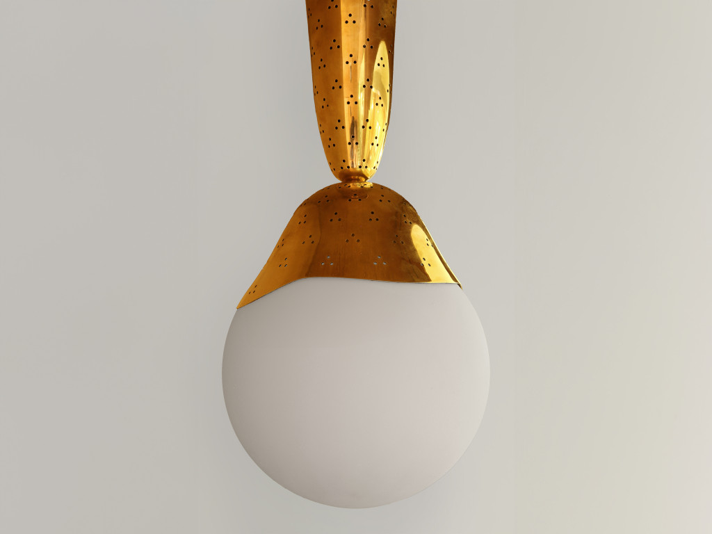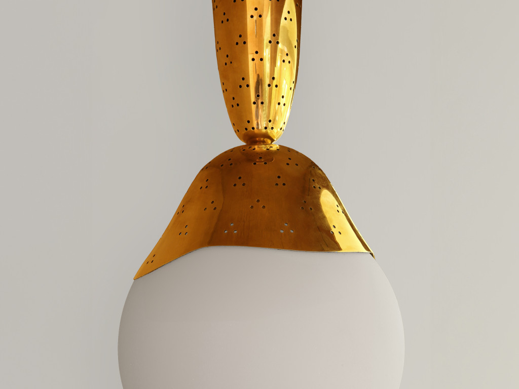 CEILING LIGHT WITH BLOWN GLASS GLOBE AND DETAILED POLISHED BRASS STEM