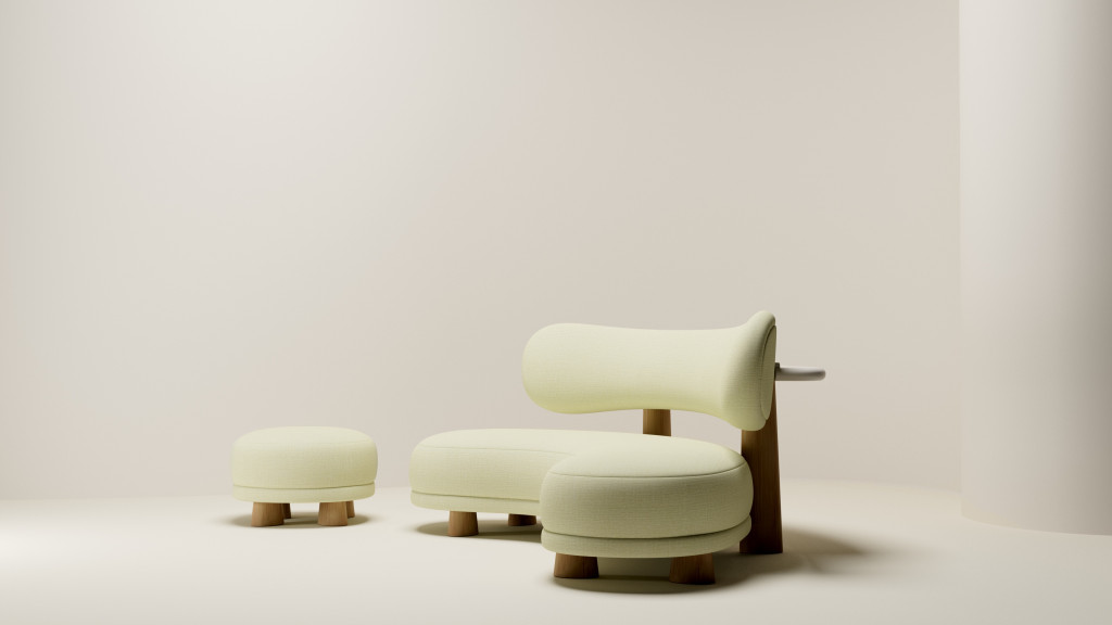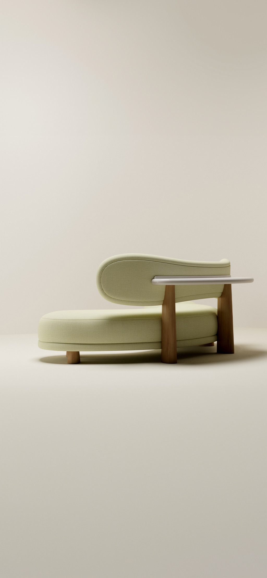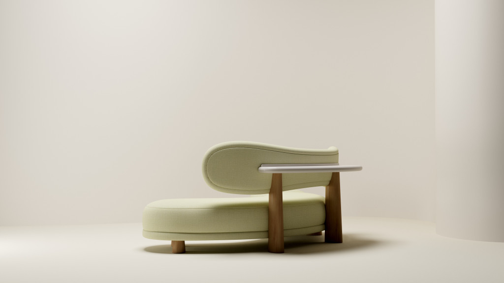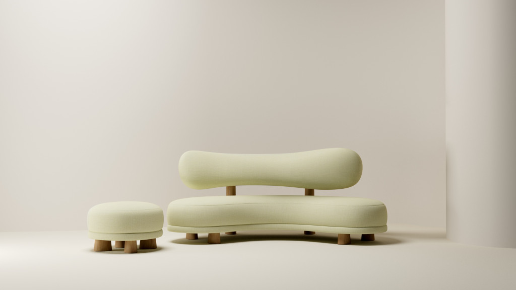 UPHOLSTERED SOFA WITH EUROPEAN OAK LEGS AND HIGH-GLOSS LAQUERED SHELF.