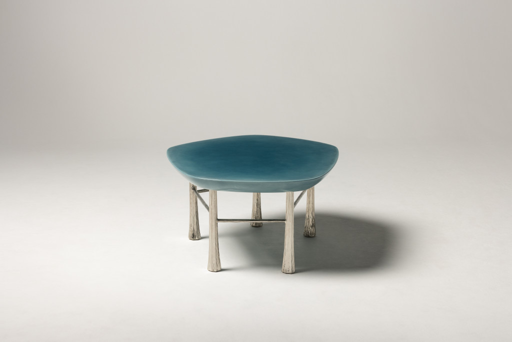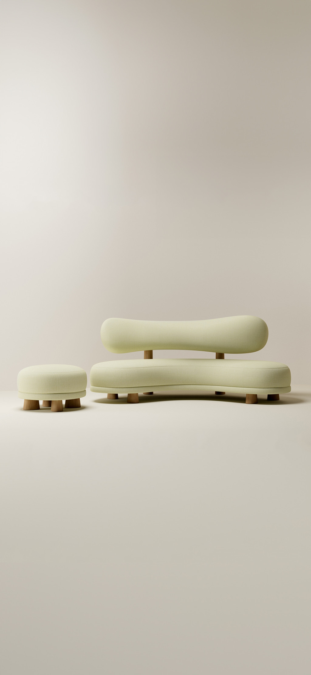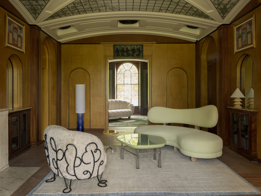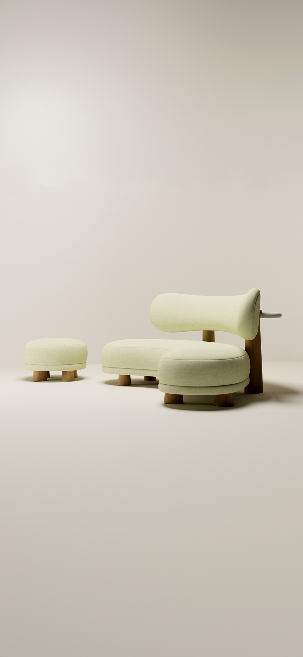 UPHOLSTERED SOFA WITH EUROPEAN OAK LEGS AND HIGH-GLOSS LAQUERED SHELF.