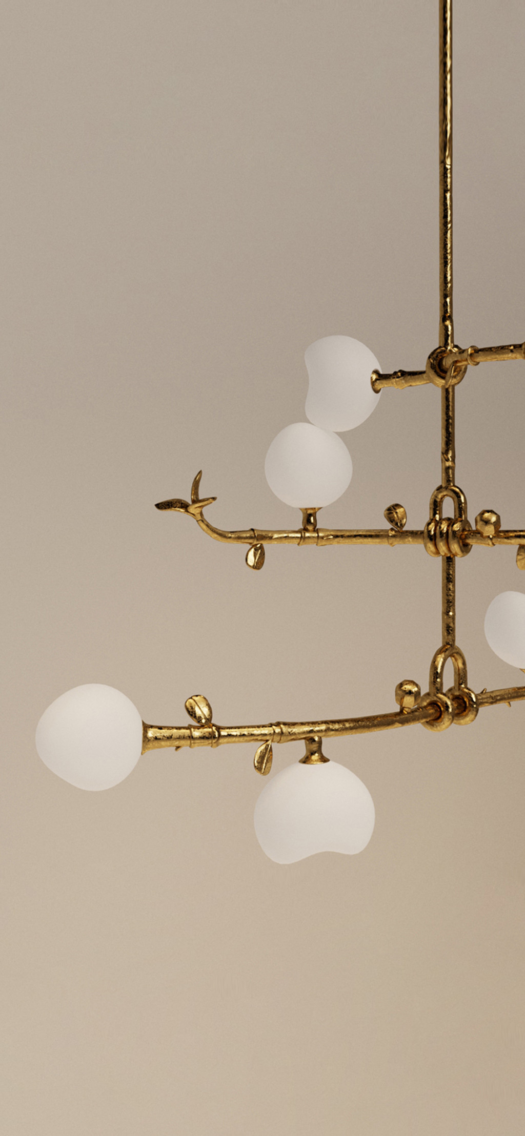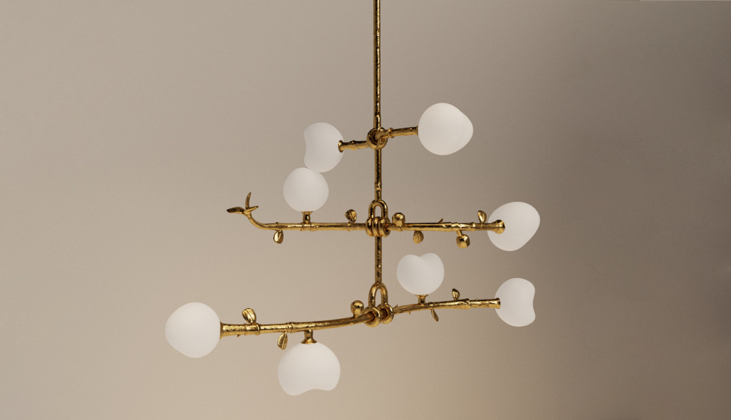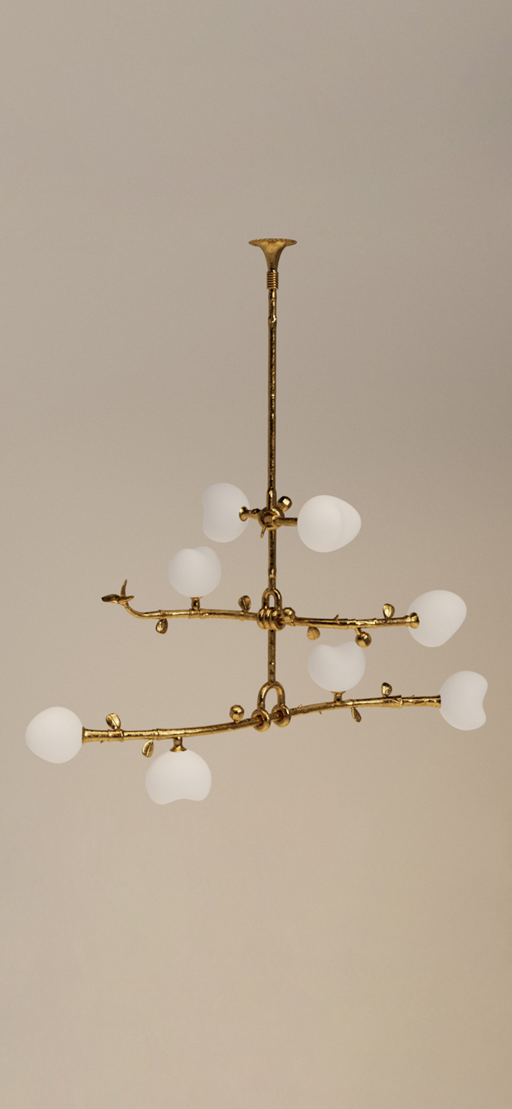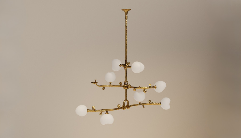 THREE TIERED CAST BRASS PENDANT LIGHT WITH BLOWN GLASS.