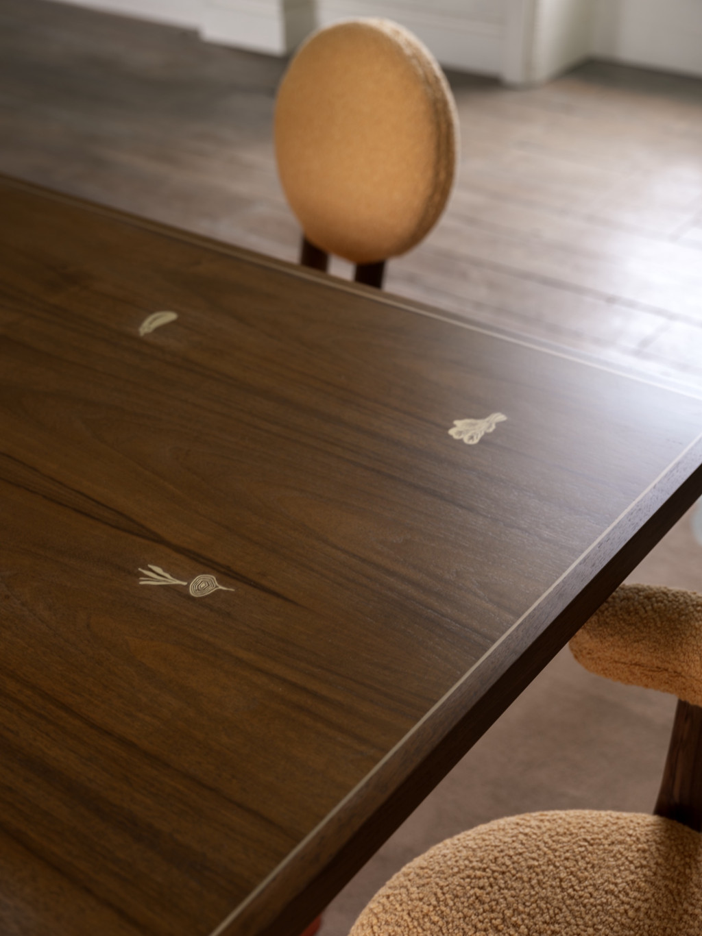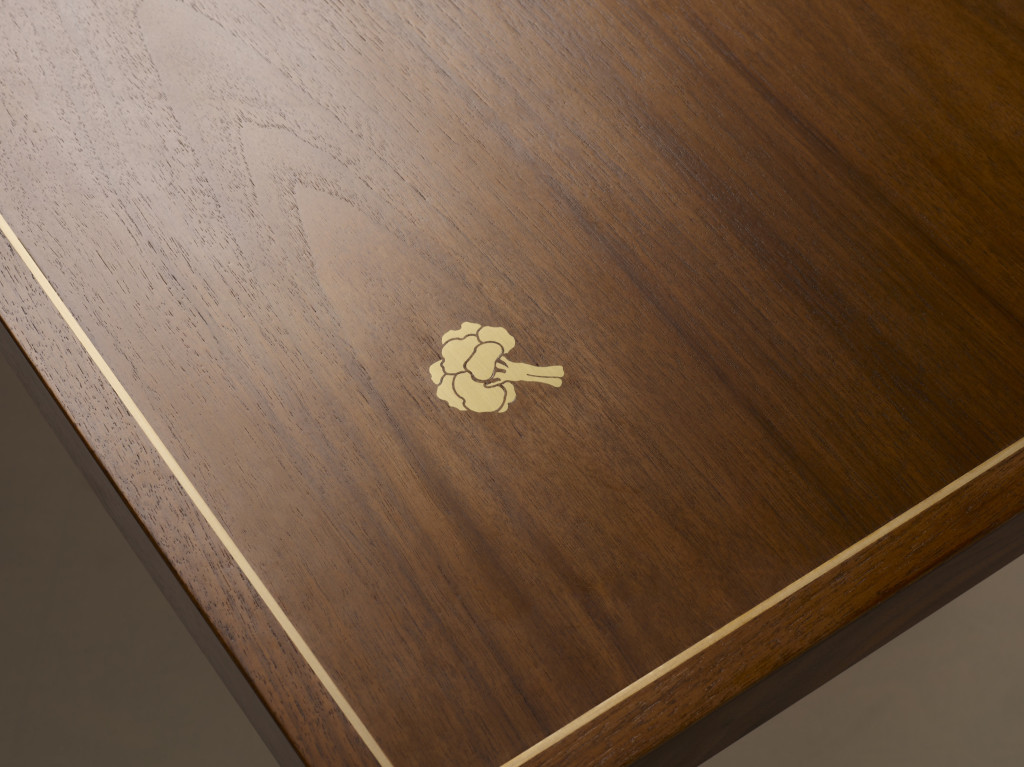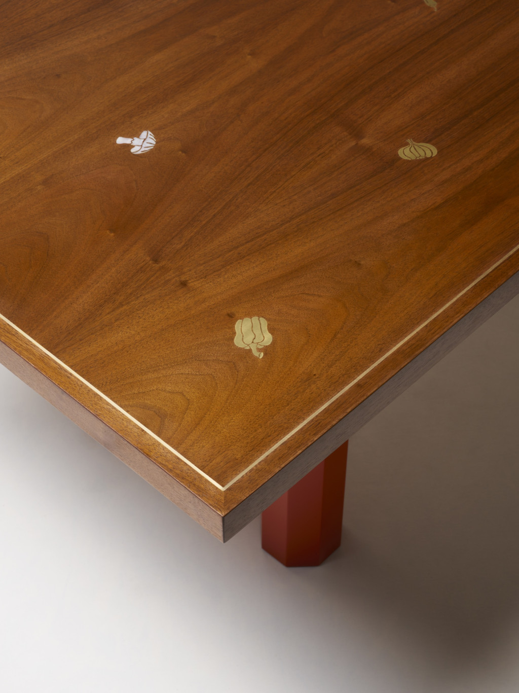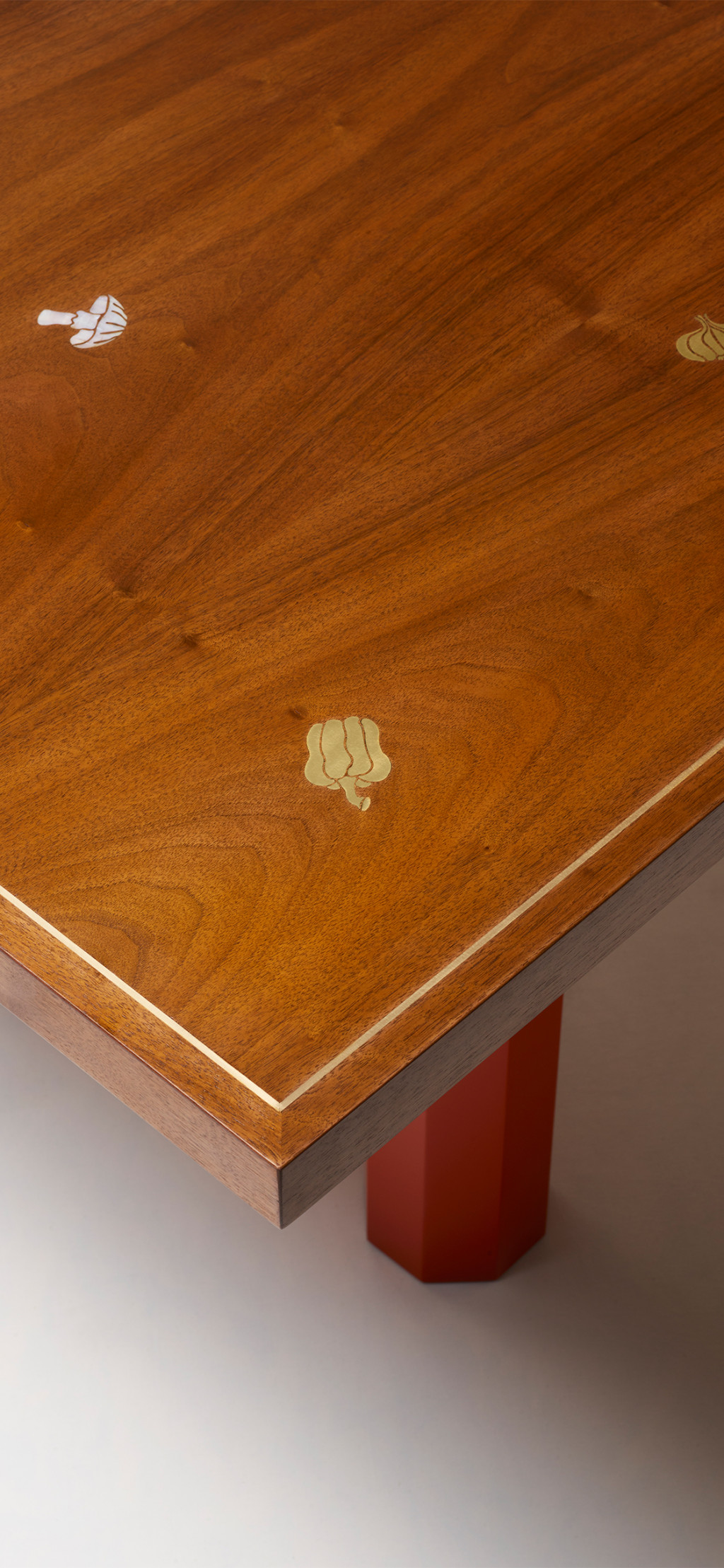 WALNUT DINING TABLE WITH BRASS INLAY VEGETABLES AND MOTHER-OF-PEARL MUSHROOMS.