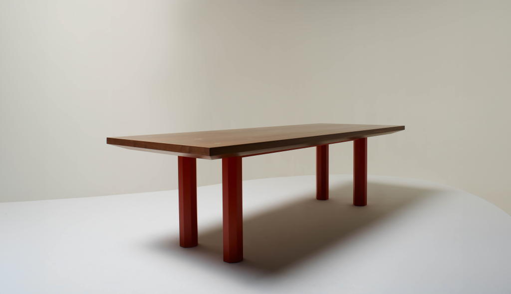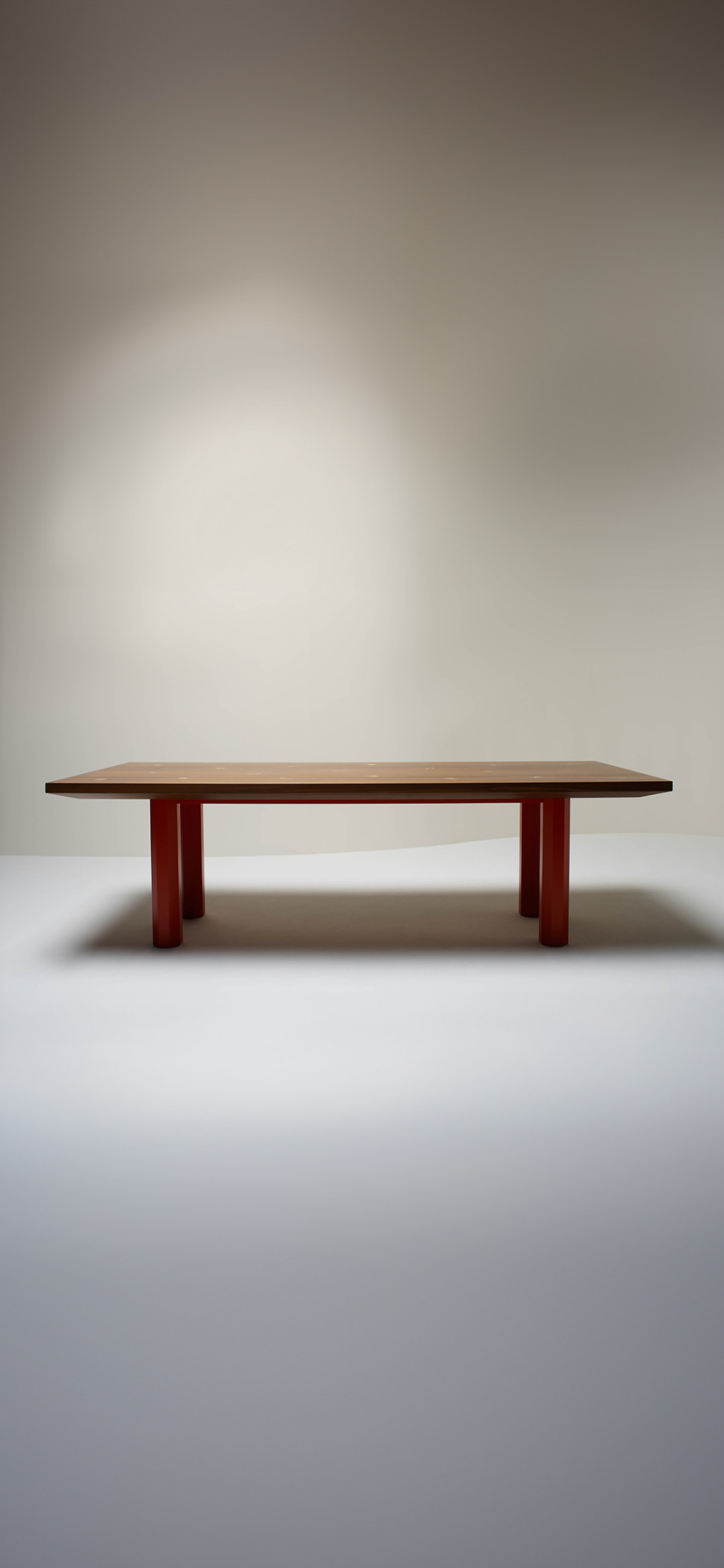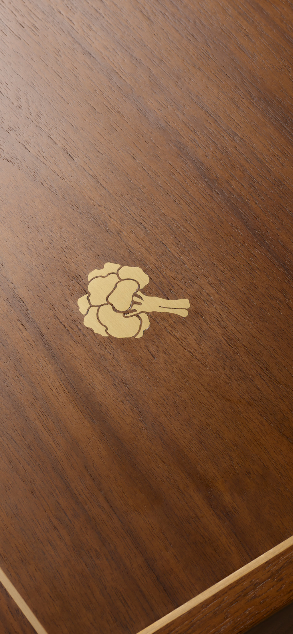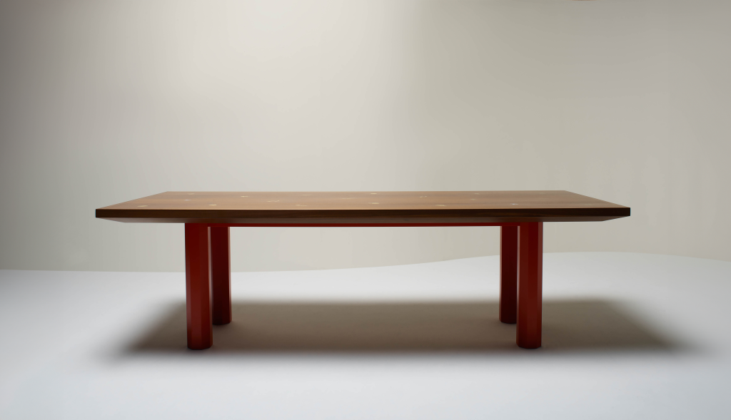 WALNUT DINING TABLE WITH BRASS INLAY VEGETABLES AND MOTHER-OF-PEARL MUSHROOMS.