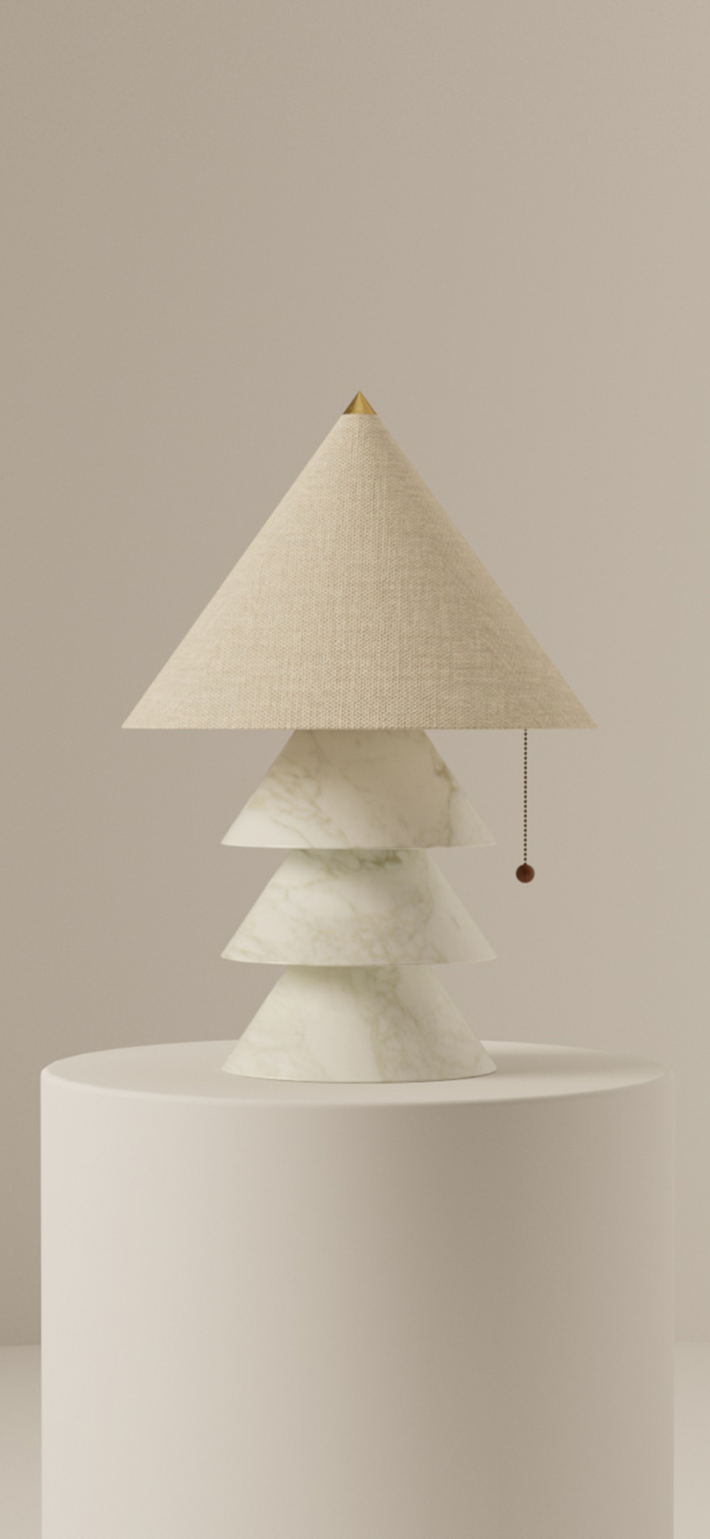 TURNED ONYX TABLE LIGHT WITH A LINEN SHADE AND WALNUT DETAIL.