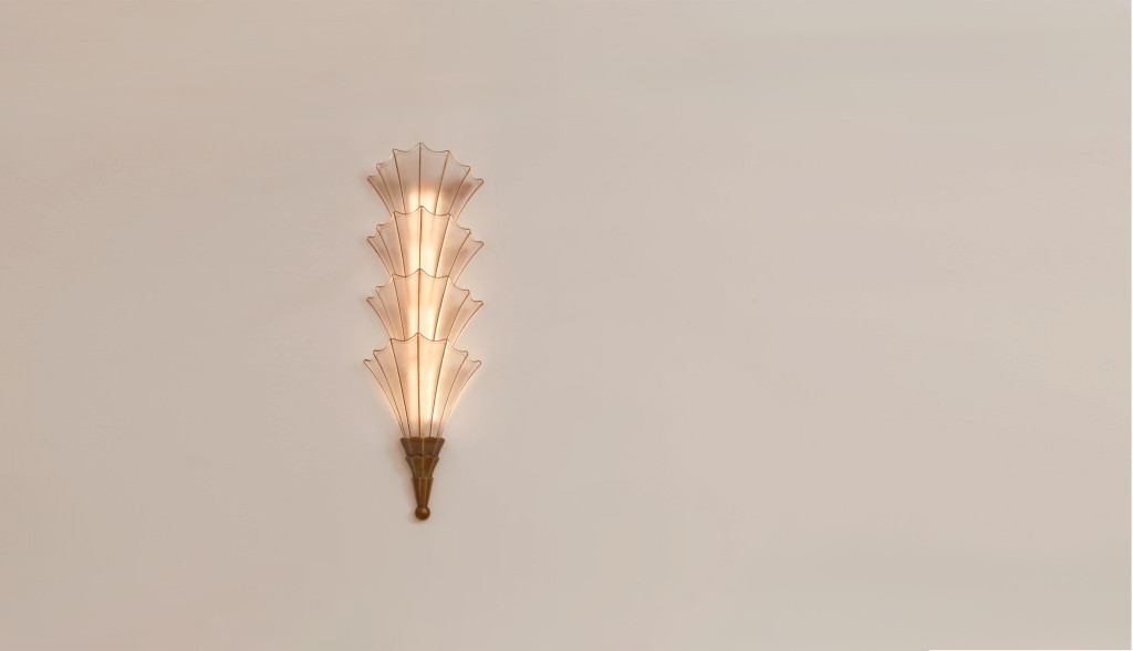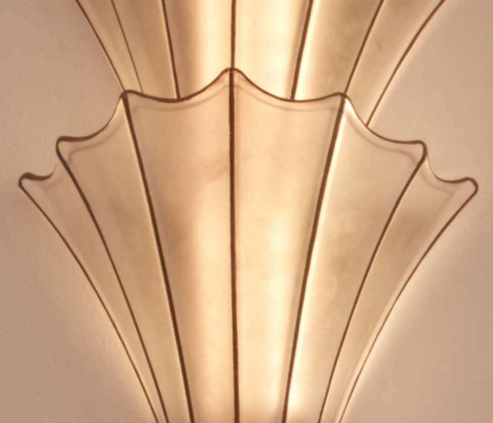FROSTED GLASS WALL LIGHT WITH GOLD TRIM AND ANTIQUE BRASS.