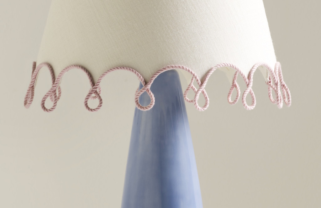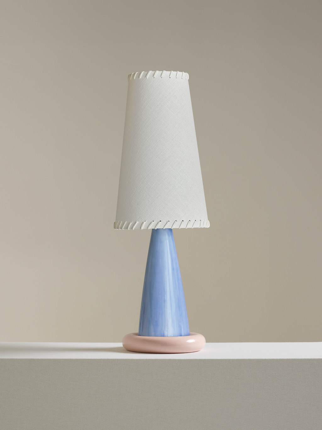 GLAZED CERAMIC TABLE LIGHT BASE WITH A LINEN SHADE WITH LOOP DETAIL.
