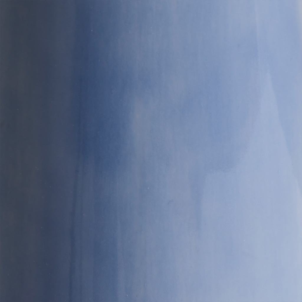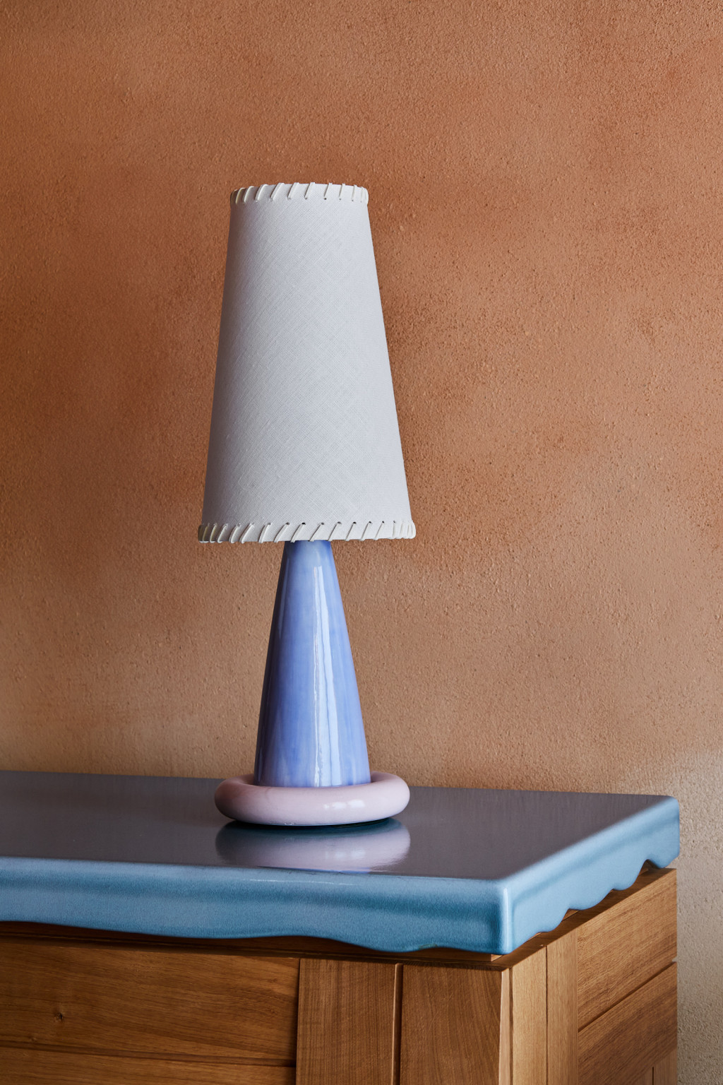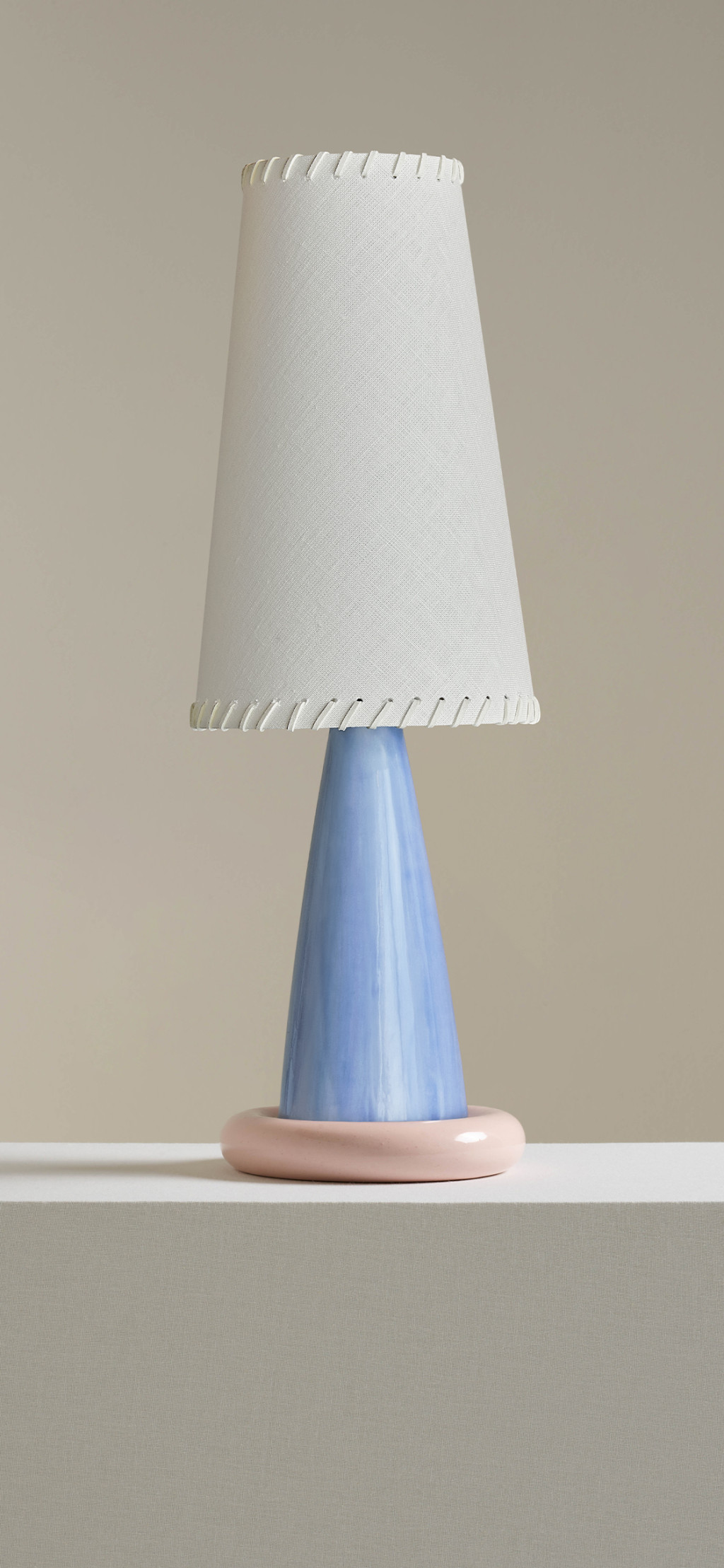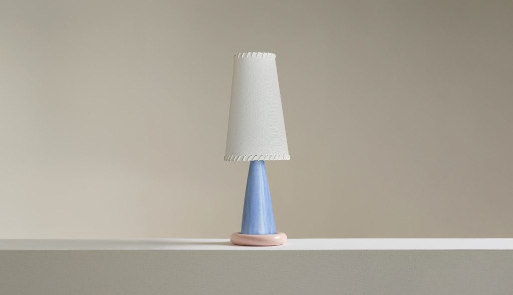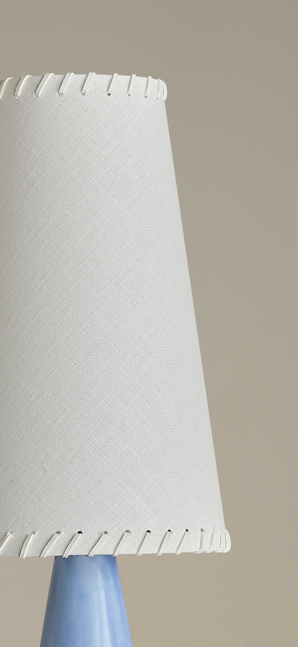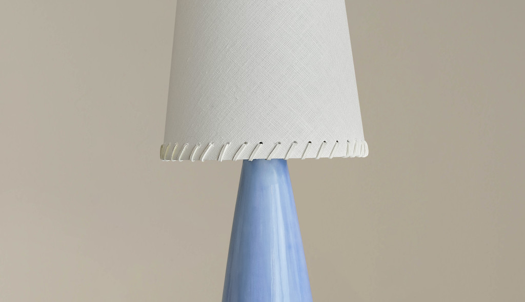 GLAZED CERAMIC TABLE LIGHT BASE WITH A LINEN SHADE WITH LEATHER WHIP-STITCH DETAIL.