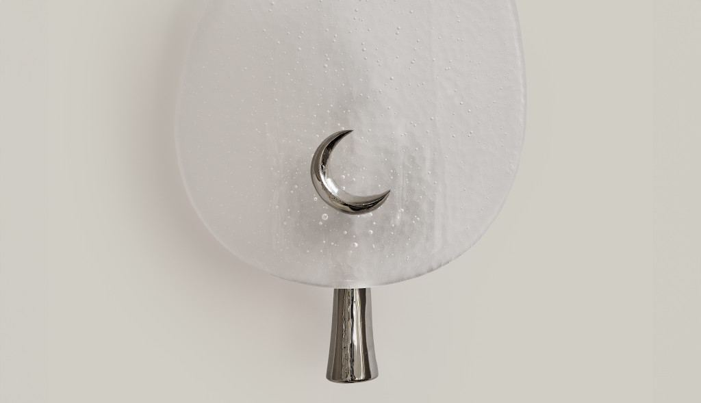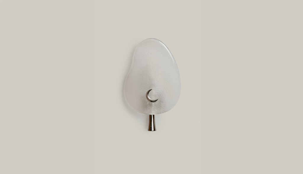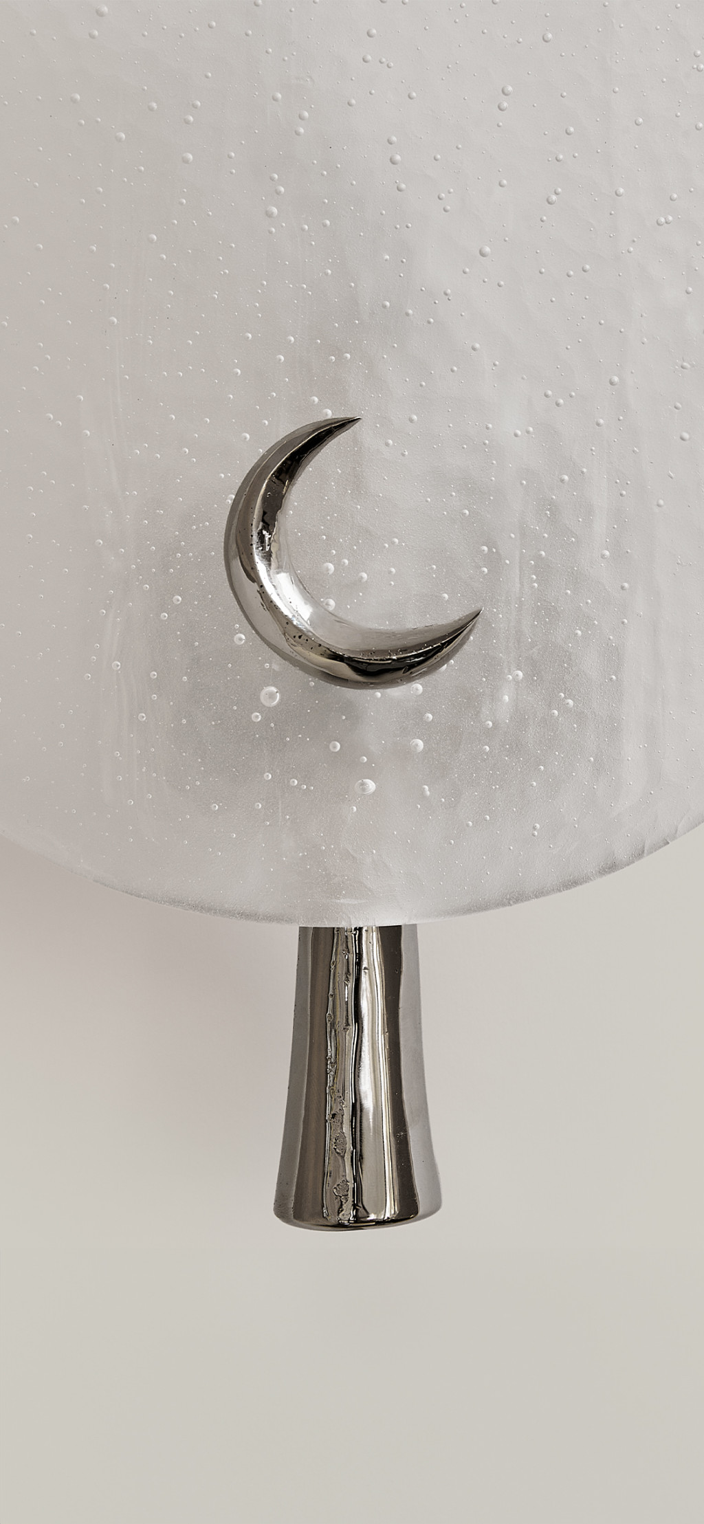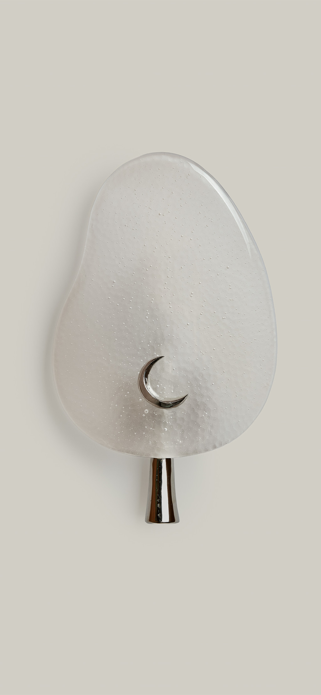 WALL LIGHT WITH A CAST GLASS SHADE AND NICKEL PLATED BRASS STEM.