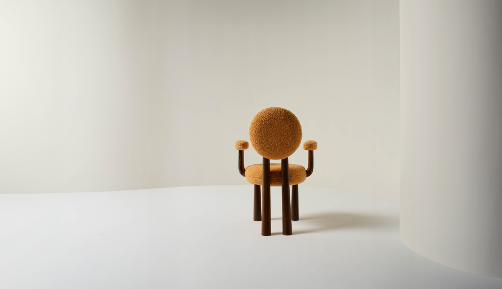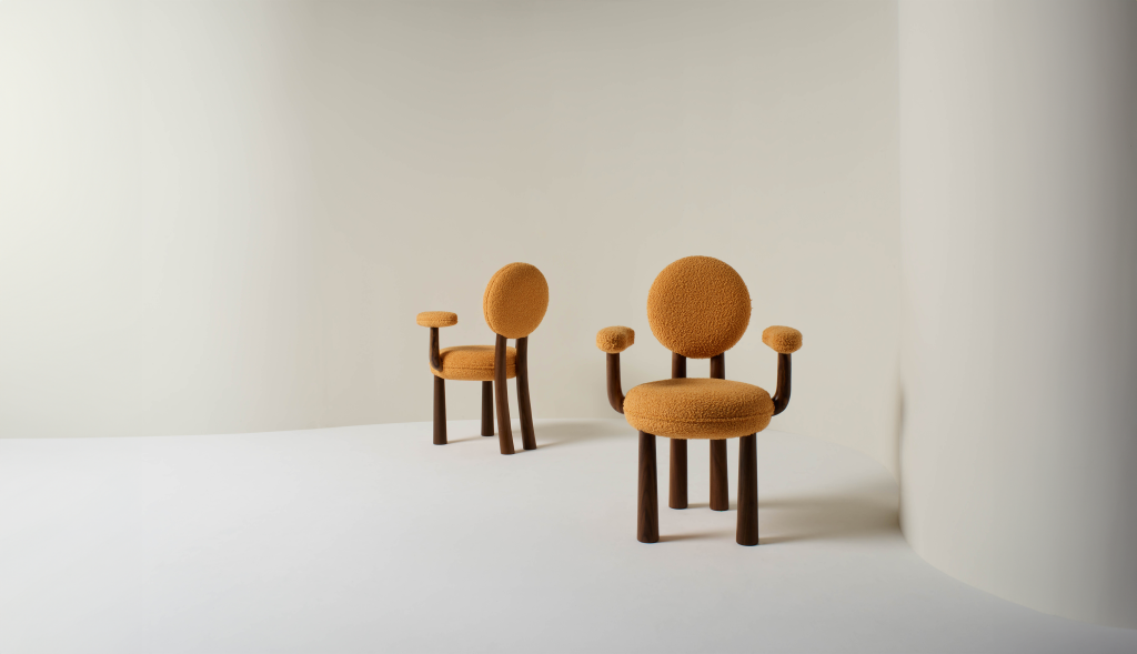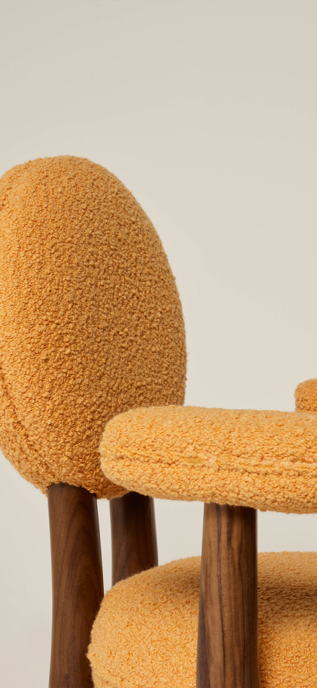 UPHOLSTERED DINING CHAIR WITH ARMS AND AMERICAN WALNUT LEGS.