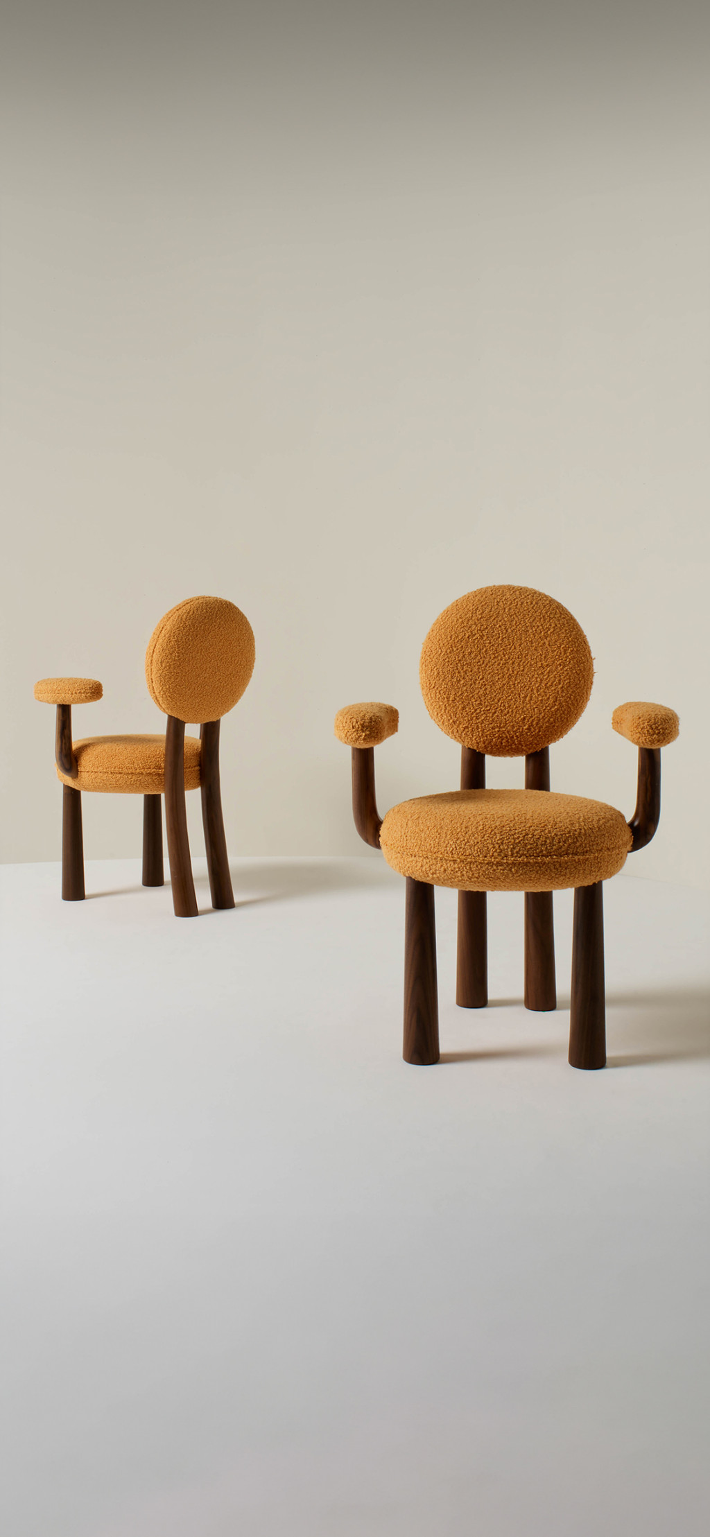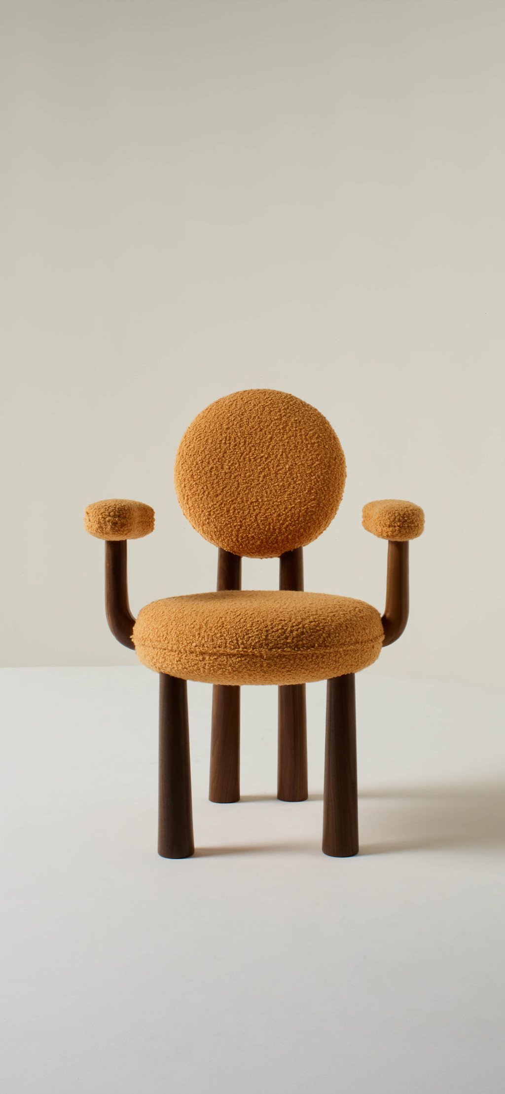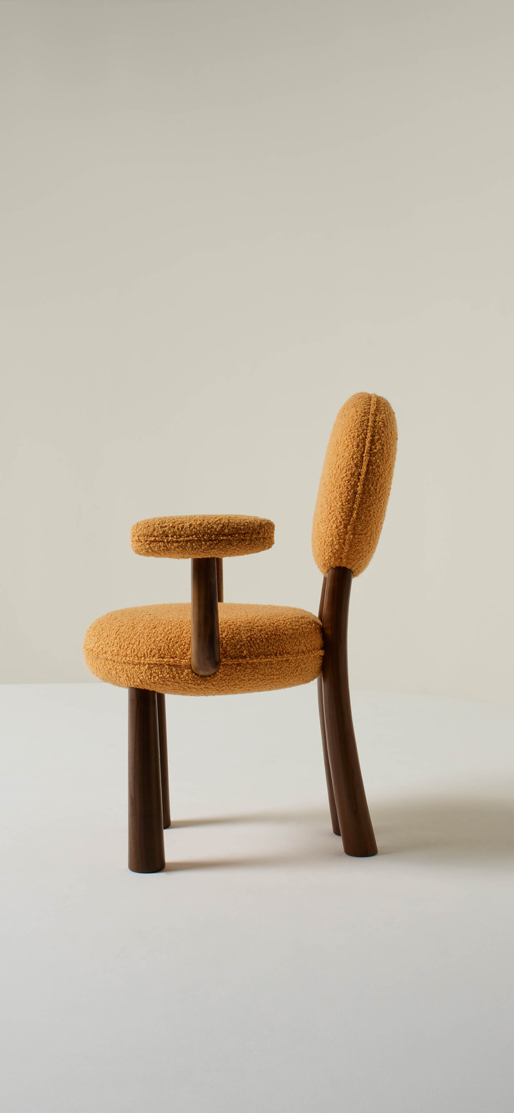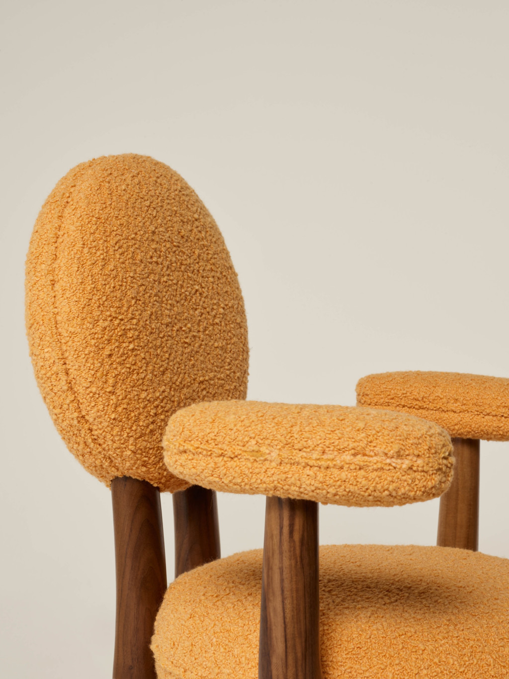 UPHOLSTERED DINING CHAIR WITH ARMS AND WALNUT LEGS.