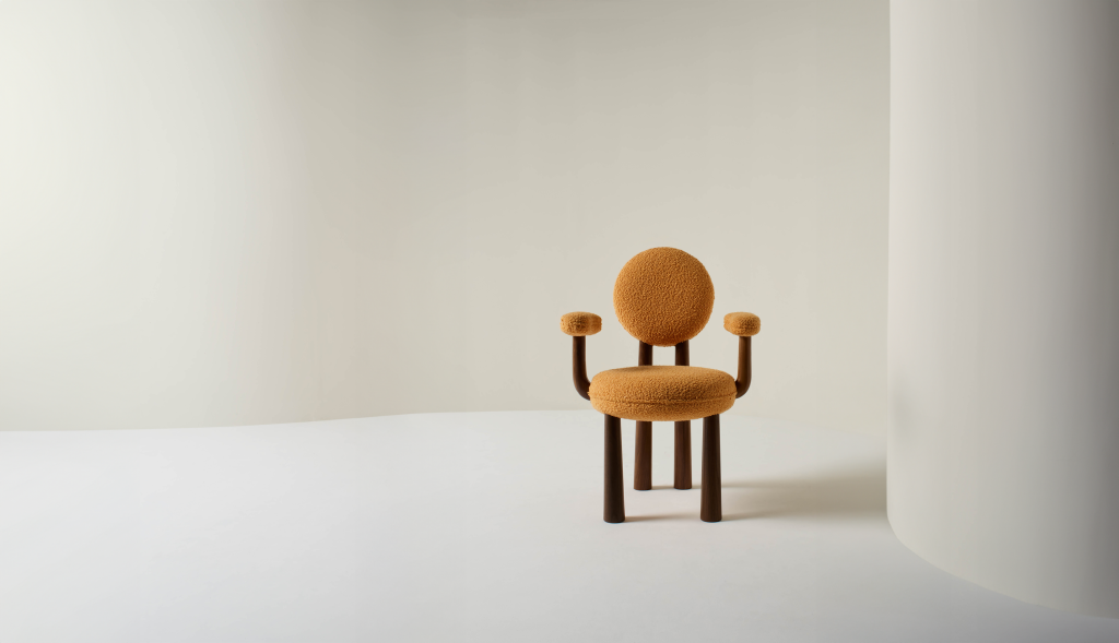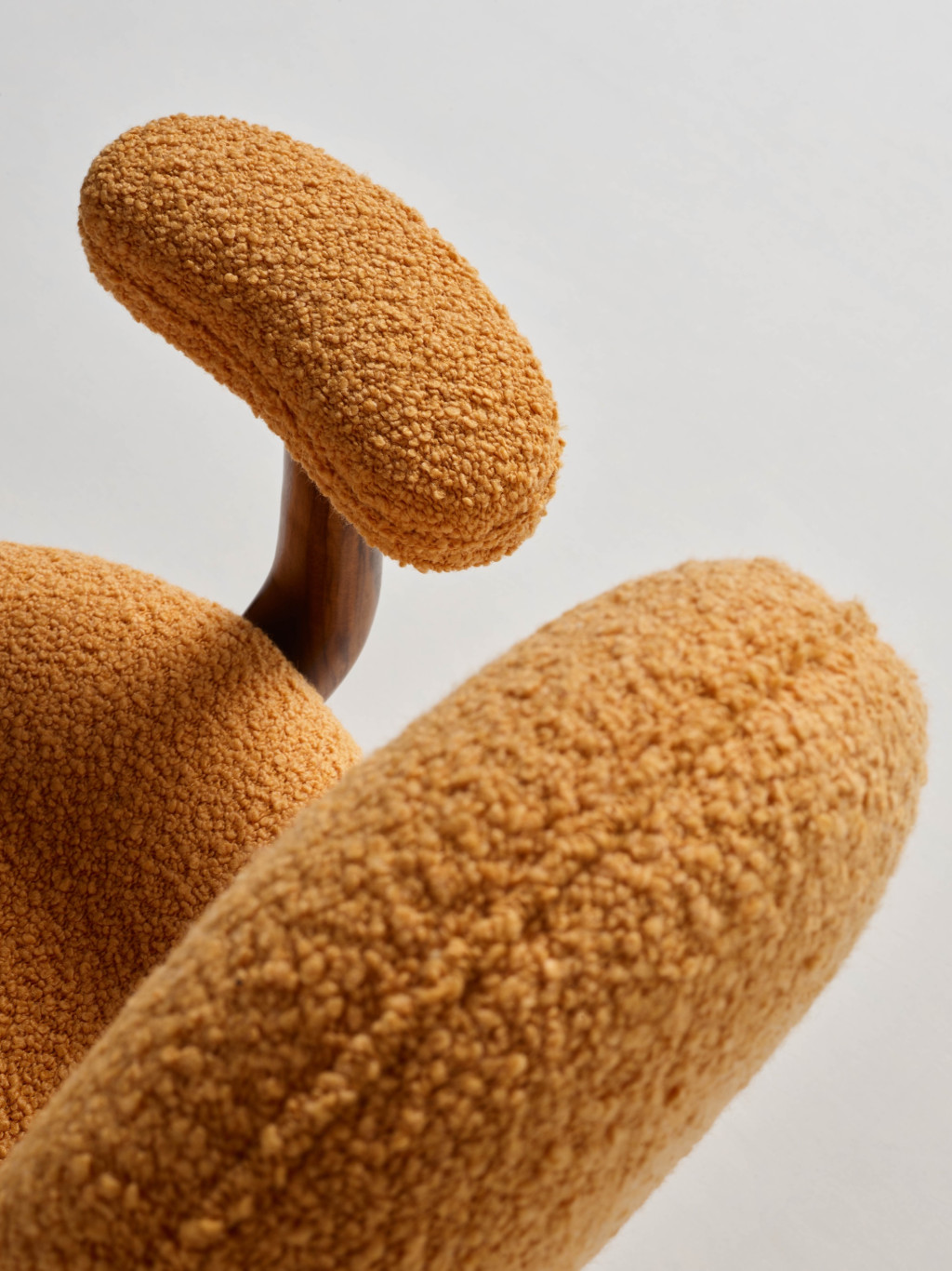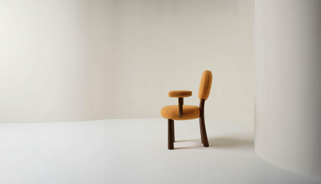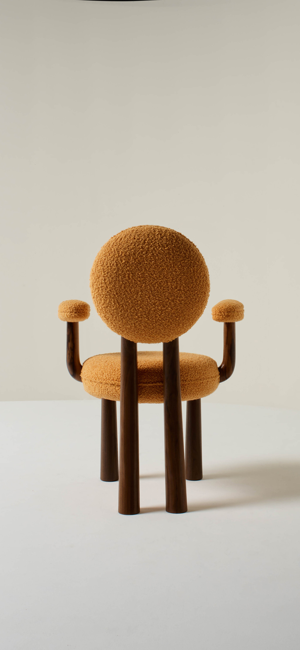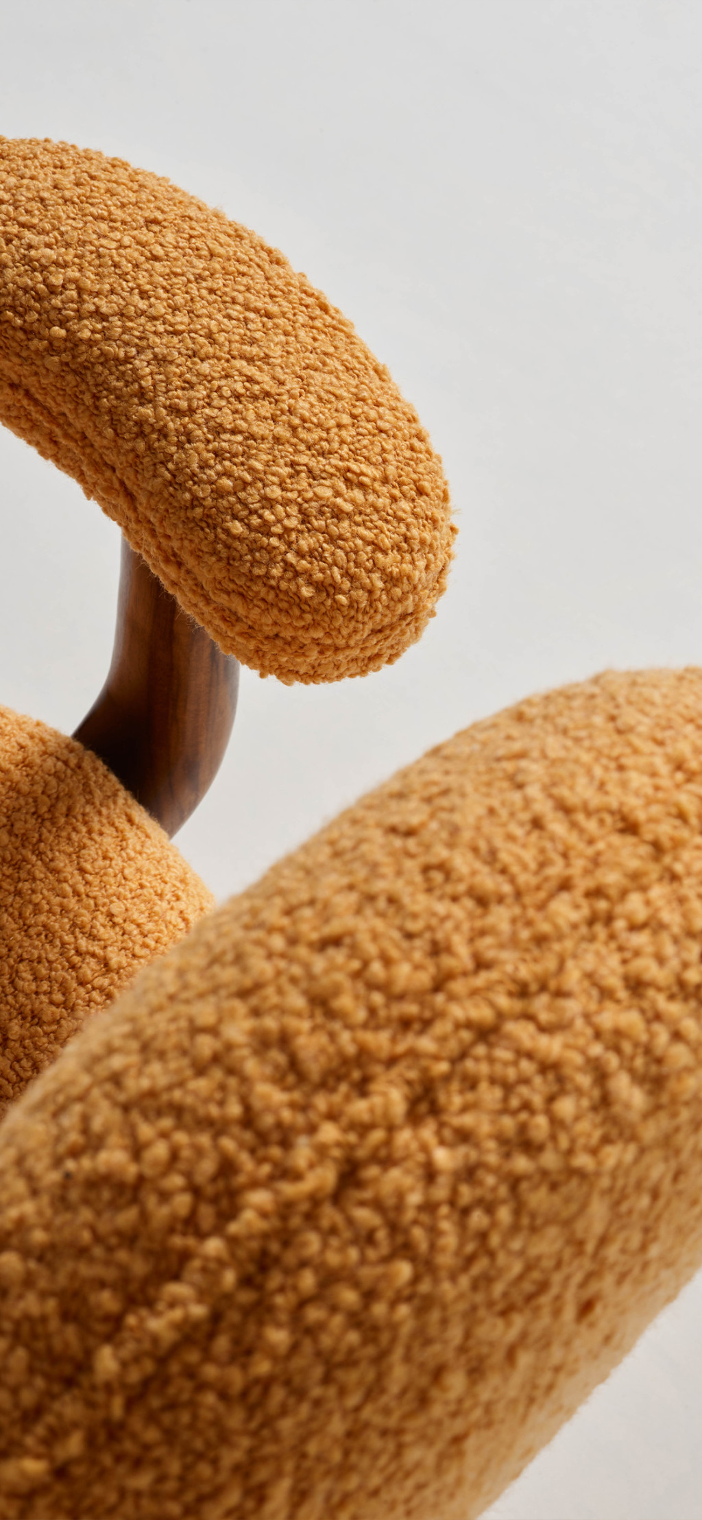 UPHOLSTERED DINING CHAIR WITH ARMS AND WALNUT LEGS.