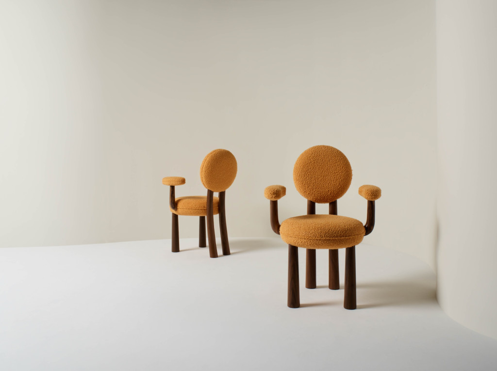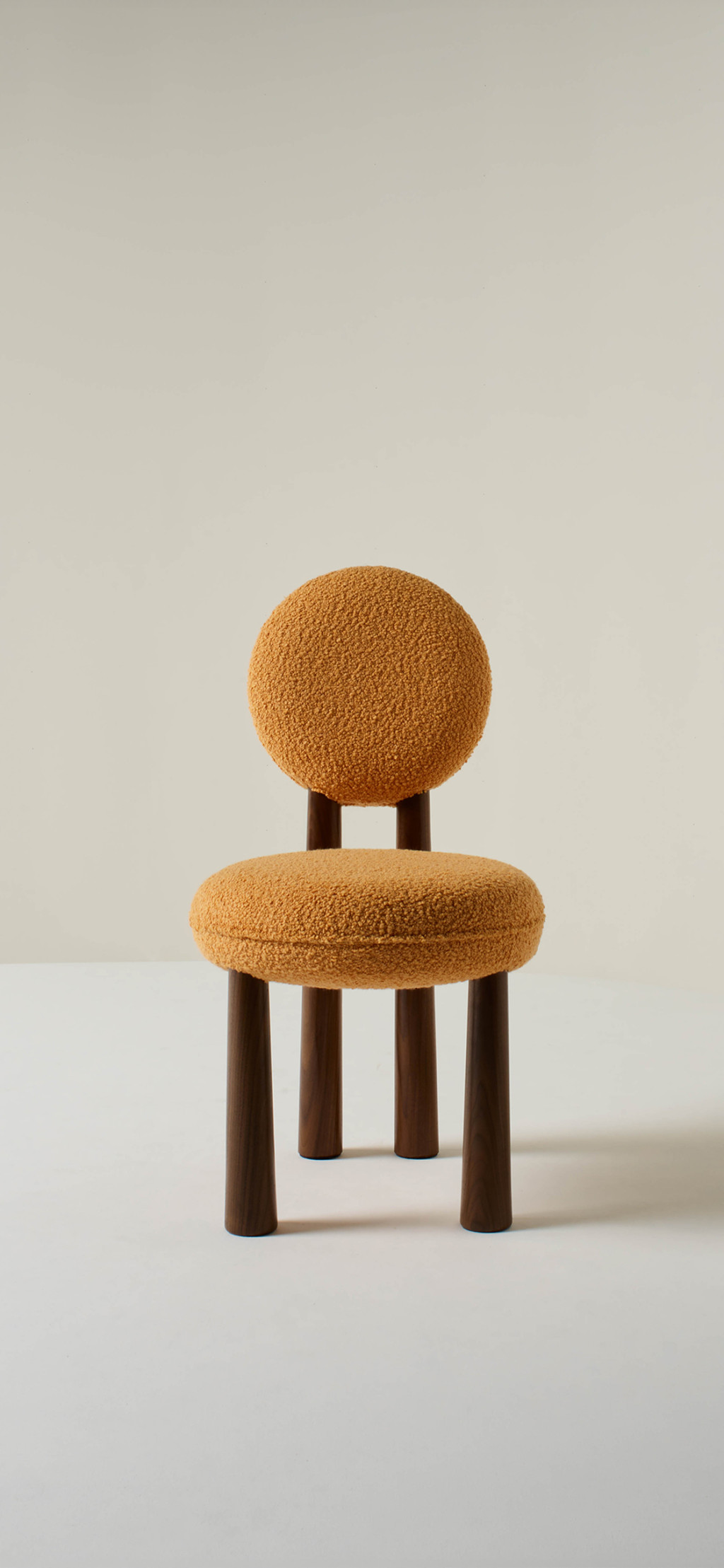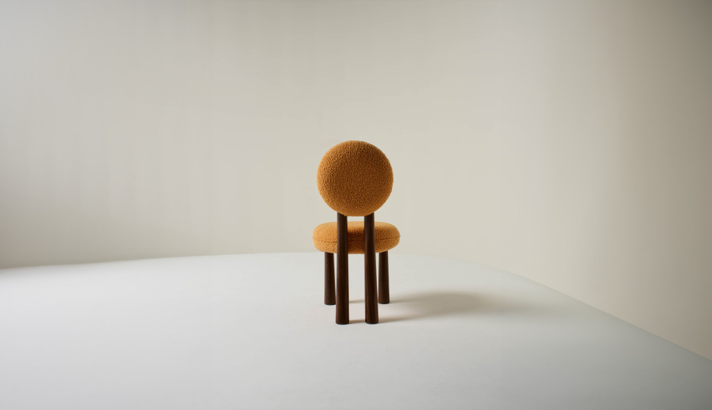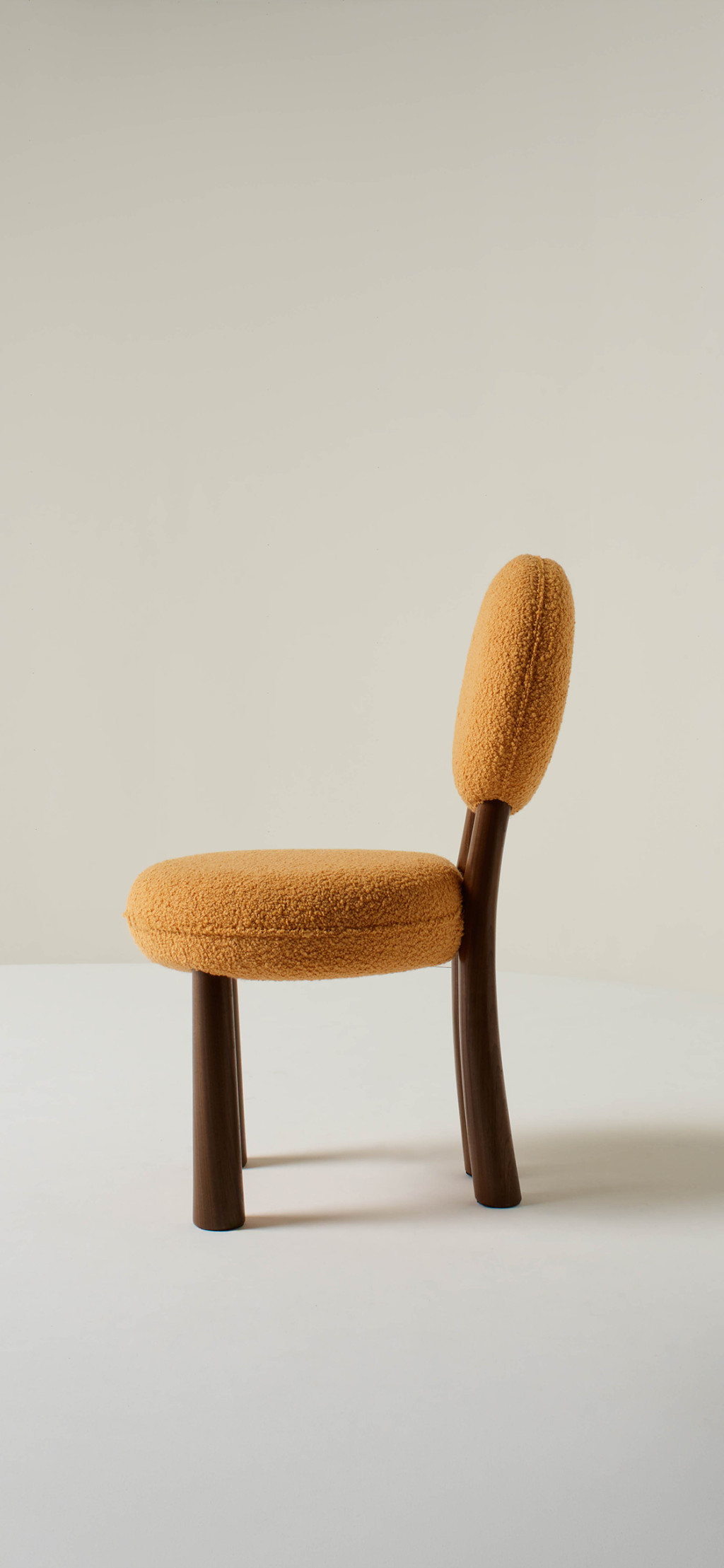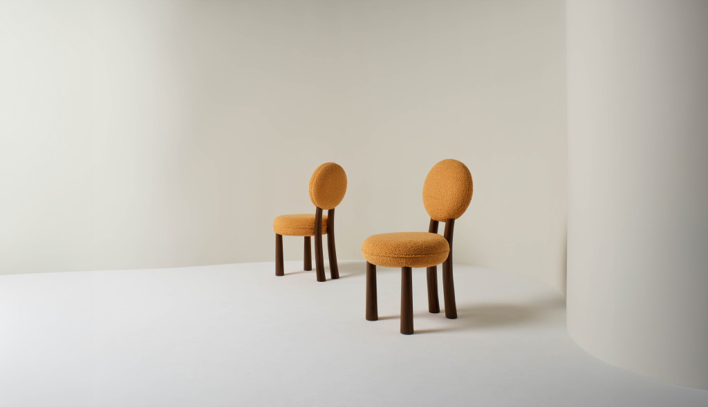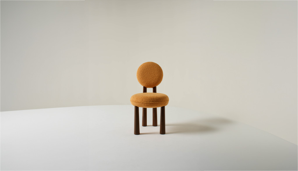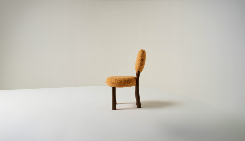 UPHOLSTERED DINING CHAIR WITH WALNUT LEGS.