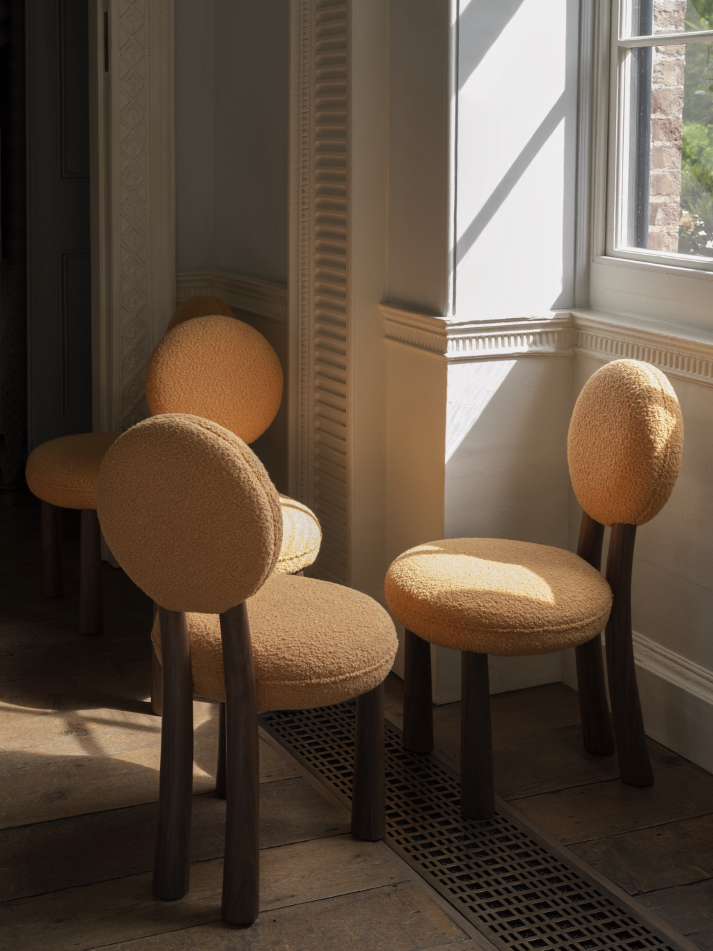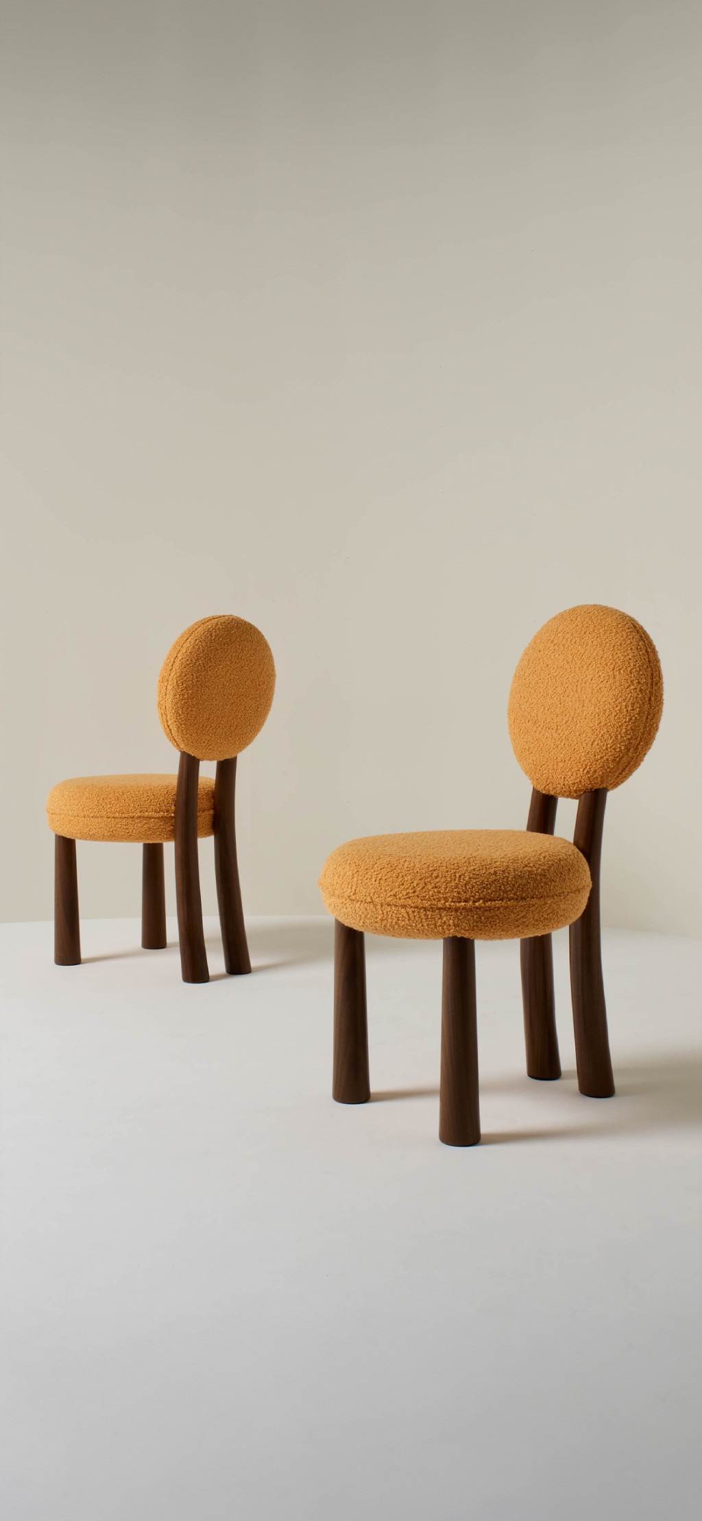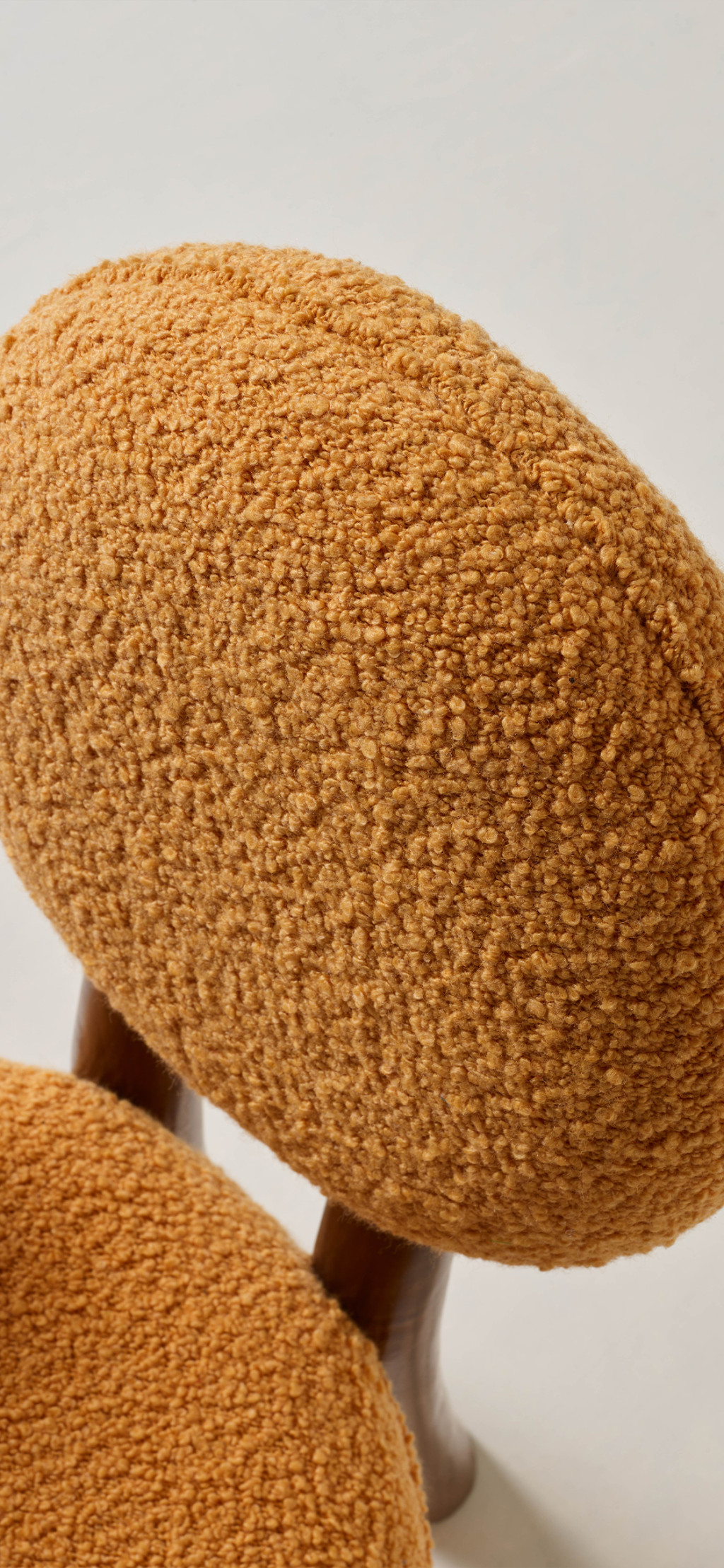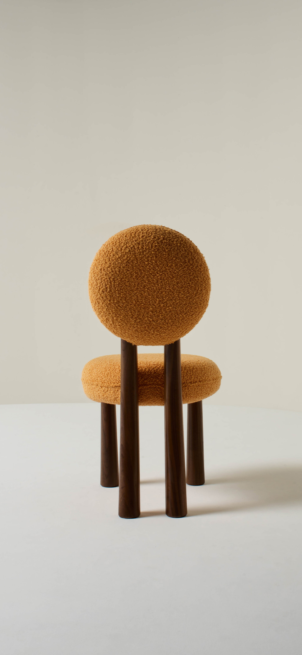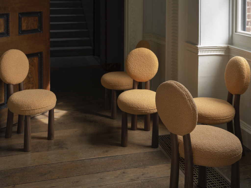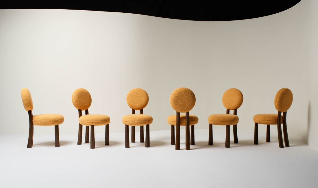 UPHOLSTERED DINING CHAIR WITH WALNUT LEGS.