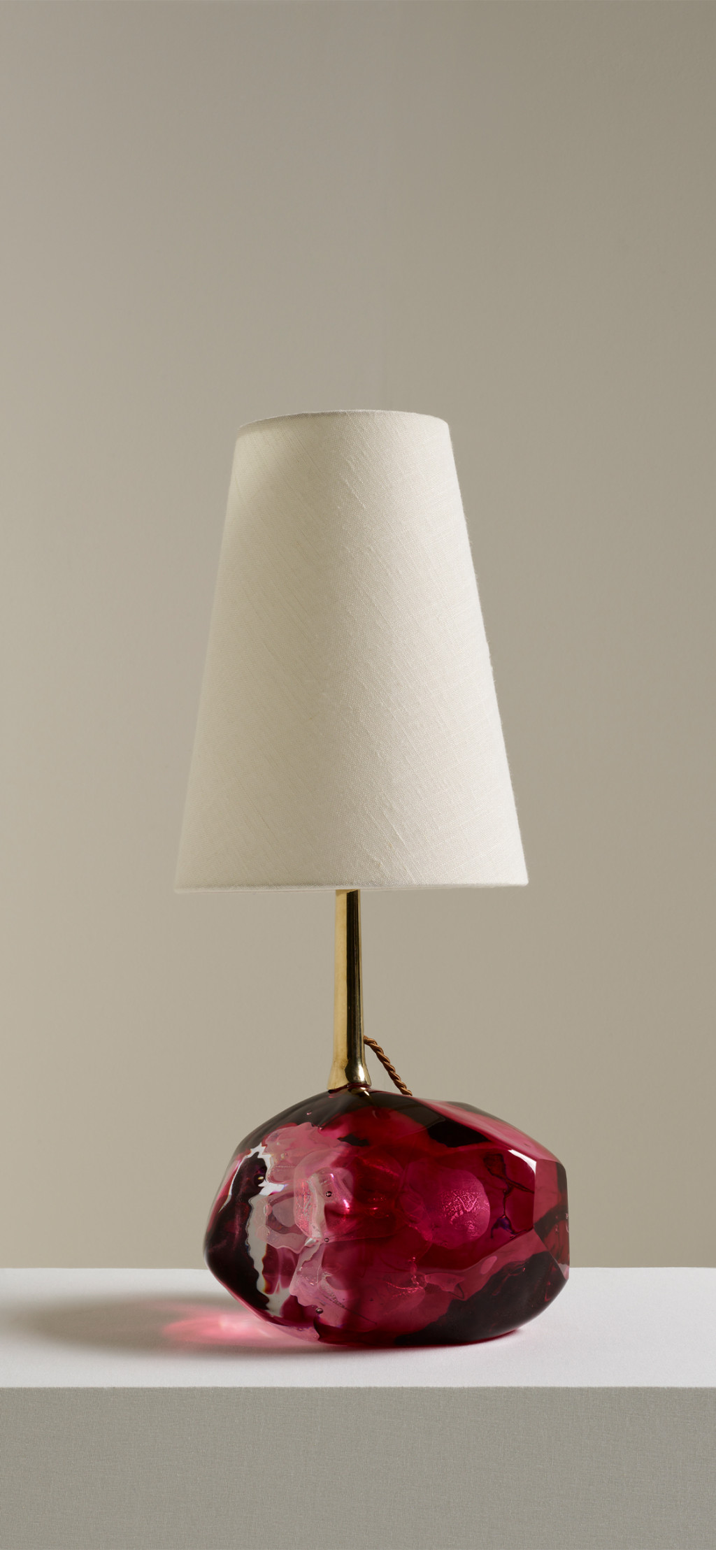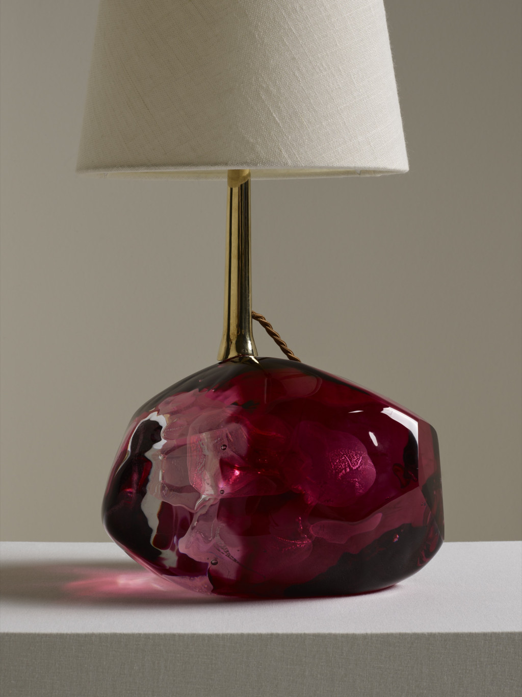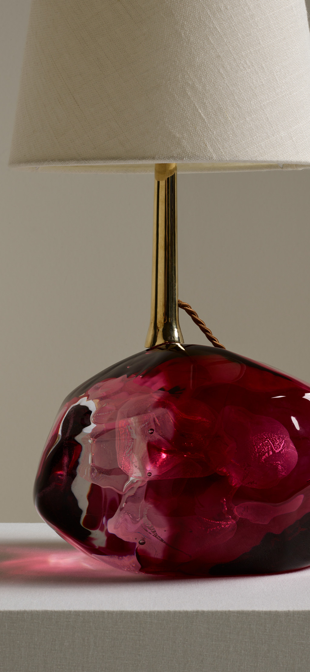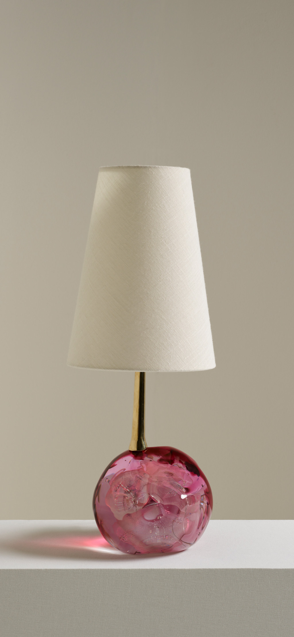 HAND-FORMED GLASS TABLE LIGHTS WITH CAST BRASS STEM AND LINEN SHADE.