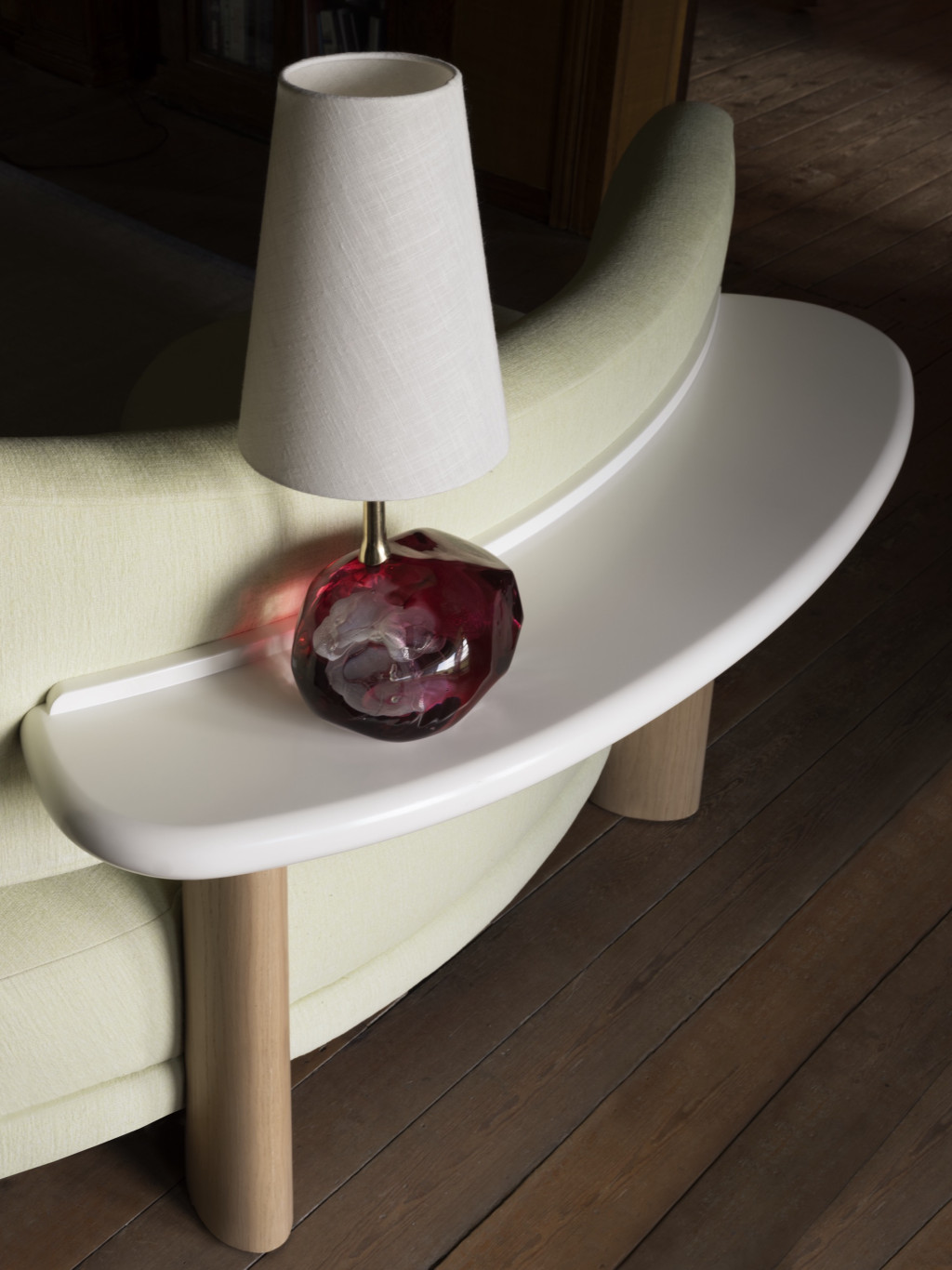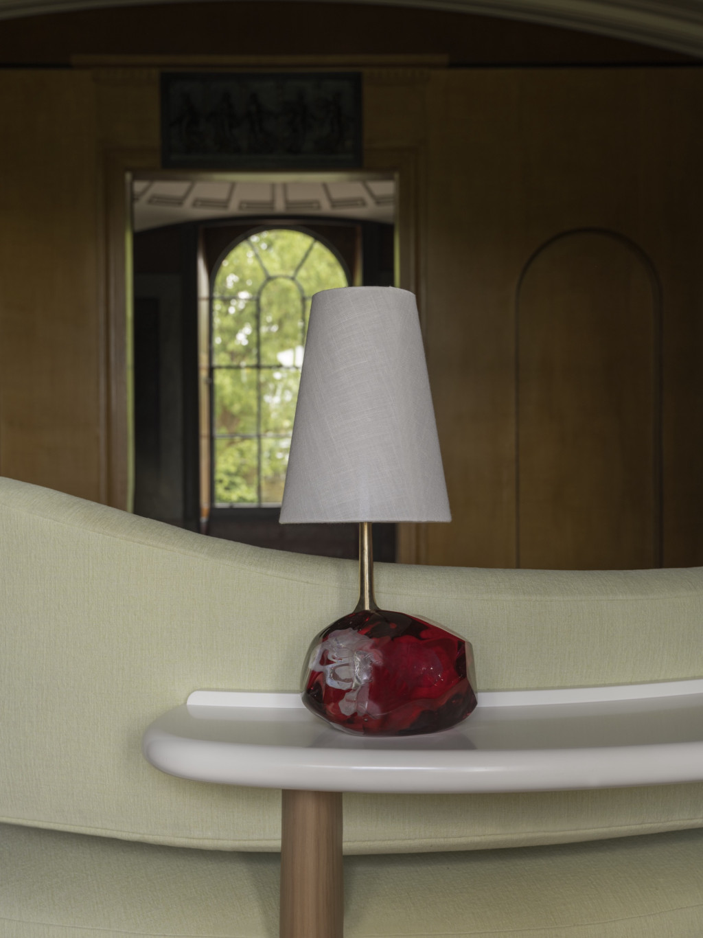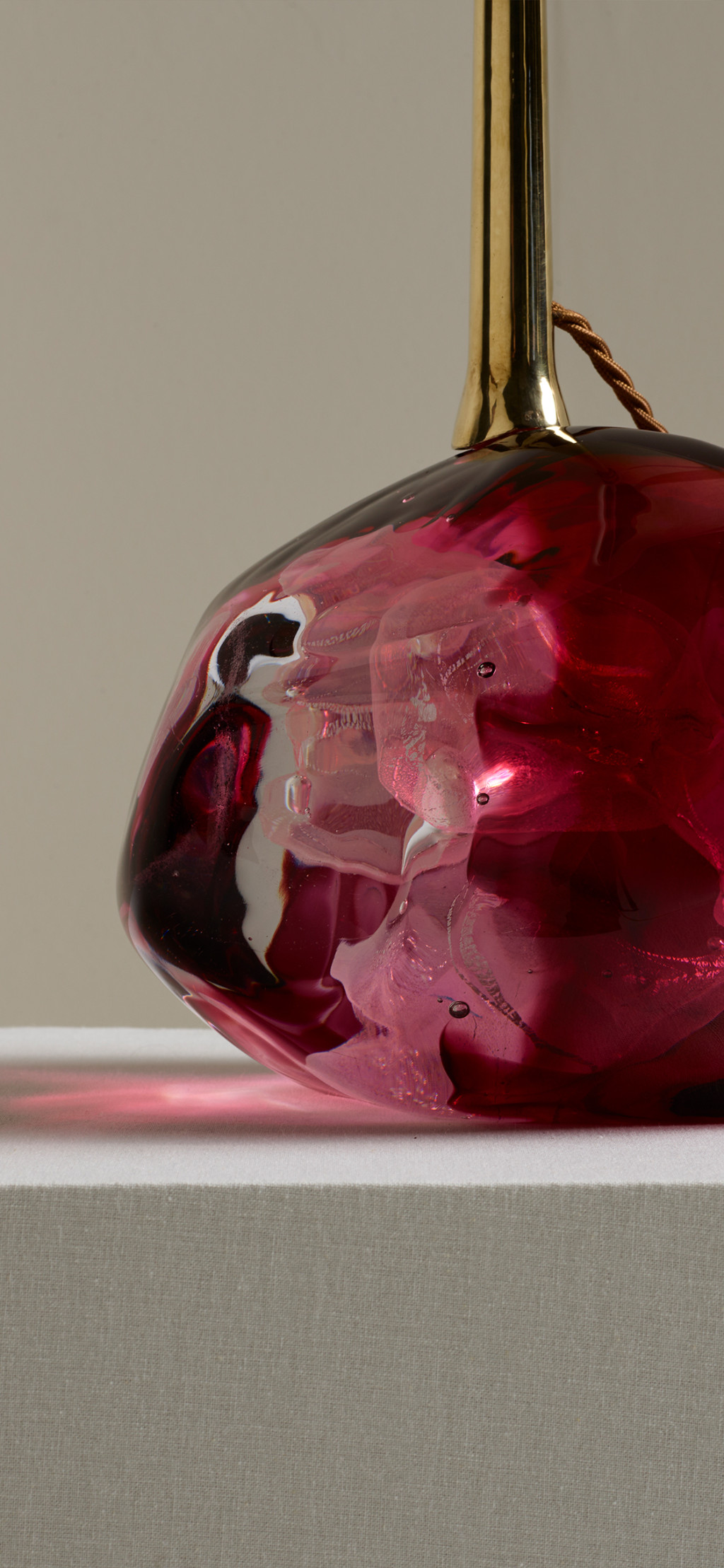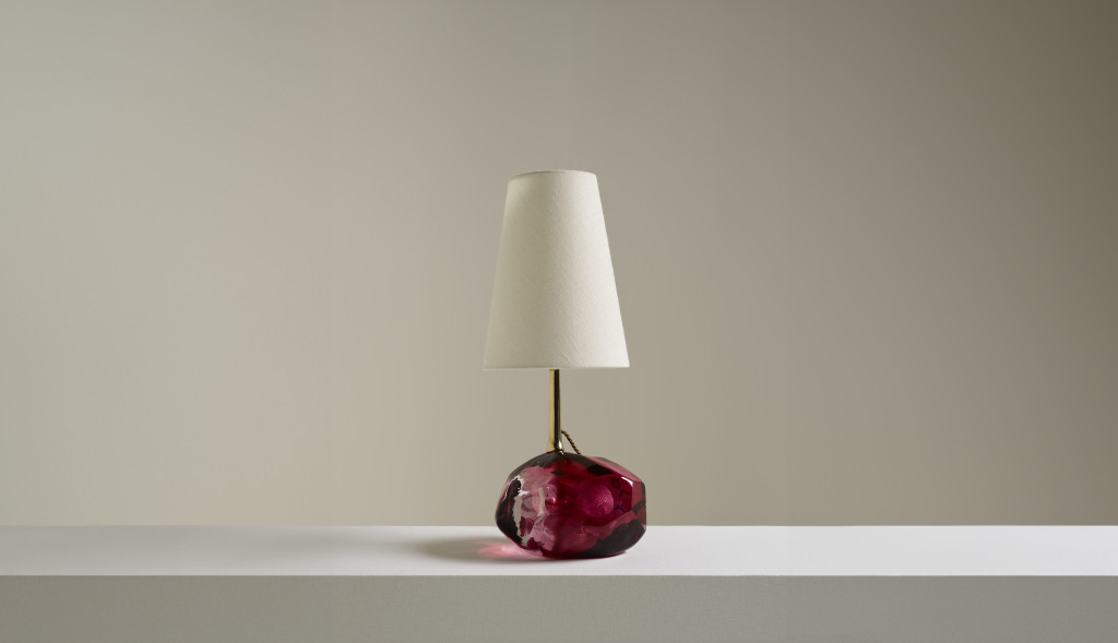 HAND-FORMED GLASS TABLE LIGHTS WITH CAST BRASS STEM AND LINEN SHADE.