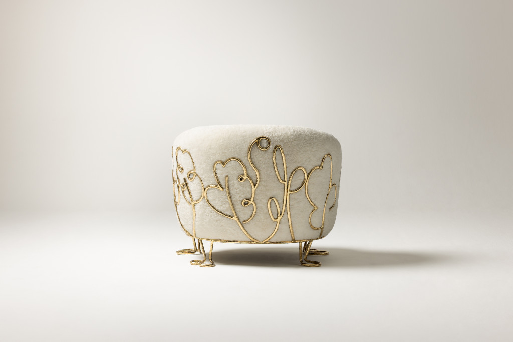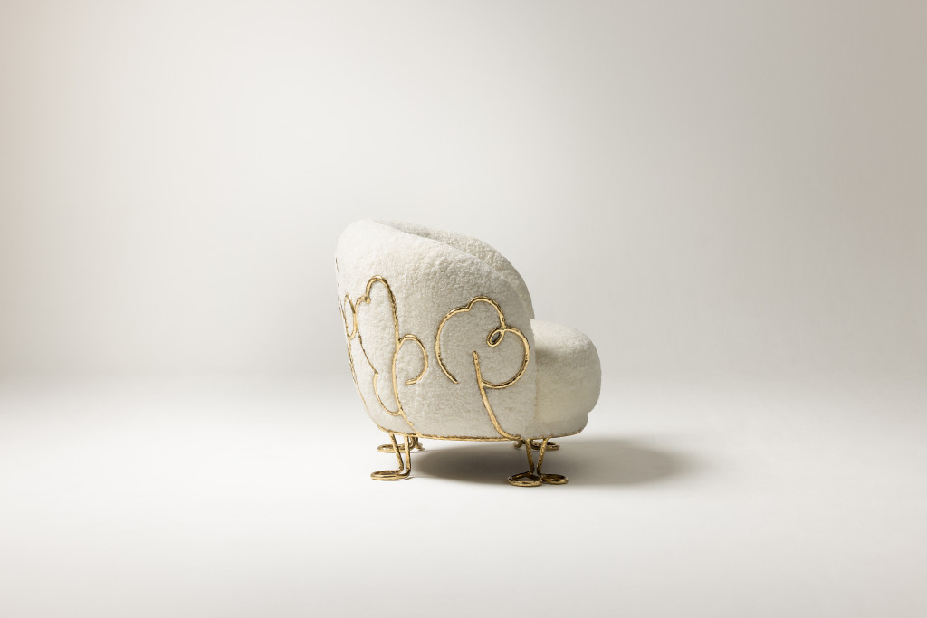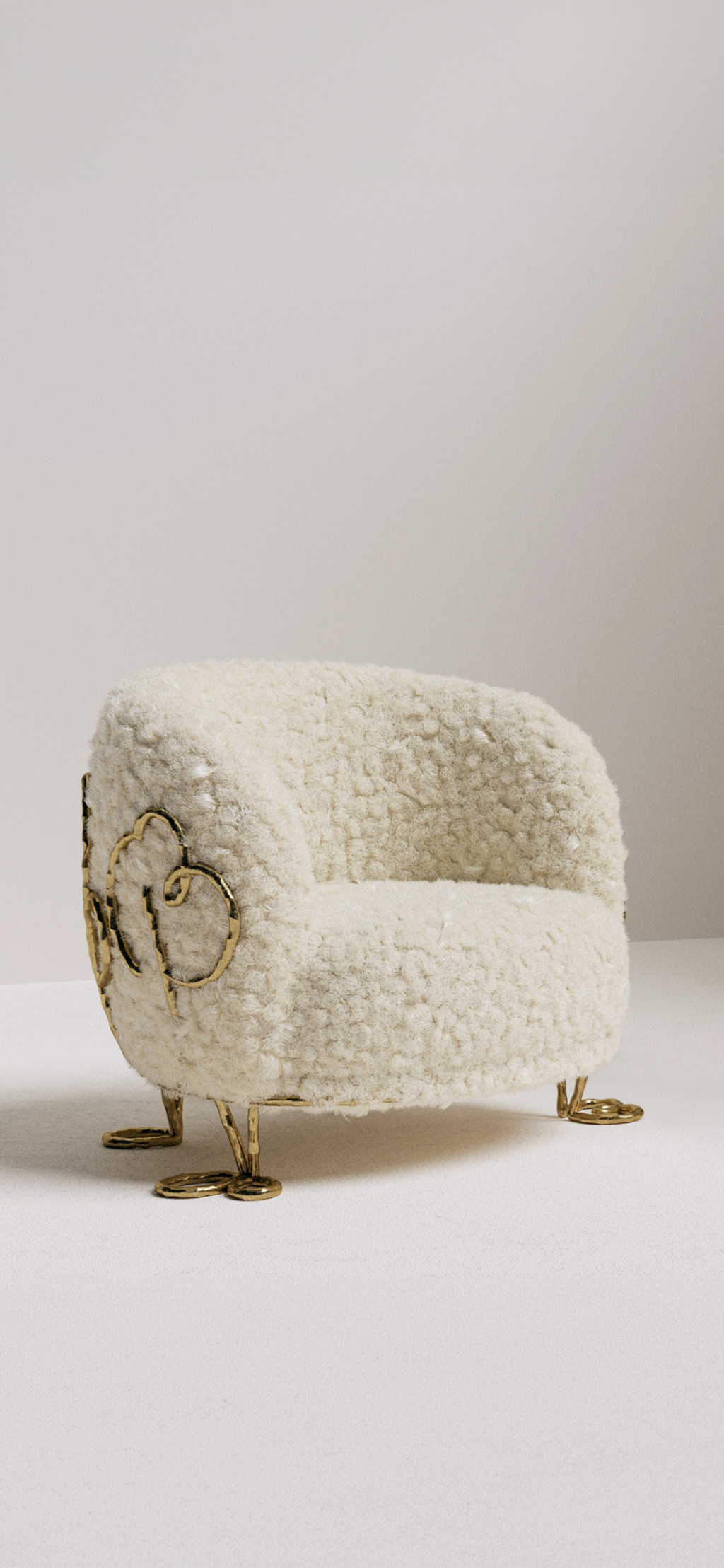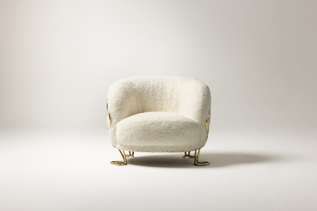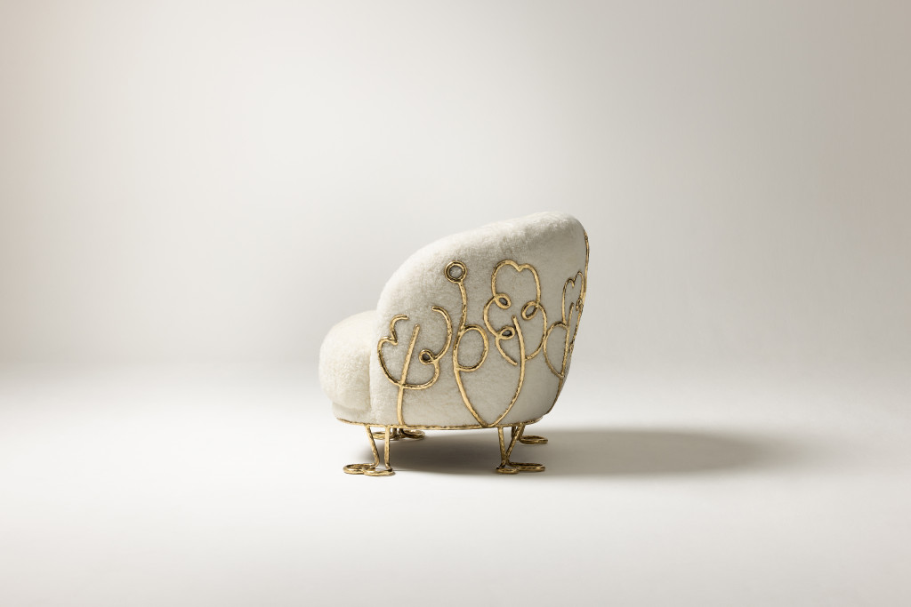 BRASS-PLATED HAND-FORGED STEEL ARMCHAIR FRAME WITH AN UPHOLSTERED SEAT.