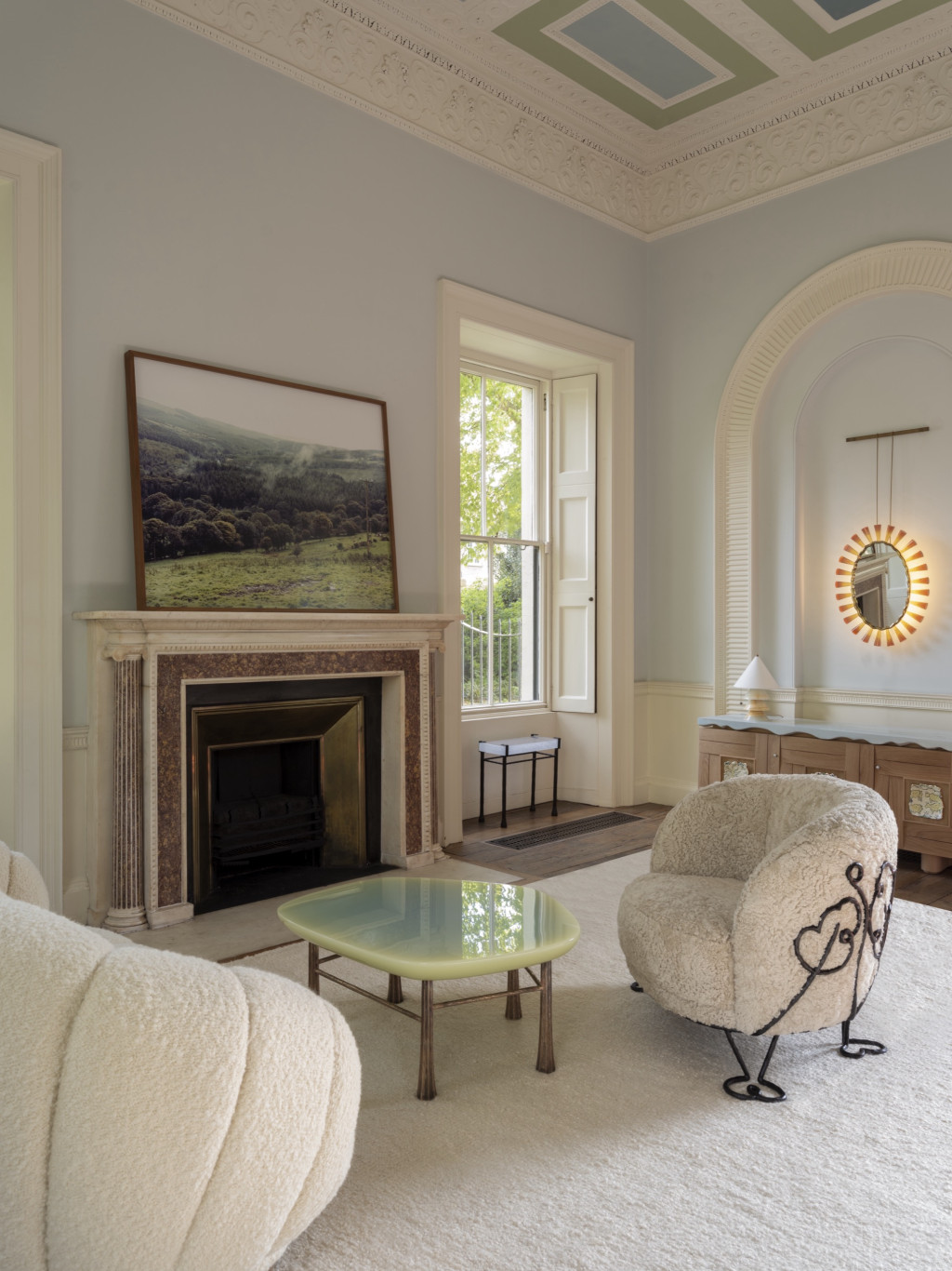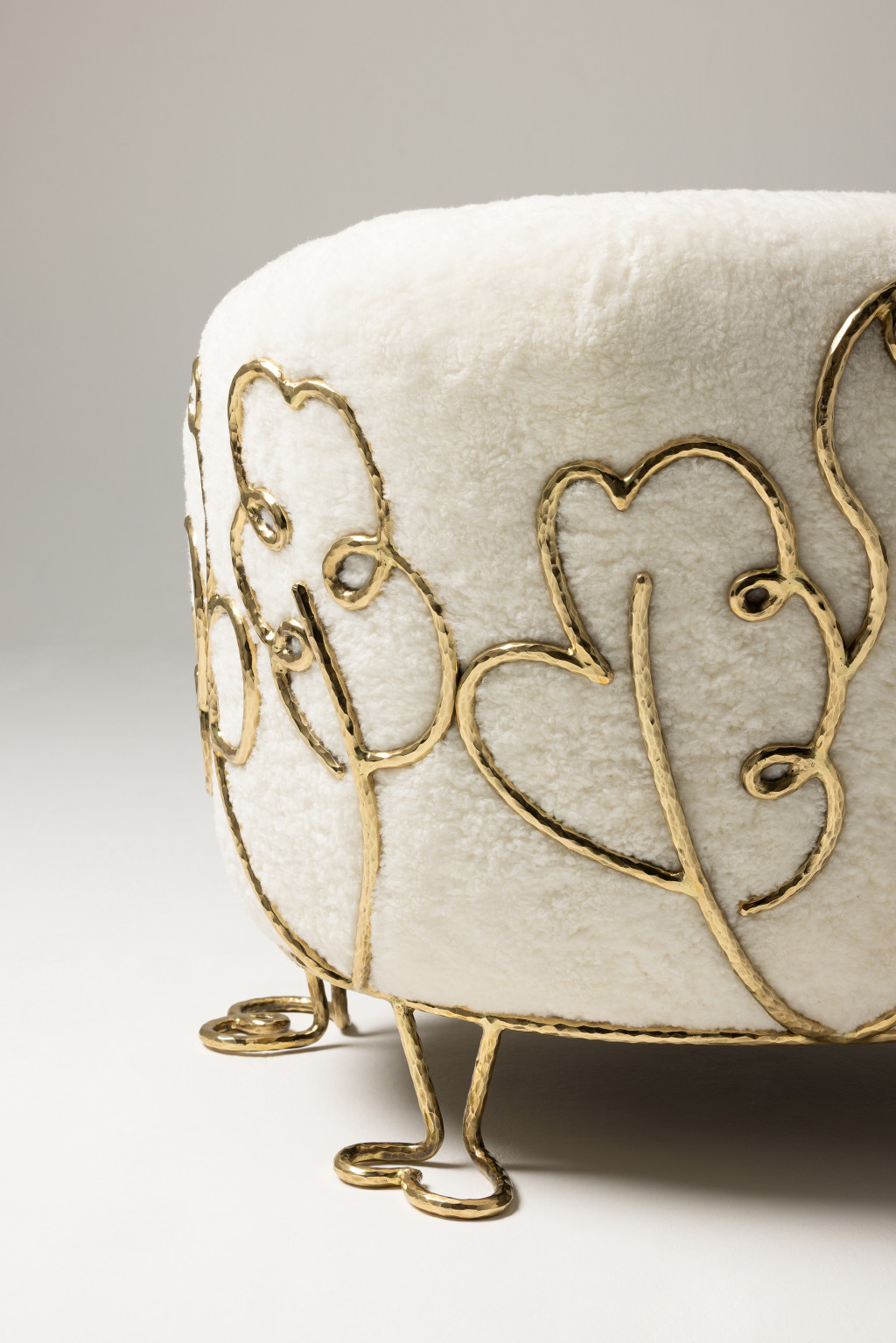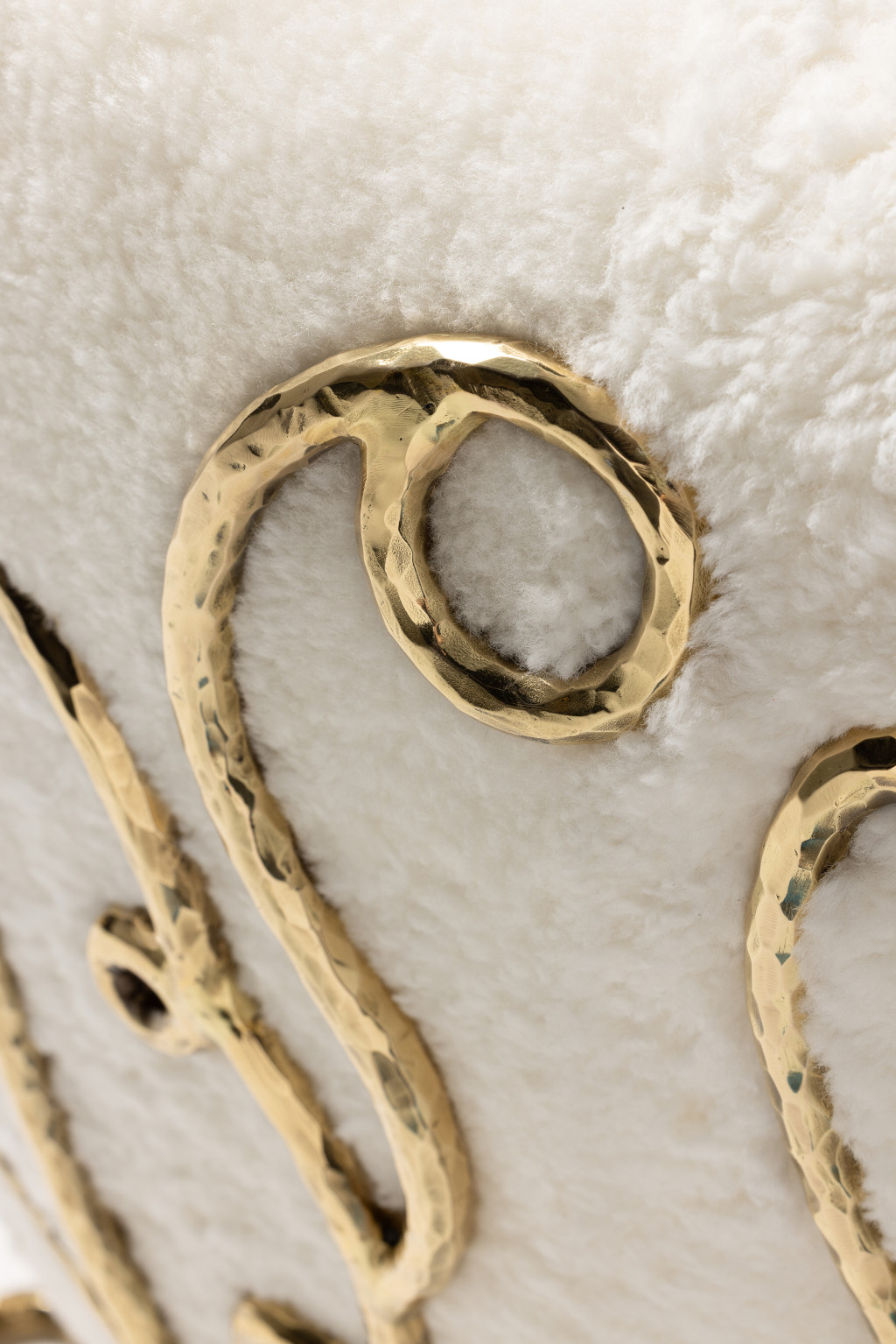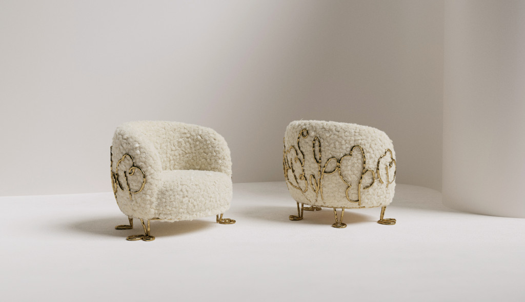 BRASS-PLATED HAND-FORGED STEEL ARMCHAIR FRAME WITH AN UPHOLSTERED SEAT.