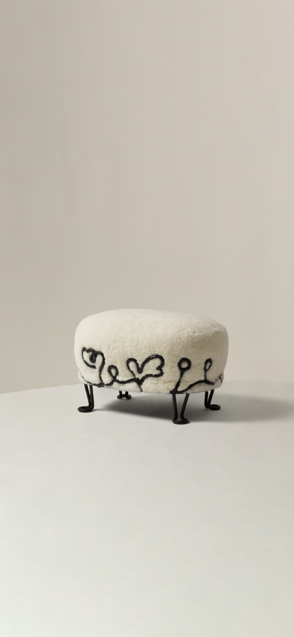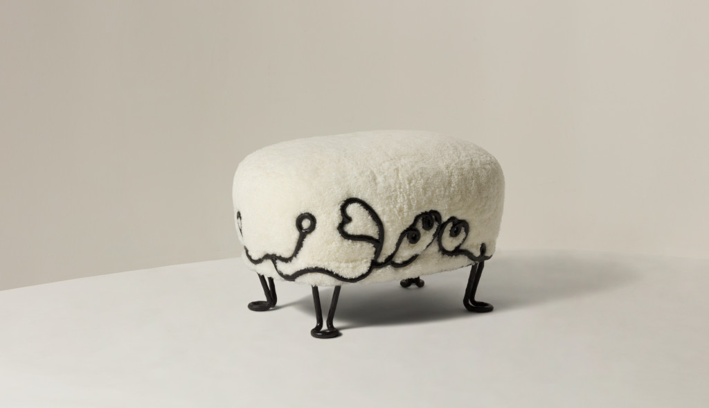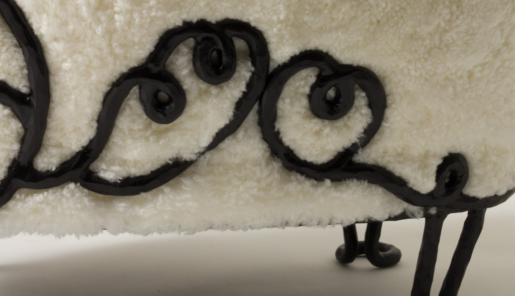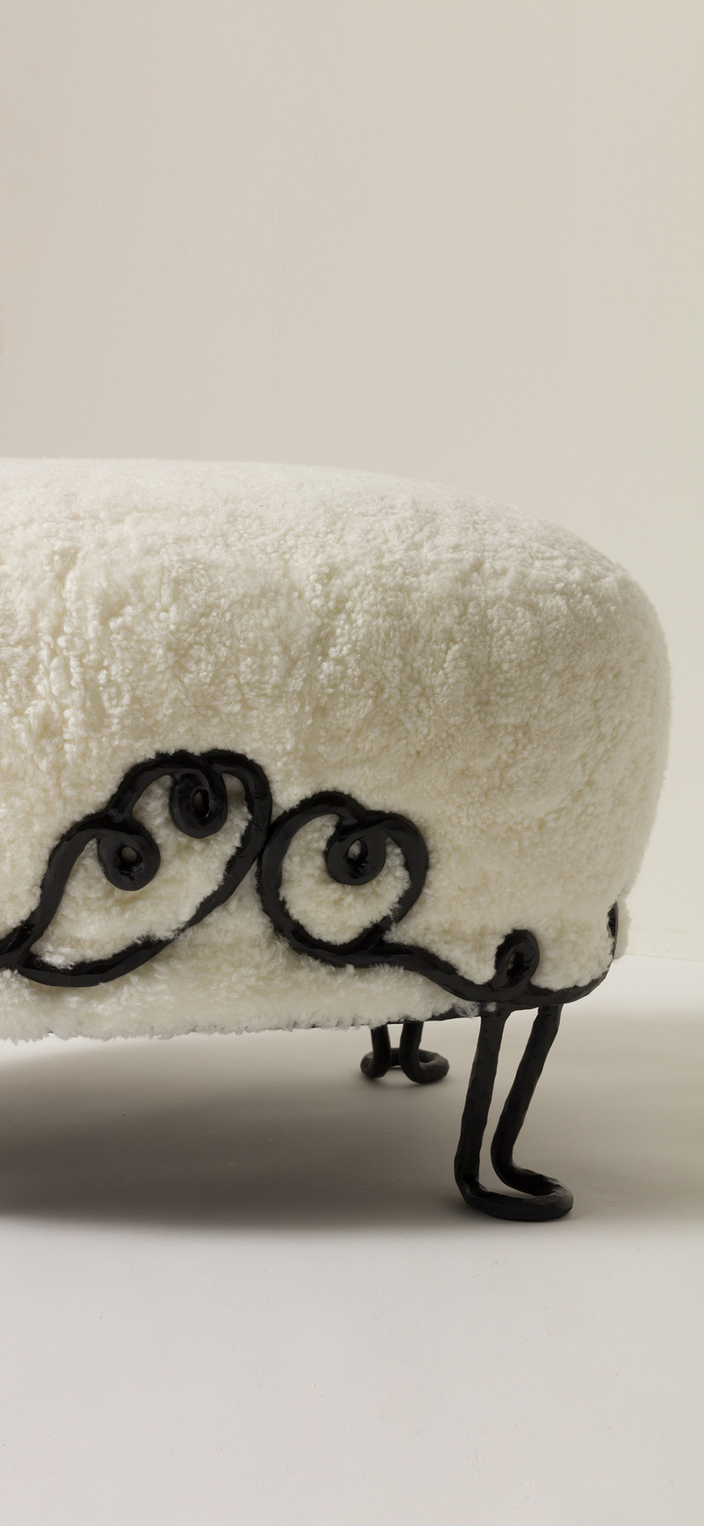 HAND FORGED STEEL OTTOMAN FRAME WITH AN UPHOLSTERED SEAT.