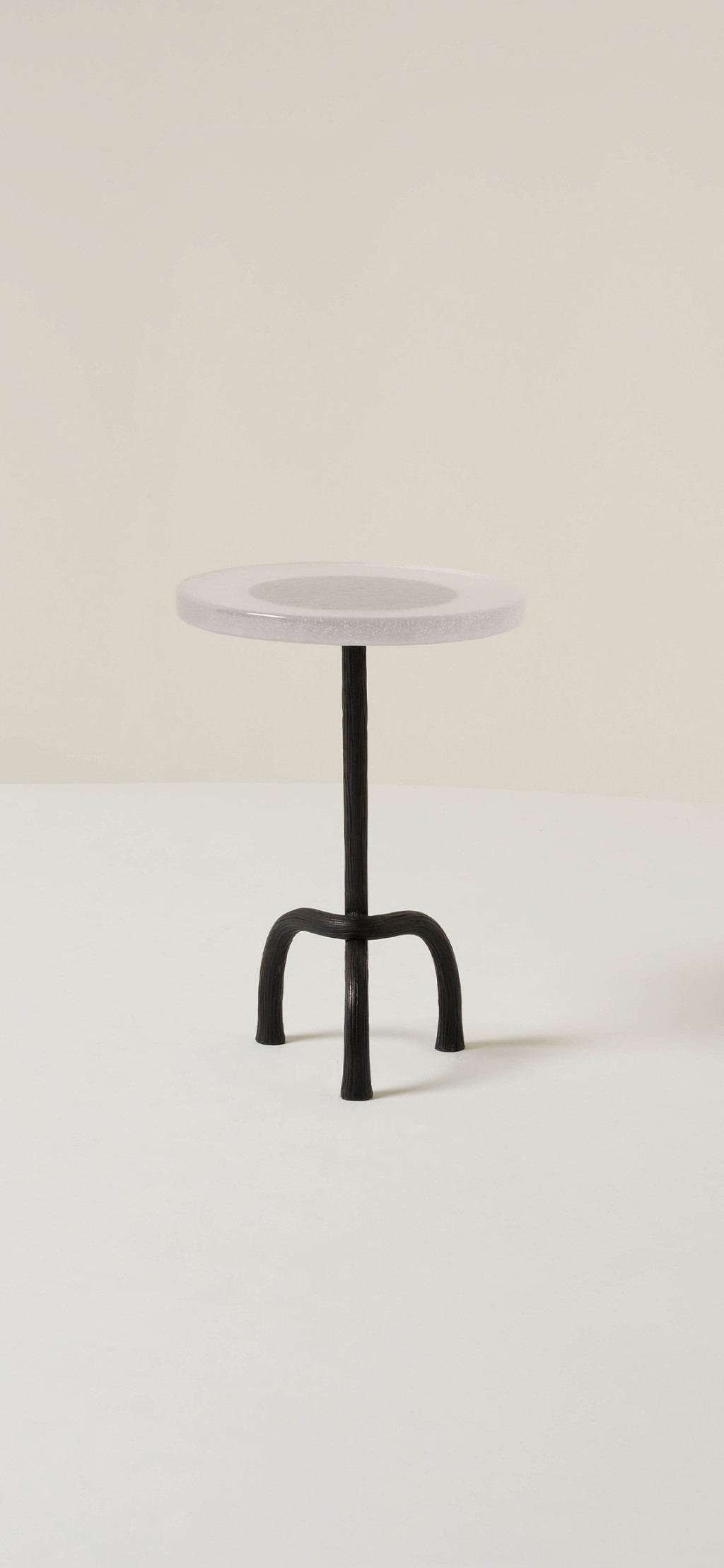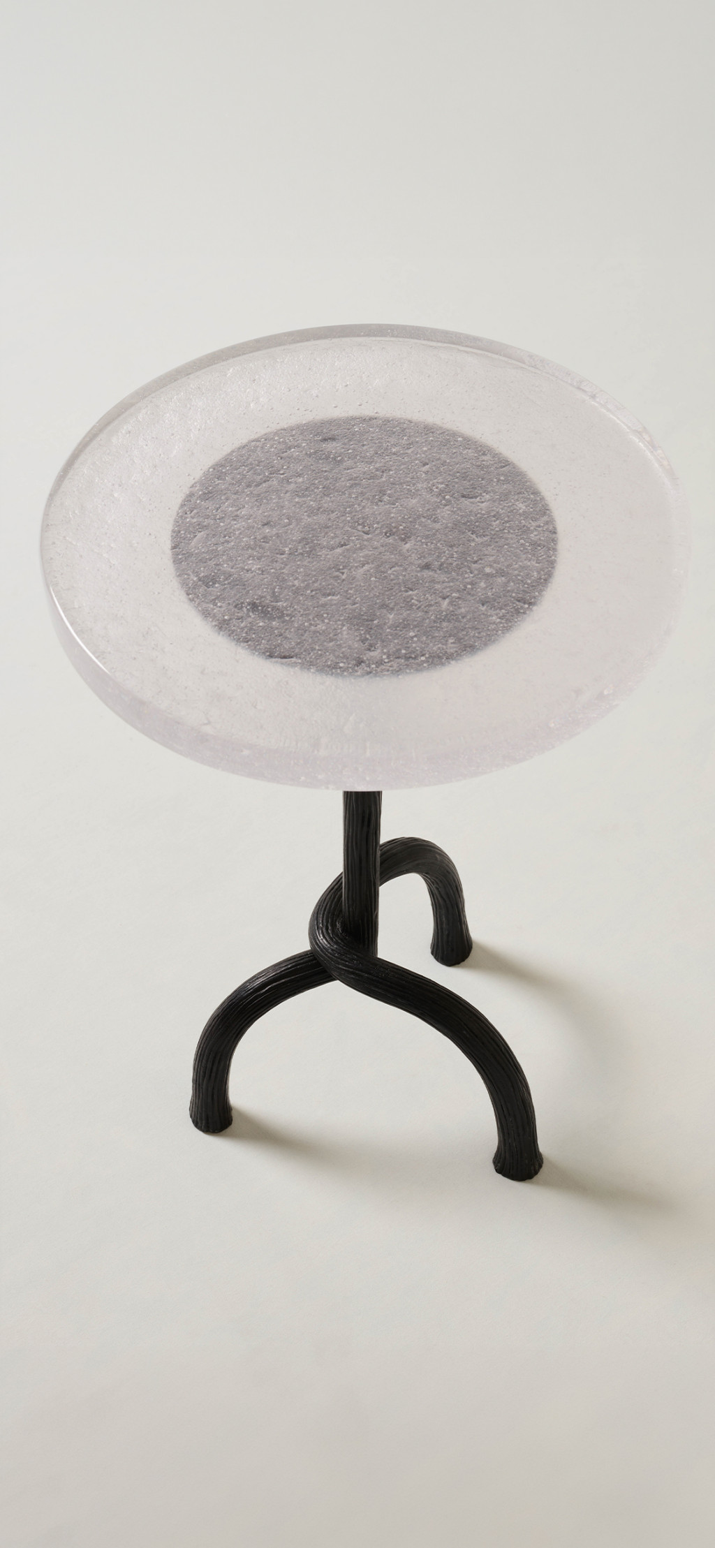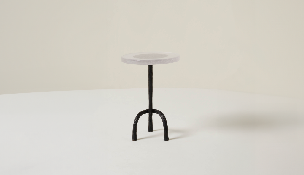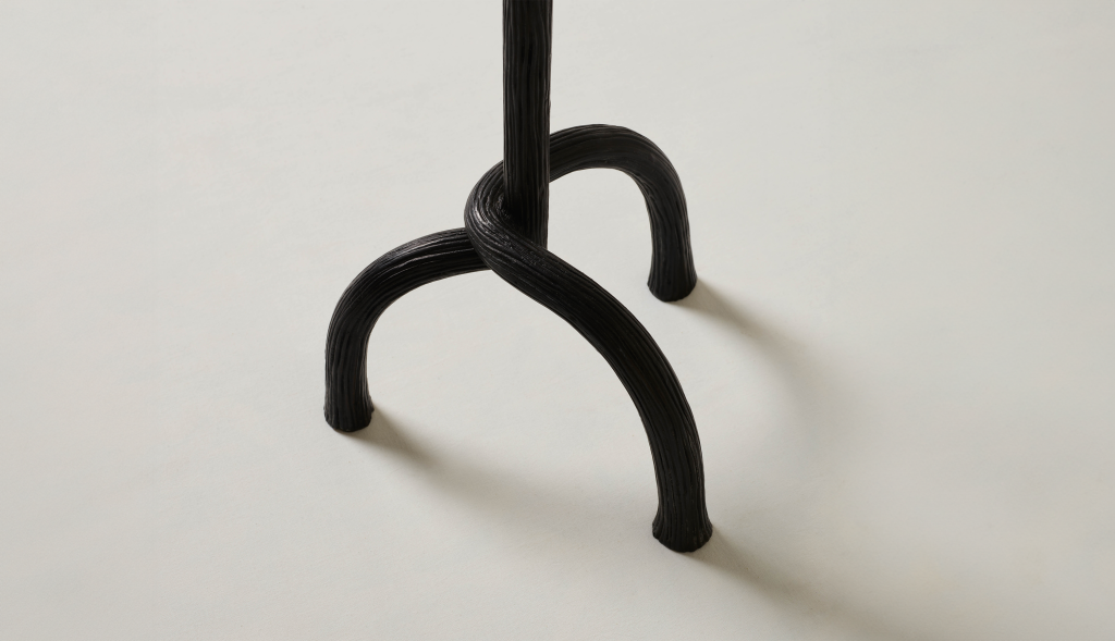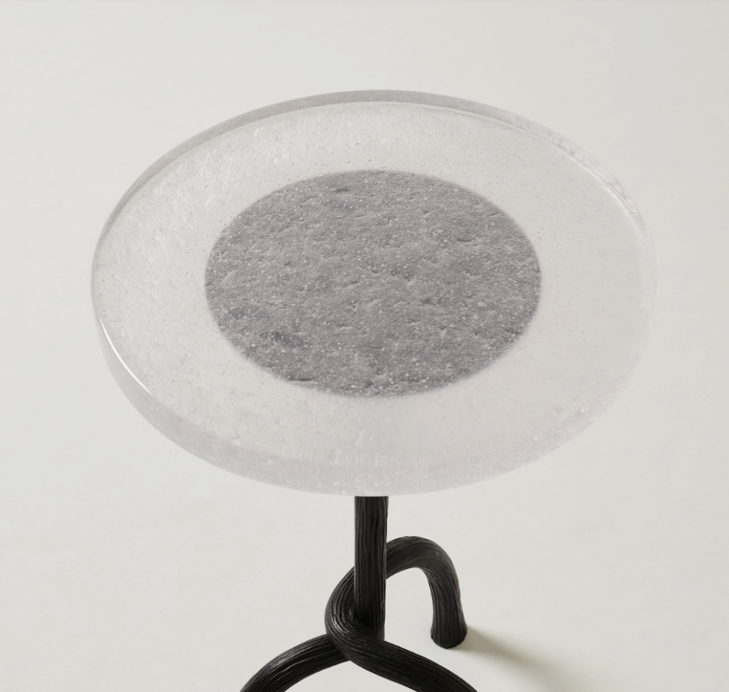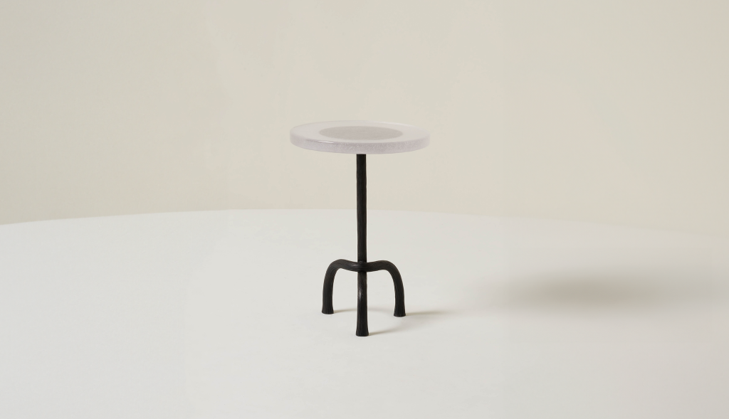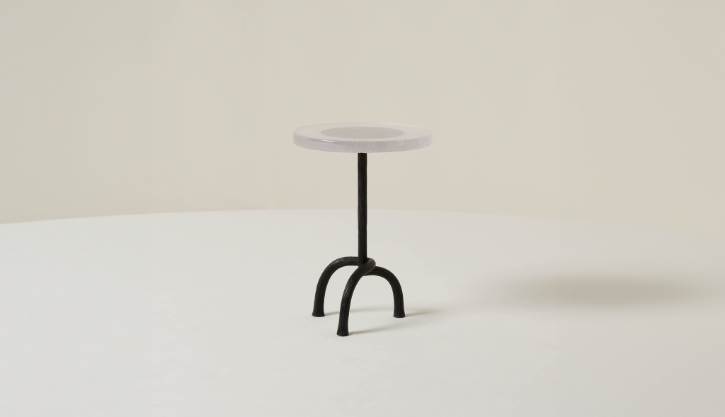 HAND-CARVED CAST BRONZE SIDE TABLE WITH A CAST GLASS TABLE TOP.