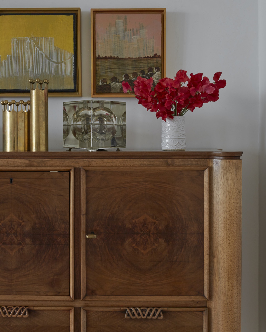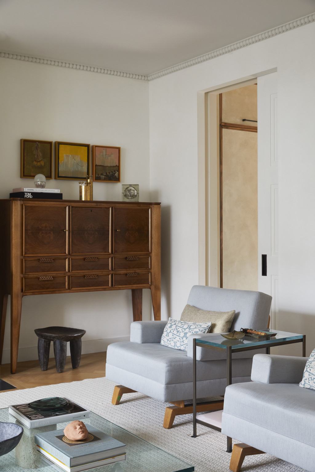 The flow of the house was carefully plotted to maximise light throughout. On the ground floor, crittal doors in the kitchen open onto a lush walled garden, allowing sunlight to illuminate a set of Josef Frank for Svenskt Tenn dining chairs upholstered in his iconic verdant fabrics. Outstanding examples of rare lighting fixtures include a vintage 1940s industrial pendant, an antique Carlo Scarpa glass pendant and an important Fontana Arte, Max Ingrand chandelier.