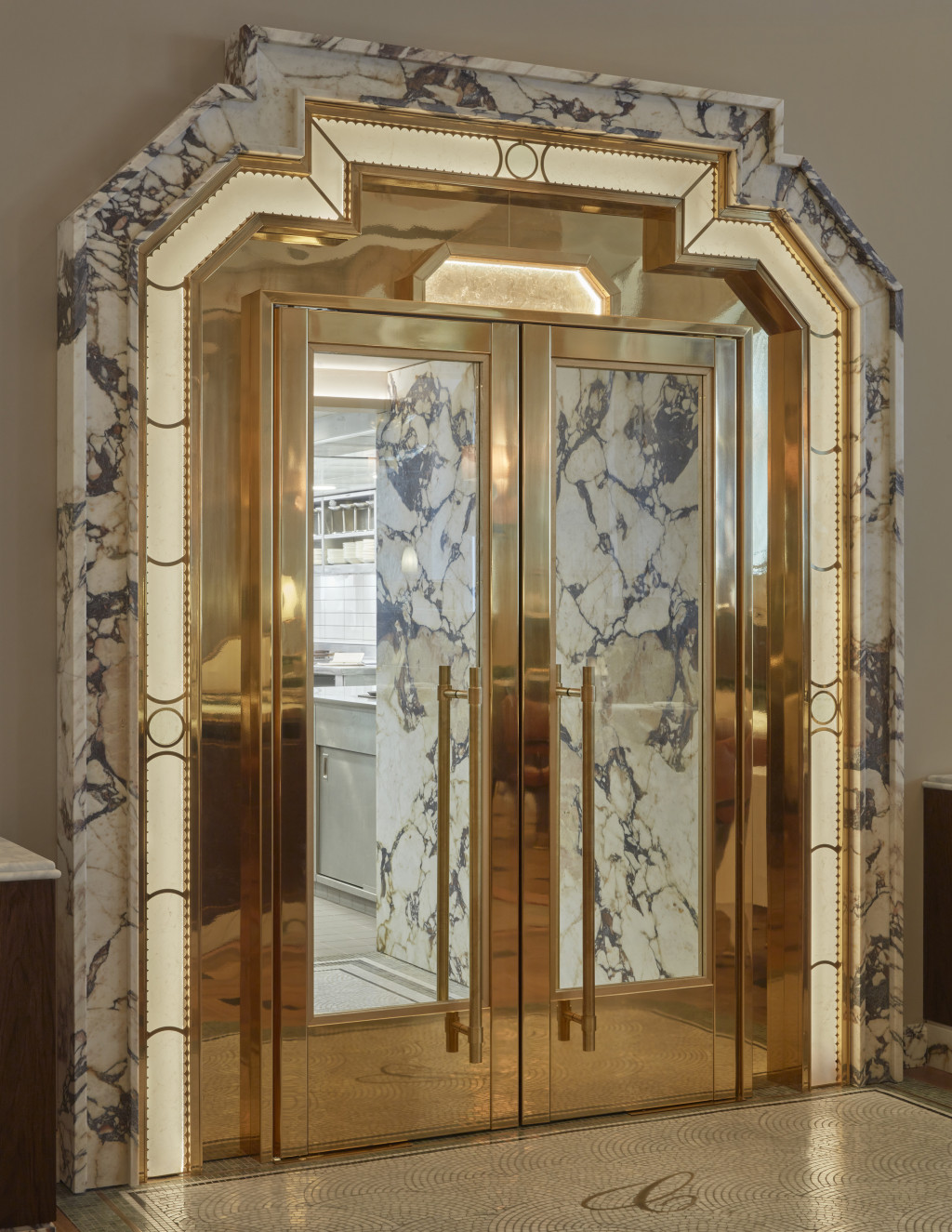 Contemporary Art Deco influences have been infused throughout the restaurant, from the bespoke carpet and mosaic tile floors to custom furniture and rich material choices. Geometric patterns, bold colours, and nods to the classic hotel design appear in fabrics, timber flooring, and mirrored surfaces. Key features include a dramatic kitchen door framed with antique brass, coloured glass, and Calacatta Viola marble, and central banquette seating that balances intimacy with visual access to the design.