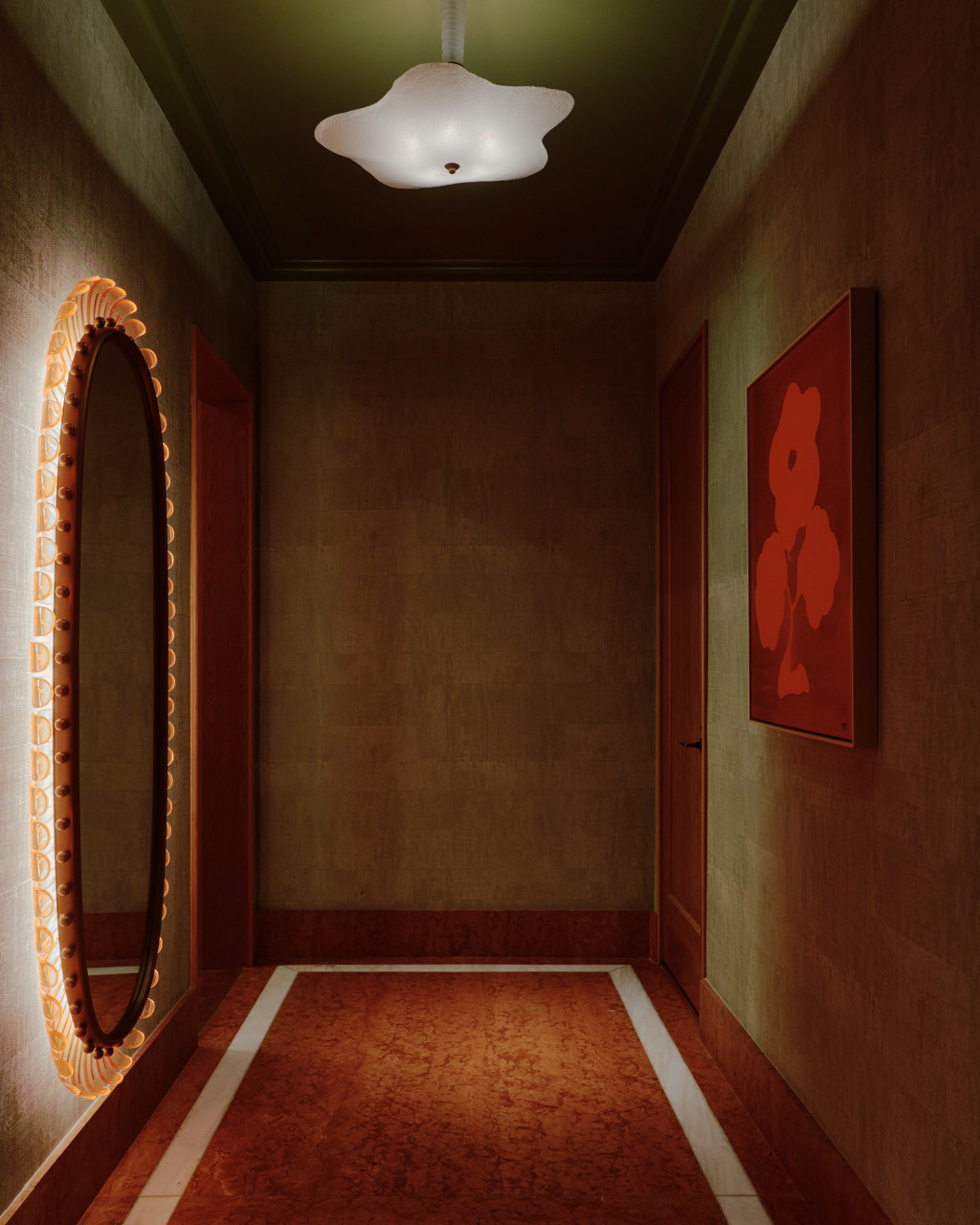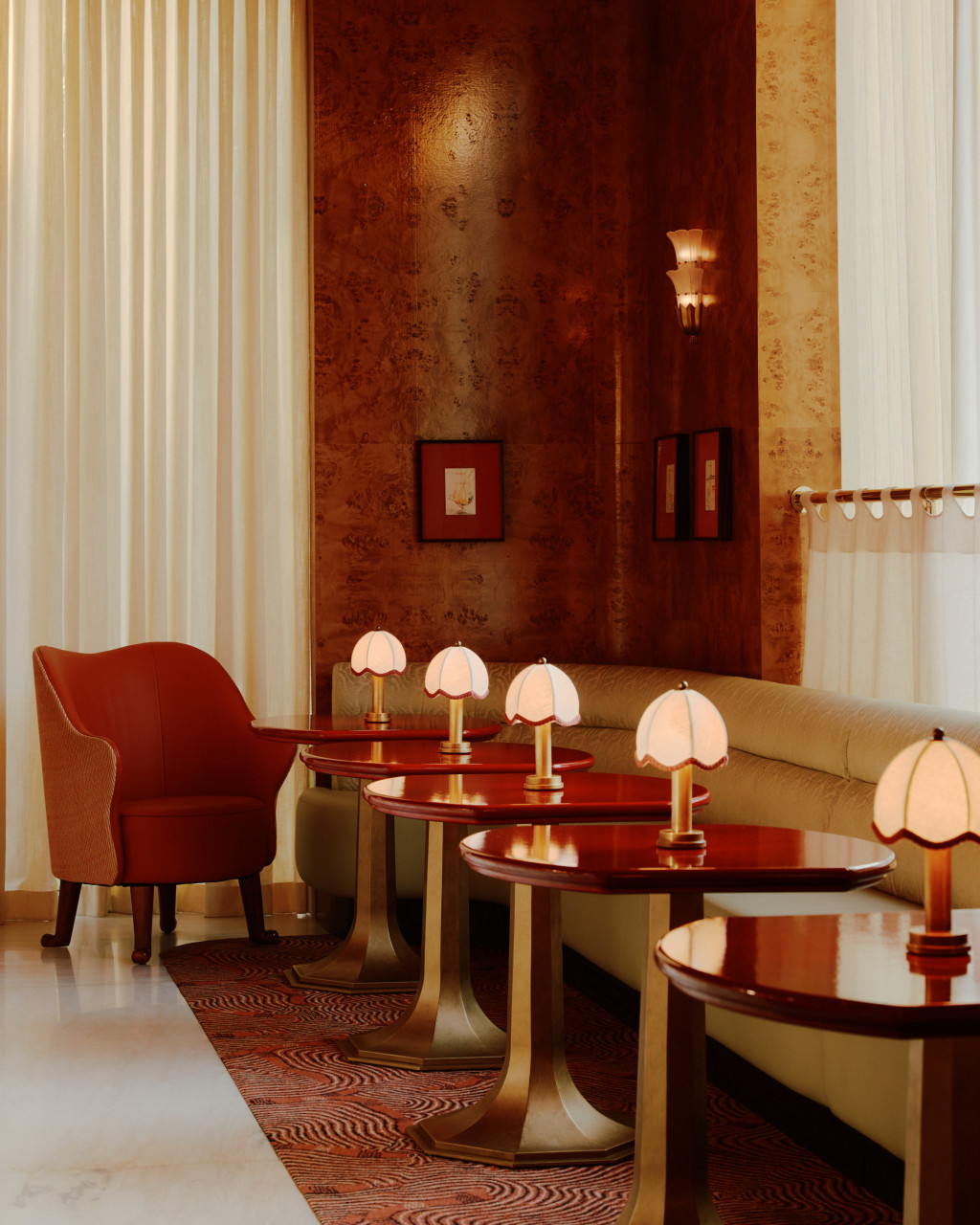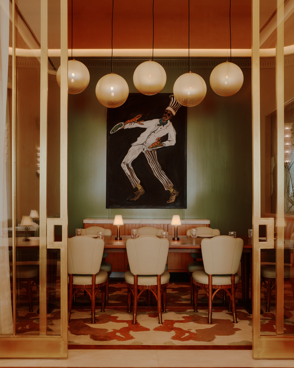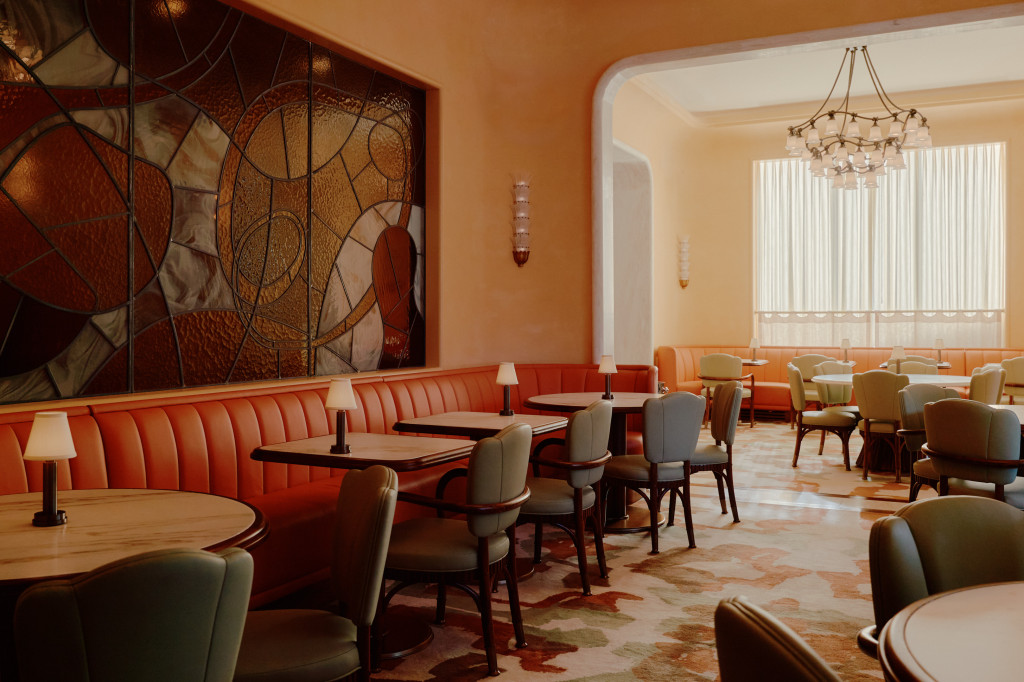 Mamani, one of Dallas’s first Michelin-starred restaurants, anchors the new Quad development in Uptown. The brief called for a contemporary, elevated setting with subtle gestures to the French traditions behind the cuisine. The main dining room is organised around an open kitchen, where glazed lavastone, unlacquered brass, and textured glass highlight the work of the chef’s team. Polished oak seating, Venice Gold marble tables, and peach-toned leather establish a warm palette, complemented by Marmorino plaster, end-grain flooring, and tiered chandeliers. A private dining room in deep green panelling offers a more intimate atmosphere. The bar reads as a jewel-box, with burl-wood panelling, a green onyx counter, and artwork by Sam Wood. An enclosed patio extends the restaurant with Mediterranean influences - lush perimeter planting, custom green latticework, gesso chandeliers, and light-toned furnishings. The restrooms continue the material richness, pairing Rosso Verona marble with green and peach plaster and centring on a large backlit bespoke mirror.