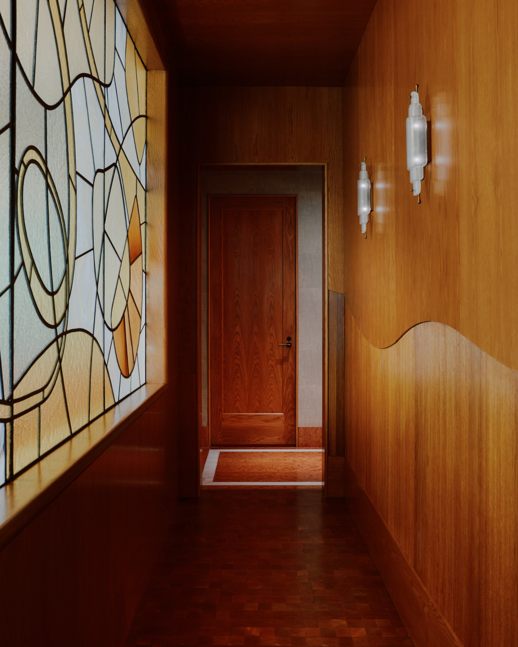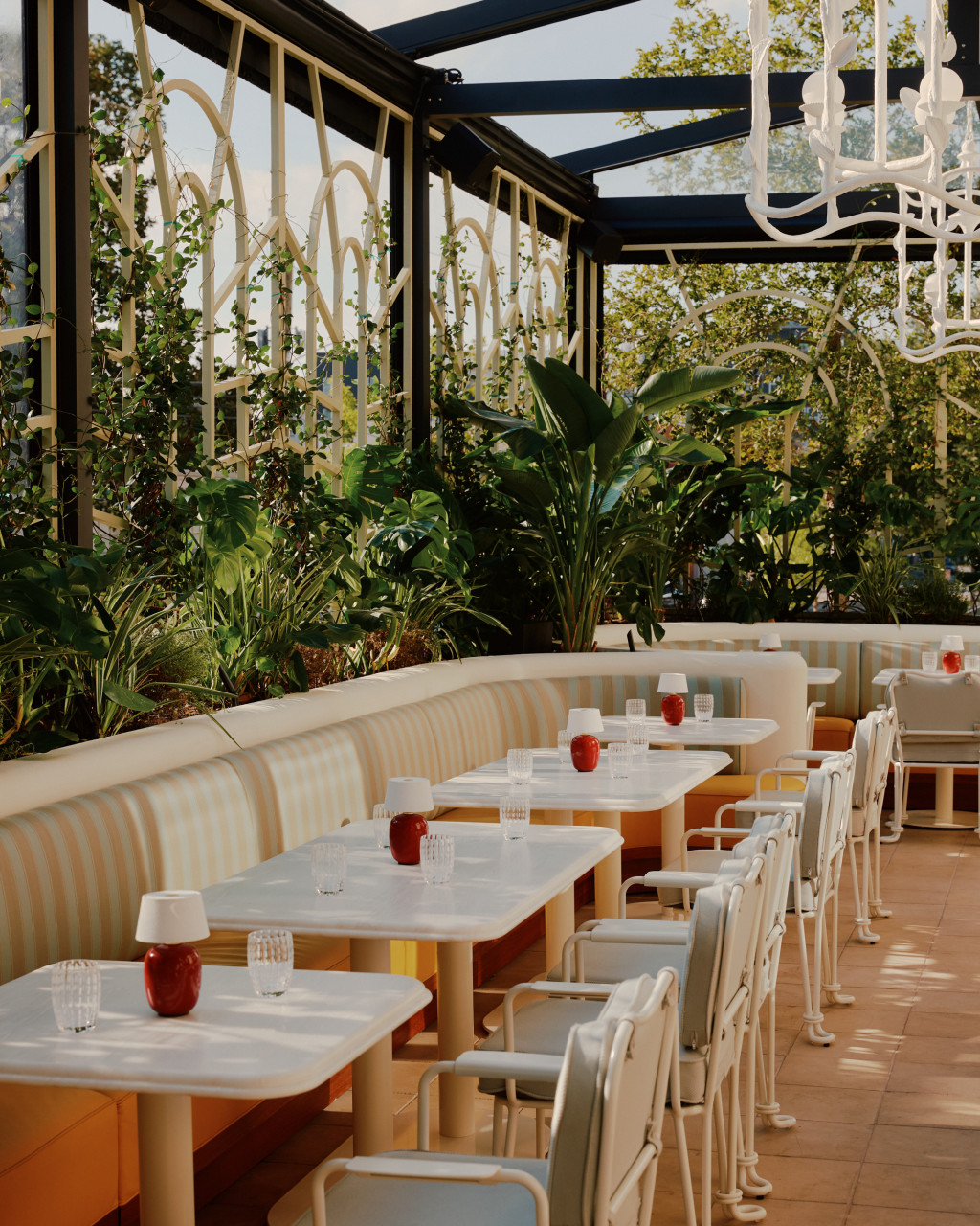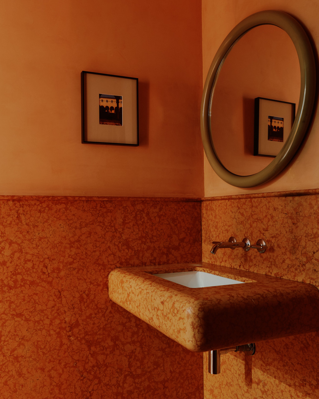 Mamani, one of Dallas’s first Michelin-starred restaurants, anchors the new Quad development in Uptown. The brief called for a contemporary, elevated setting with subtle gestures to the French traditions behind the cuisine. The main dining room is organised around an open kitchen, where glazed lavastone, unlacquered brass, and textured glass highlight the work of the chef’s team. Polished oak seating, Venice Gold marble tables, and peach-toned leather establish a warm palette, complemented by Marmorino plaster, end-grain flooring, and tiered chandeliers. A private dining room in deep green panelling offers a more intimate atmosphere. The bar reads as a jewel-box, with burl-wood panelling, a green onyx counter, and artwork by Sam Wood. An enclosed patio extends the restaurant with Mediterranean influences - lush perimeter planting, custom green latticework, gesso chandeliers, and light-toned furnishings. The restrooms continue the material richness, pairing Rosso Verona marble with green and peach plaster and centring on a large backlit bespoke mirror.