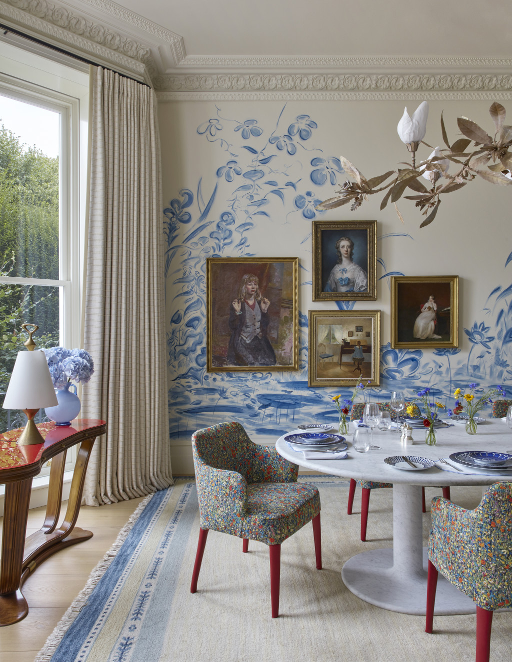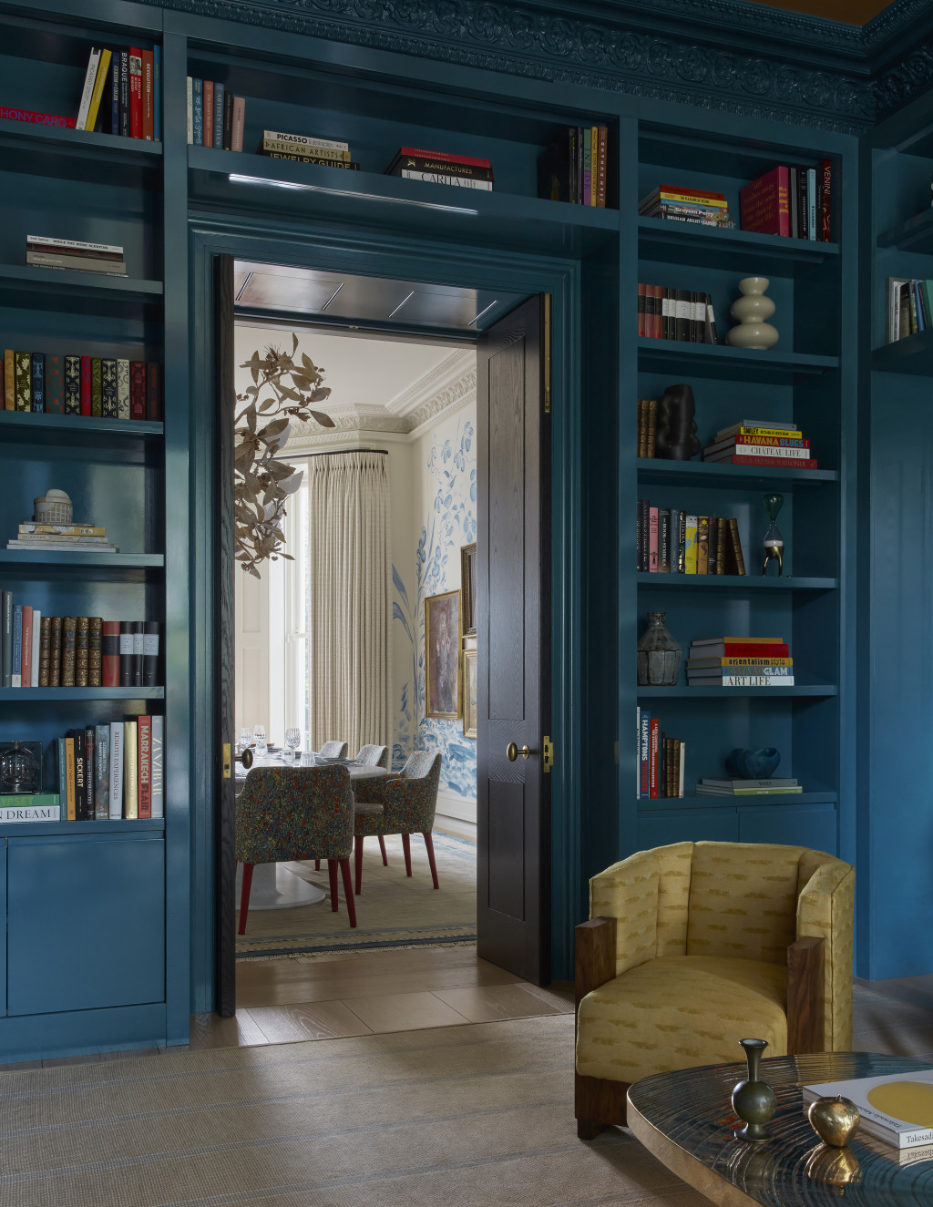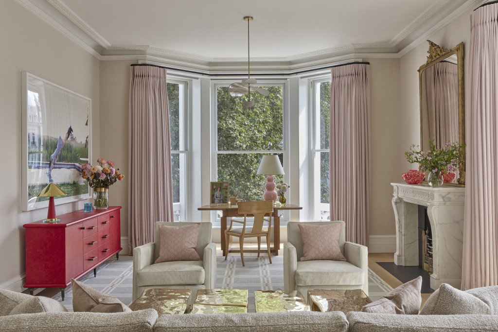 This Grade II-listed, eight-level townhouse in Notting Hill - originally built in the mid-19th century - was transformed from a slick bachelor pad into a warm, welcoming family home. While the floor plan remained largely unchanged, the focus was on revamping finishes, materials, and textures to create a more inviting, playful atmosphere.