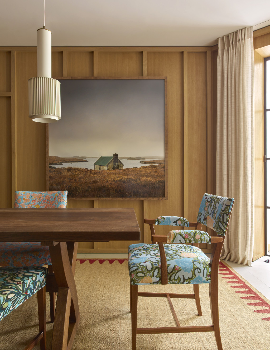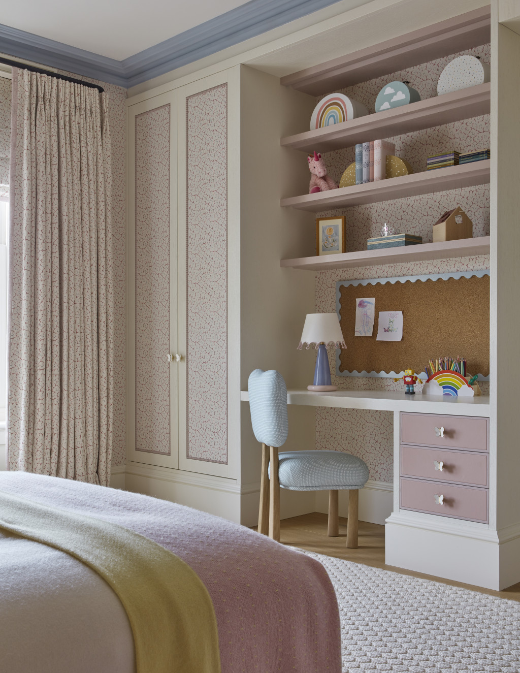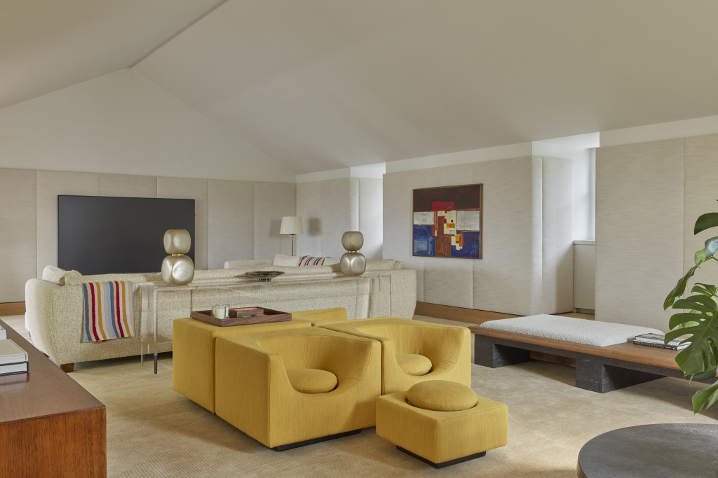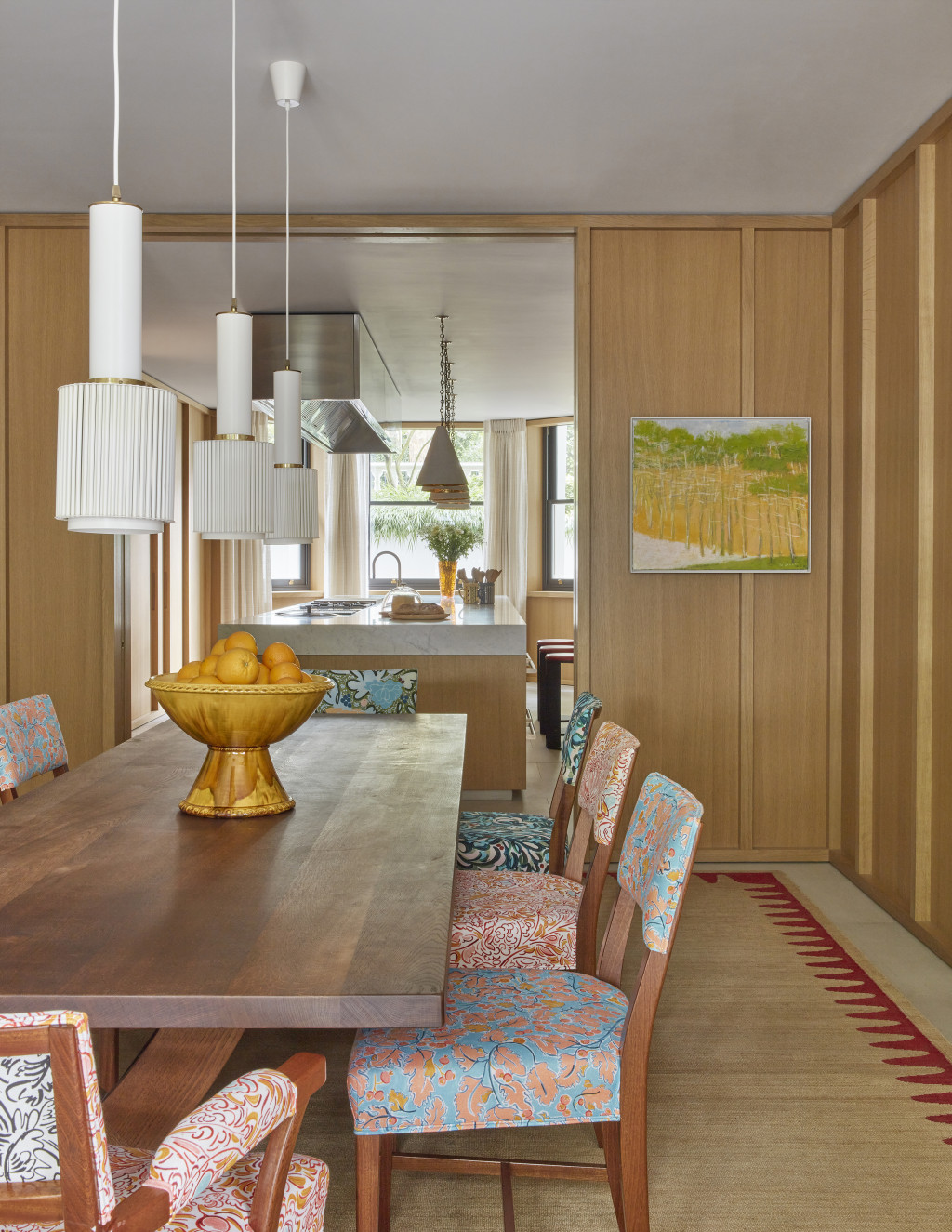 This Grade II-listed, eight-level townhouse in Notting Hill - originally built in the mid-19th century - was transformed from a slick bachelor pad into a warm, welcoming family home. While the floor plan remained largely unchanged, the focus was on revamping finishes, materials, and textures to create a more inviting, playful atmosphere.