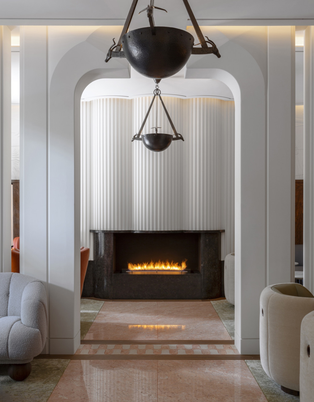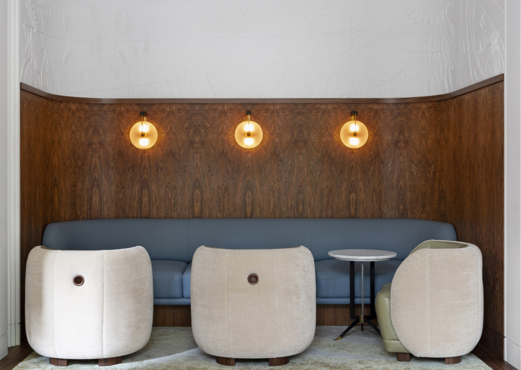 The Berkeley Bar & Terrace key features include a half-moon marble bar, a central fireplace and The Snug. The central material in the design story is an exquisite walnut wood, taken from a 300-year-old tree felled from the Fulbeck Estate in Lincolnshire. The delicate finish of the timber brings out the depth and intricacy of the figuring, the panels of which are used throughout the bar to cocoon the whole space, while a colour palette of soft corals, creams and pinks offset its richness. The story of the tree and the Fulbeck Estate have also been romantically depicted by the most expert craftsman in a plasterwork frieze which runs above the wood panels.