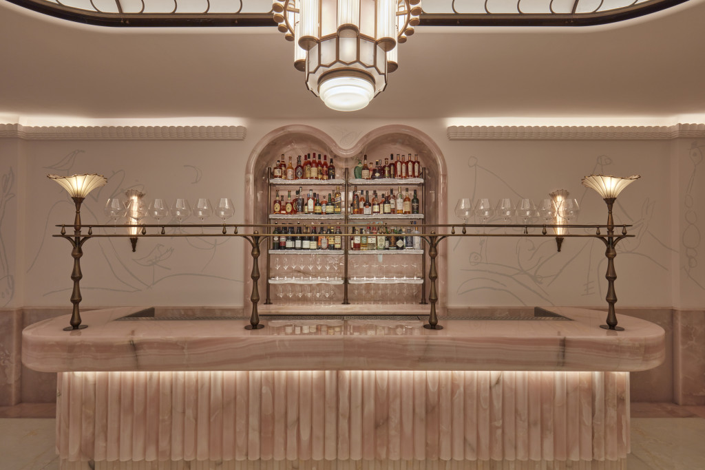 Claridge’s has a very rich history which the studio referenced throughout in the detailing, from the central skylight to the scalloped ceiling. As the space is relatively small, we focussed on an uplifting palette of soft shades. The pink fluted marble bar takes centre stage, flanked by green onyx panels on the walls.